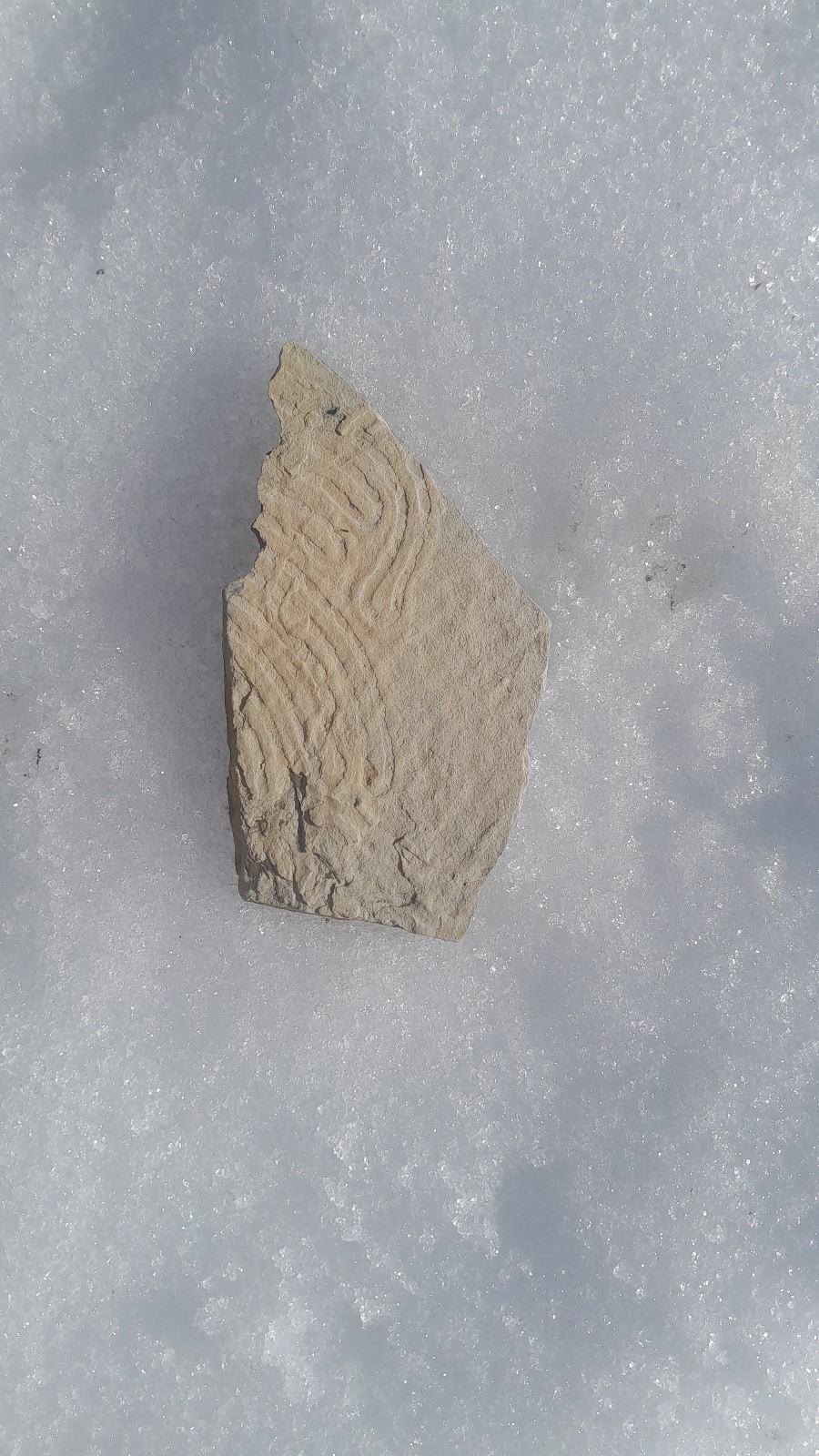 Au sommet, sur un caillou que le vent a sculpté à l’économie, on tombe nez à nez avec un ancien. Un vrai. Un tatoué! Fossile d’helminthoïde, dormant là depuis la grande époque. Le Paléogène, rien que ça.