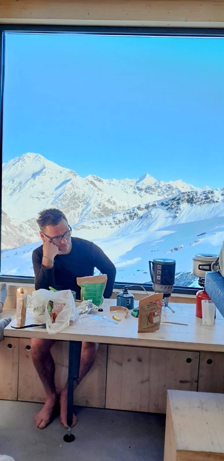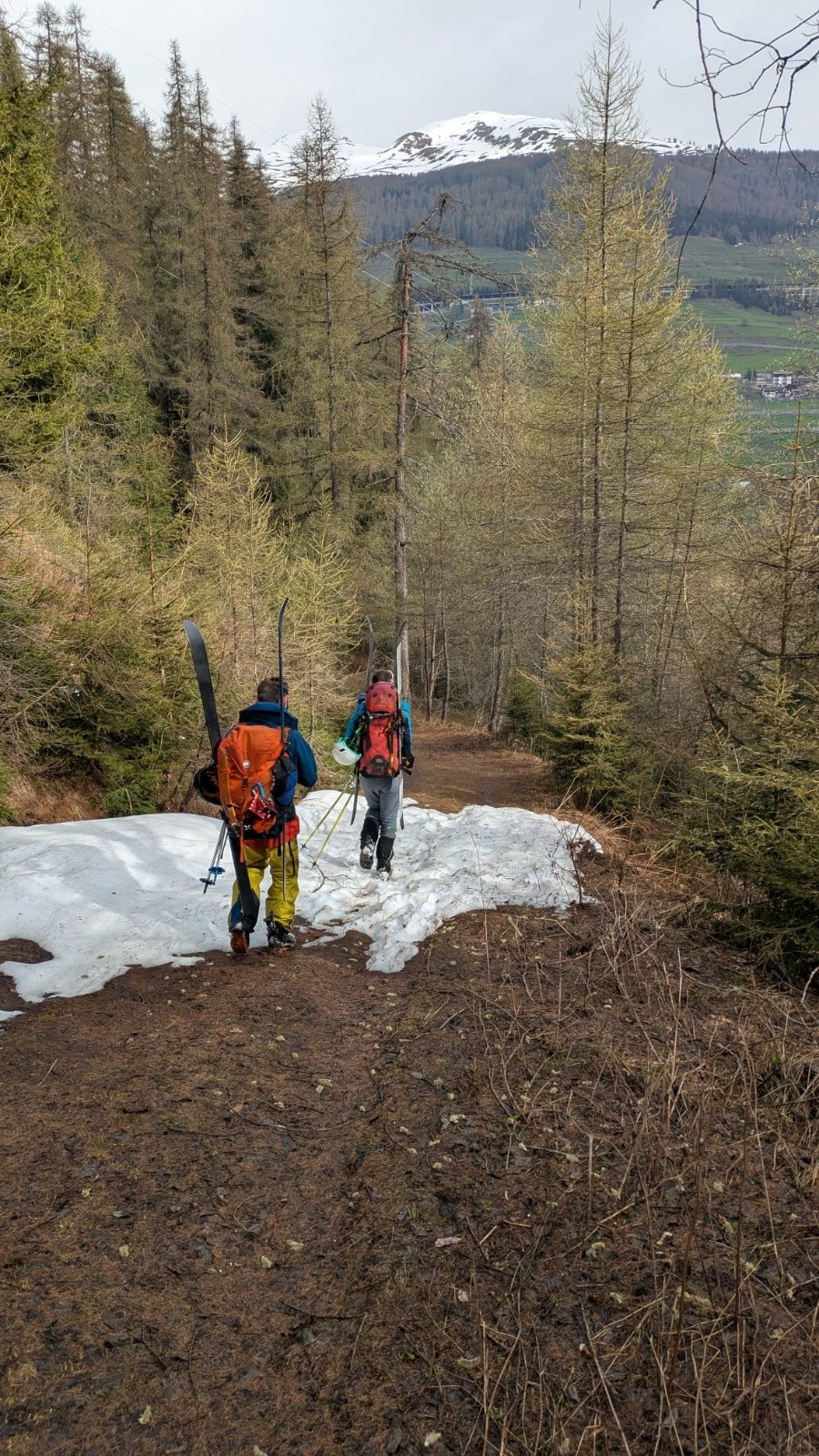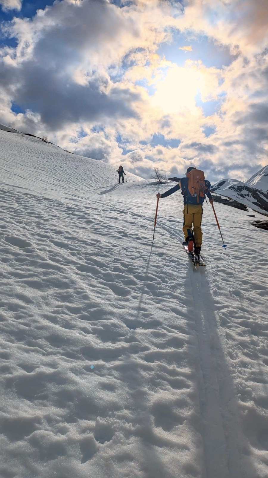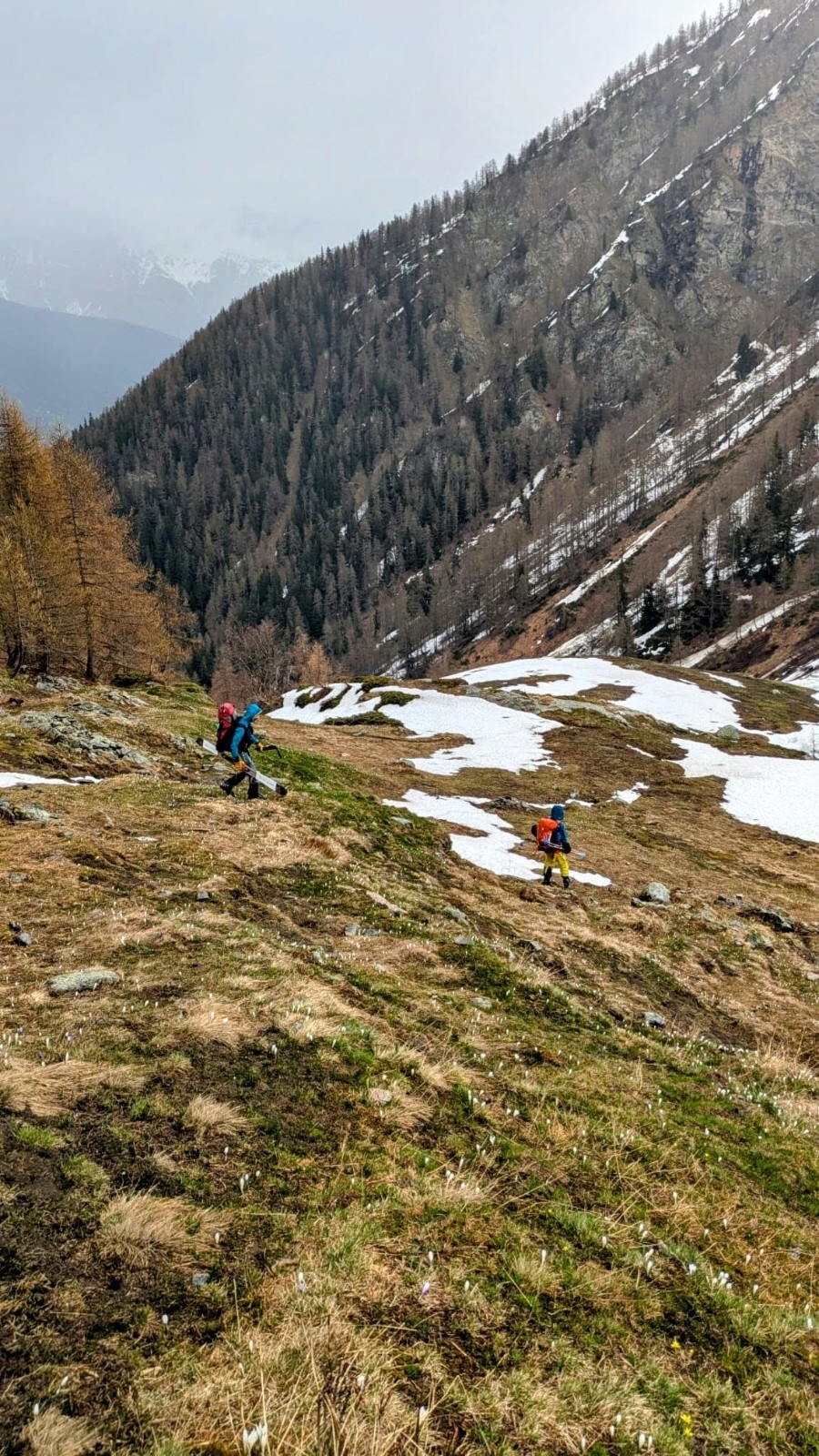 Le milieu de la nuit arrive avec la pluie . A 7h nous nous préparons gentiment et partons vers 8 h après avoir nettoyé les lieux. L'idée de boucler par le couloir nord ouest des crêtes de Corléas s'évapore en même temps que nos illusions de faire du bon ski aujourd'hui, nous repasserons donc par notre itinéraire de montée. il ne pleut plus mais la pluie nous rattrape au col de citrin, légère et presque agréable. Au final, ce n'est pas pire on fait de beaux virages. Vers 1800 nous déchaussons et remettons les skis sur le sac pour reprendre le chemin d'été sous un ciel cotonneux.