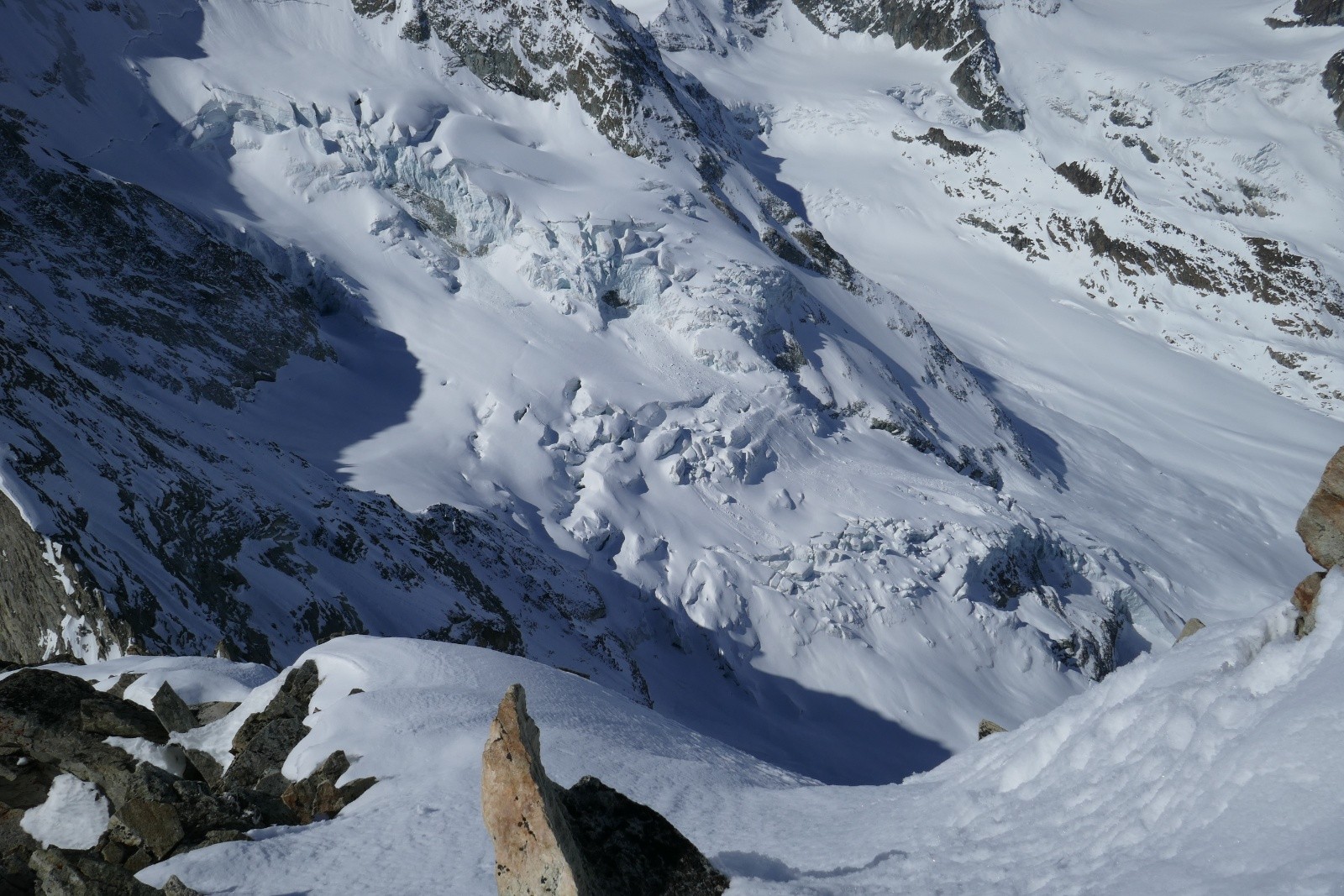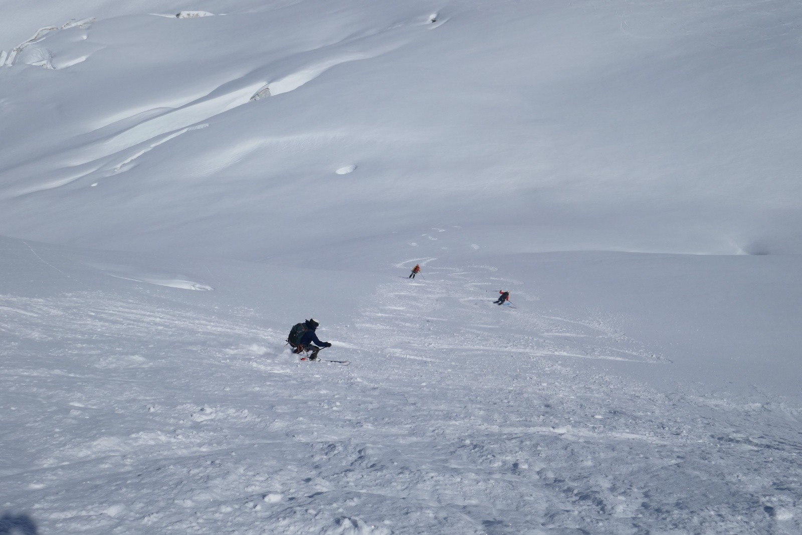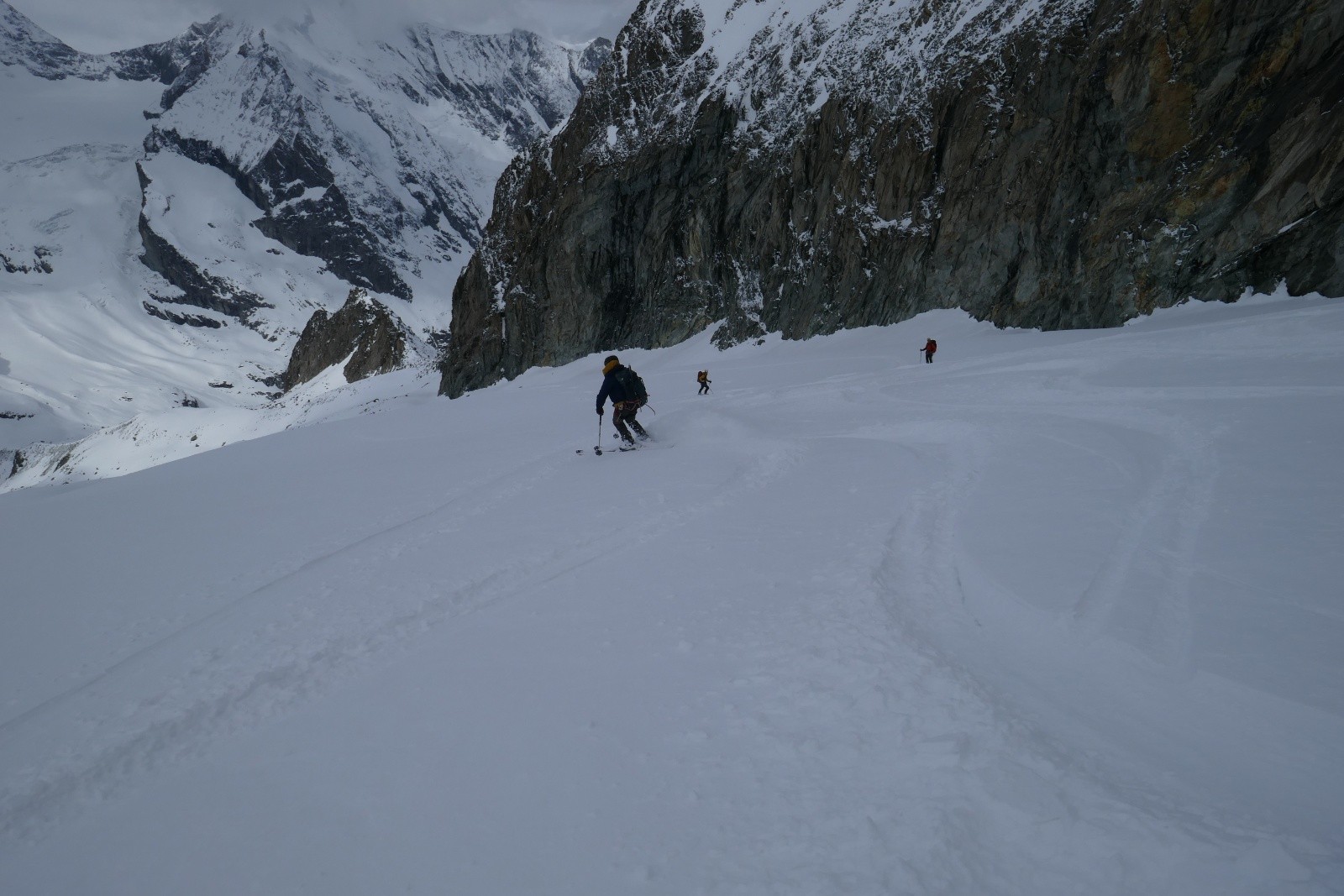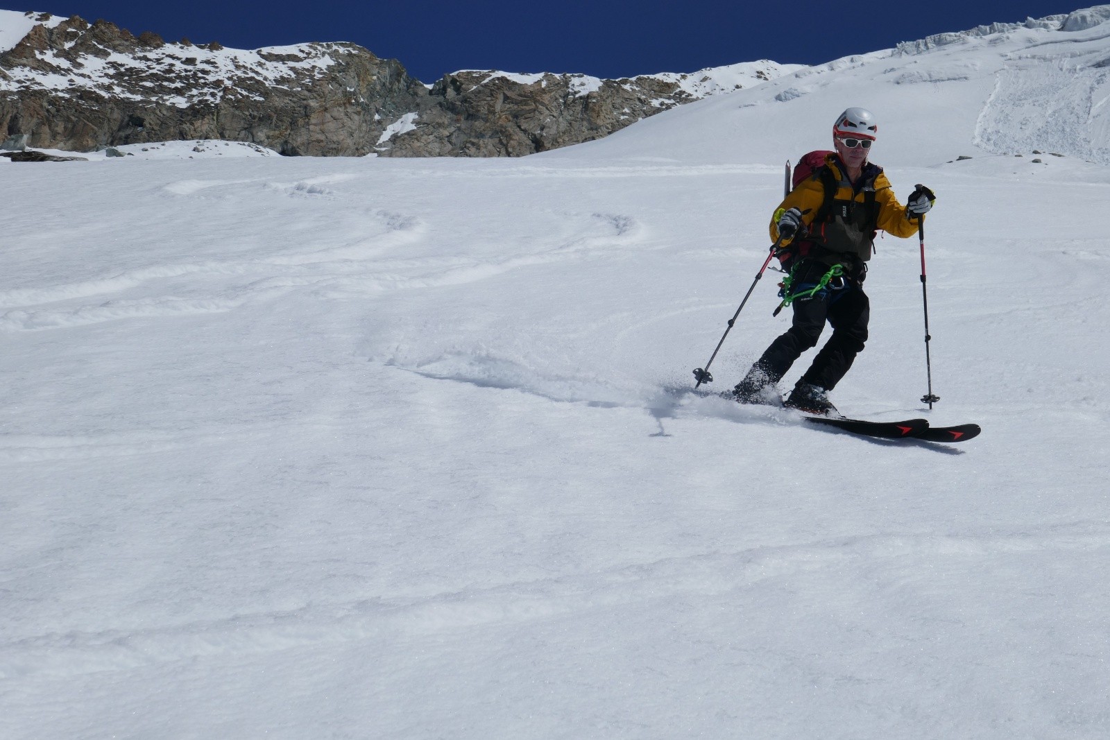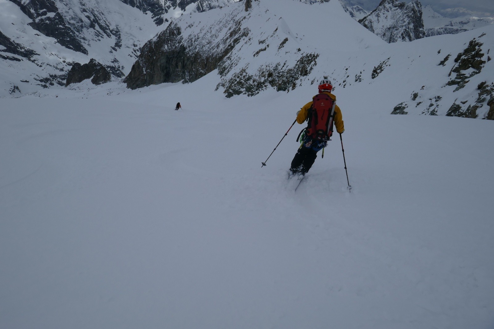 Bonne descente en neige poudreuse sur le glacier du Mountet puis collante sur le glacier de Zinal.