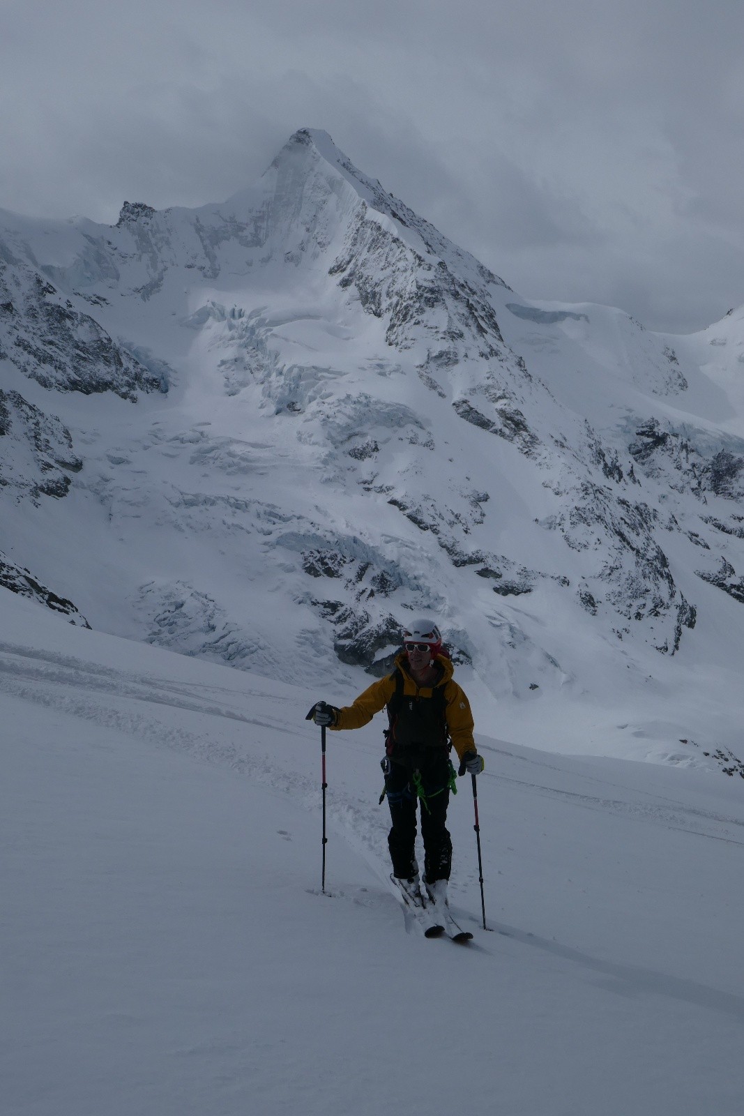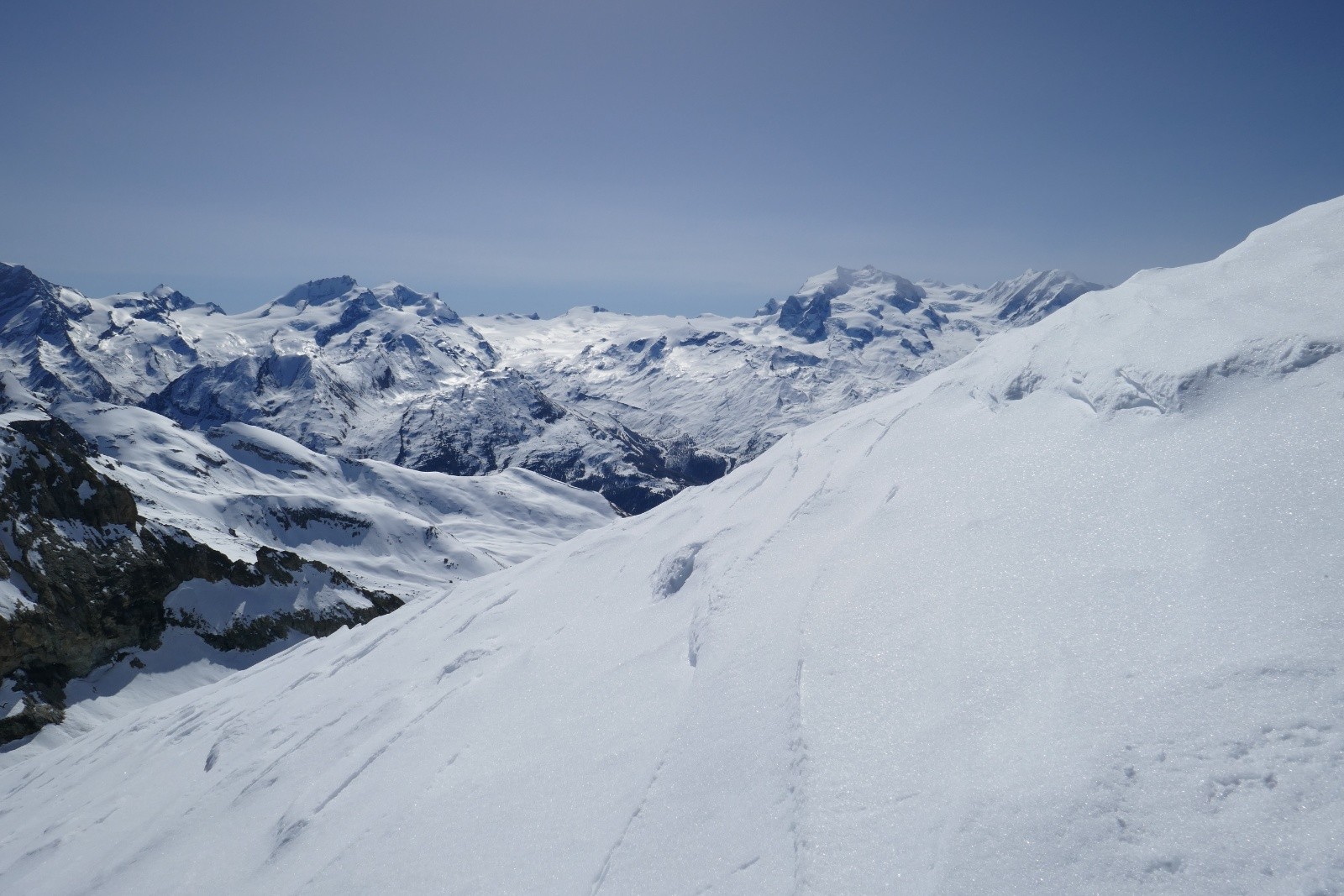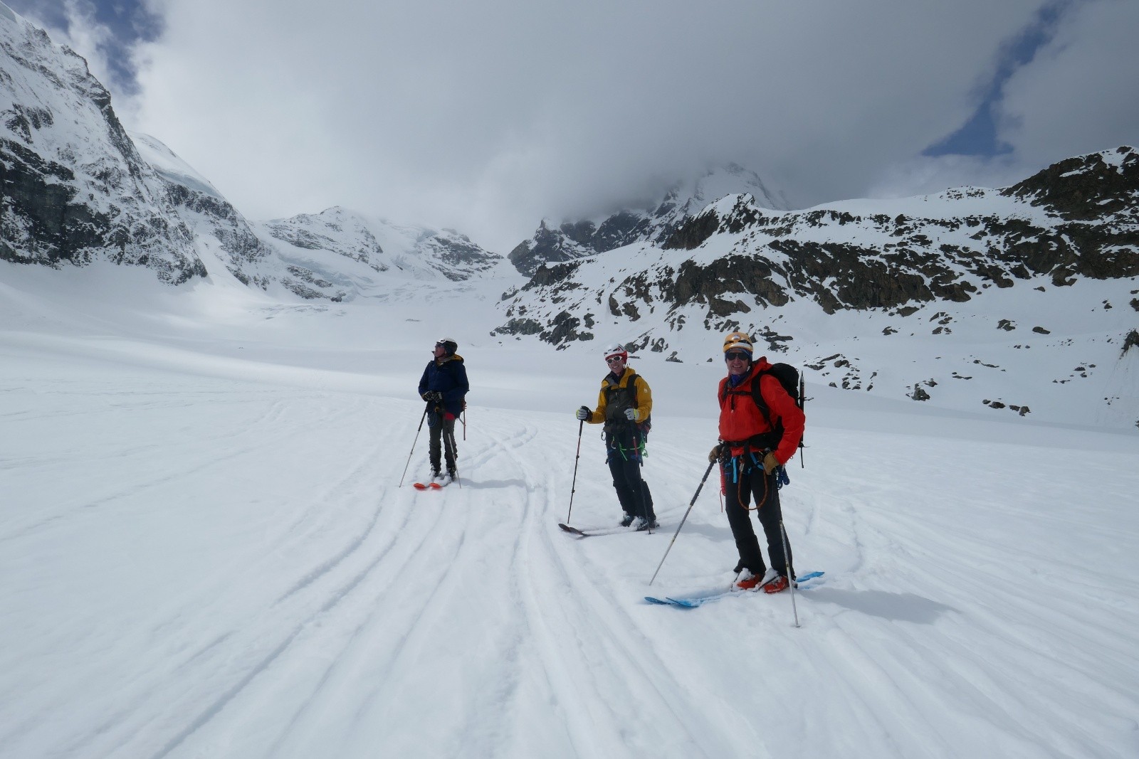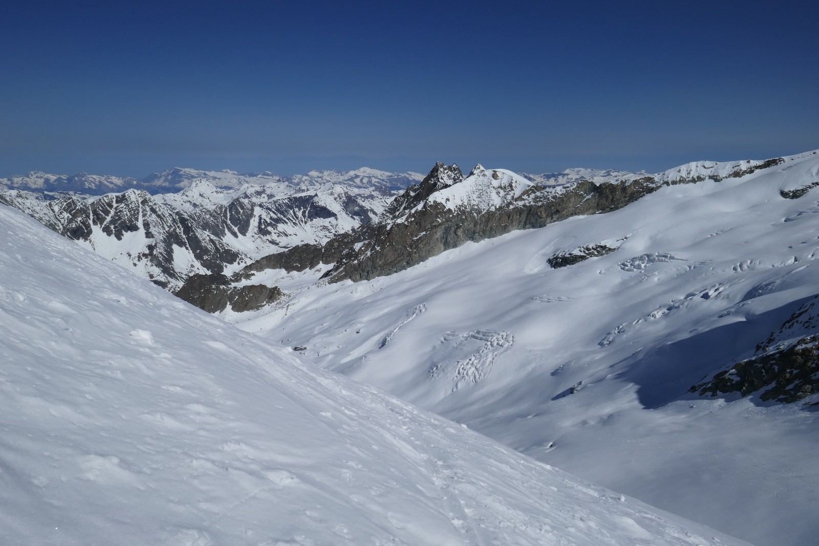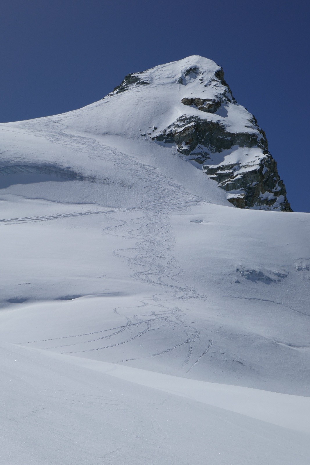 Bonne descente en neige poudreuse sur le glacier du Mountet puis collante sur le glacier de Zinal.