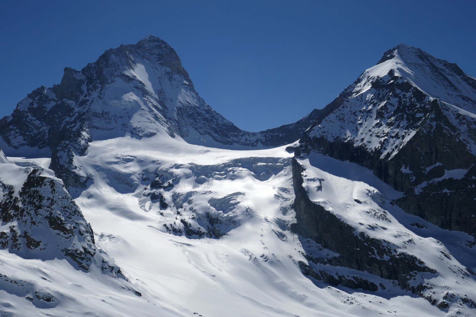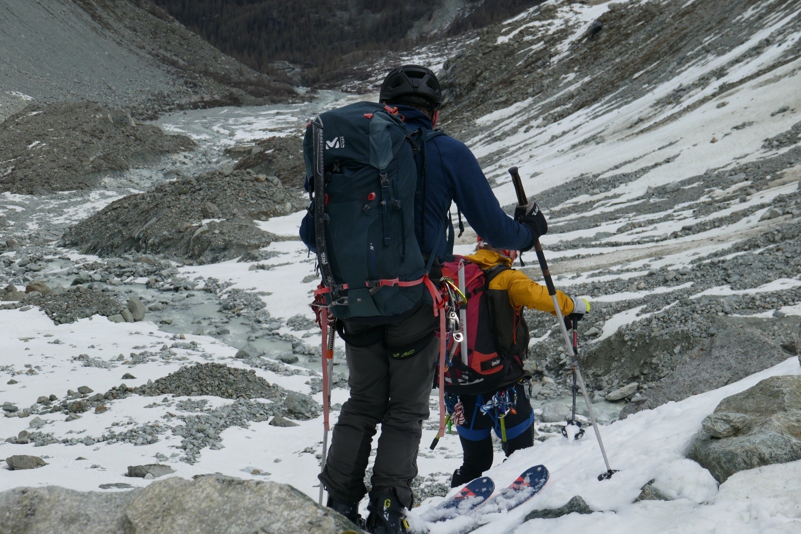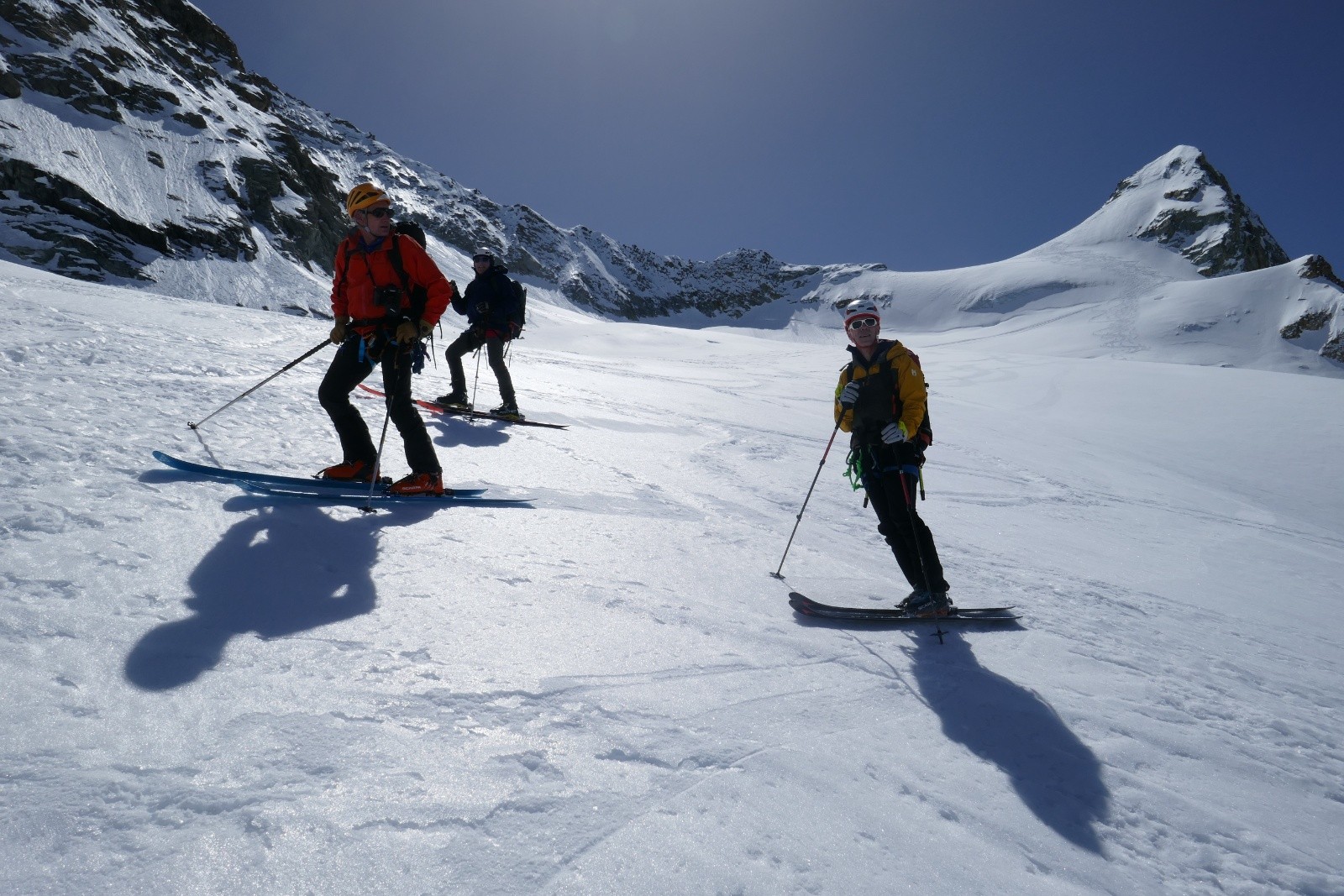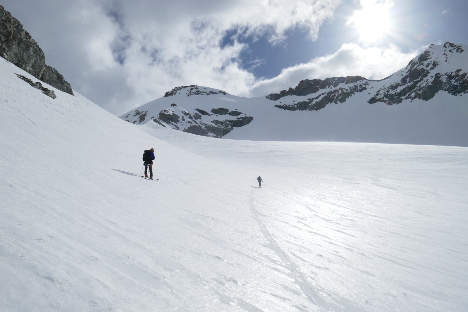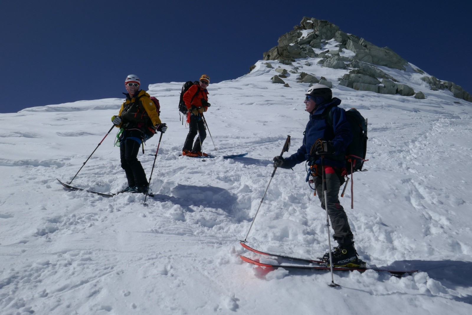Encore une magnifique journée. Courte descente en neige dure avant de prendre pied sur le glacier du Mountet.
