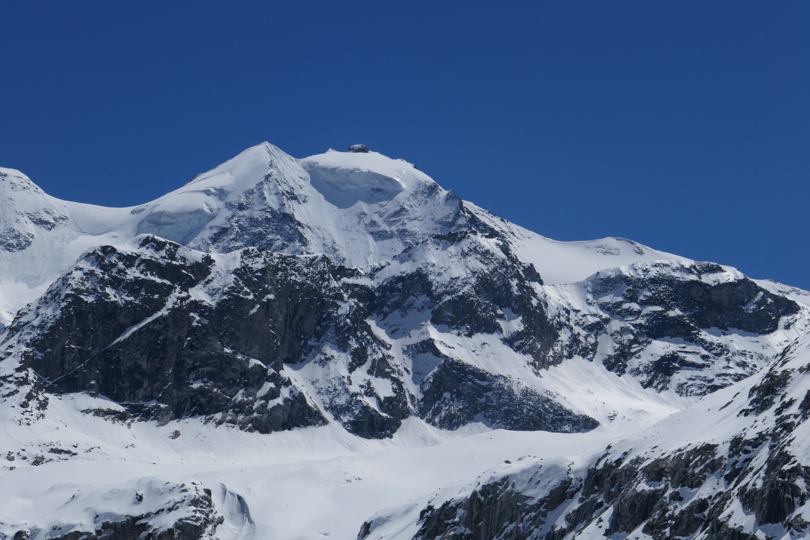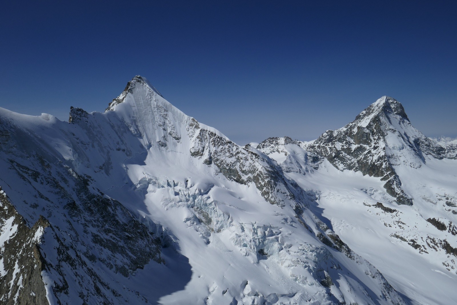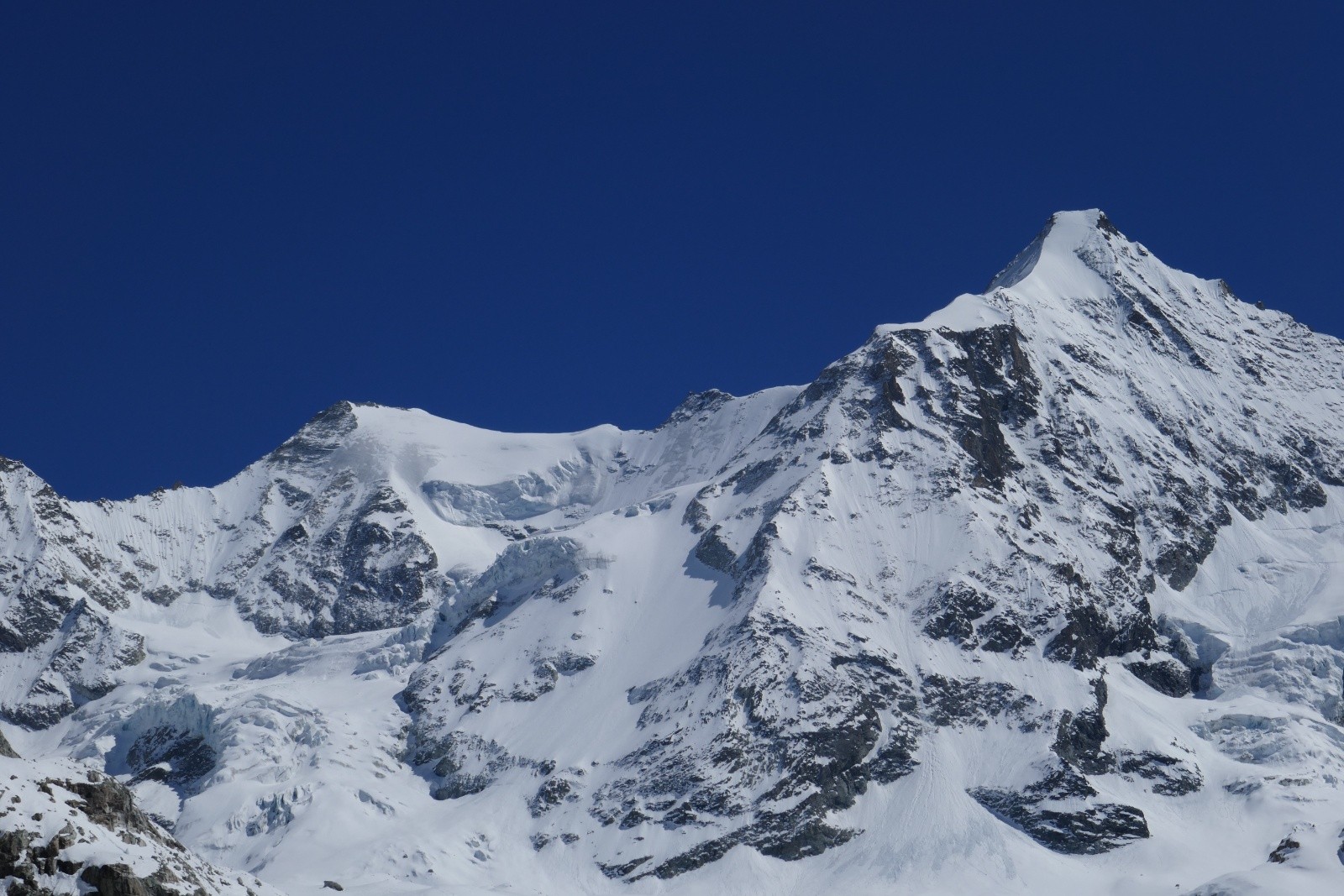 La vue est grandiose avec l'Ober Gabelhorn en premier plan, les 4000 de Saas Fee et le Mont Rose.