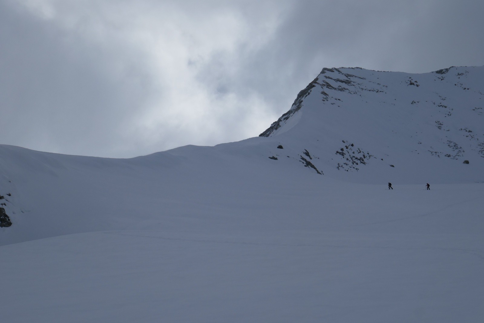 Dépot des skis au col du Mountet et final à pied avec crampons et piolet sur une neige bien portante (et déjà tracée!).