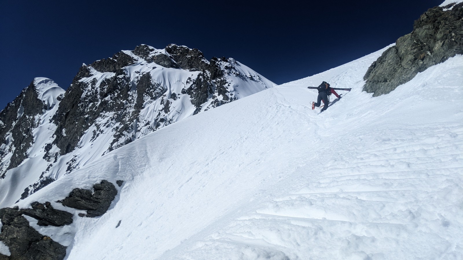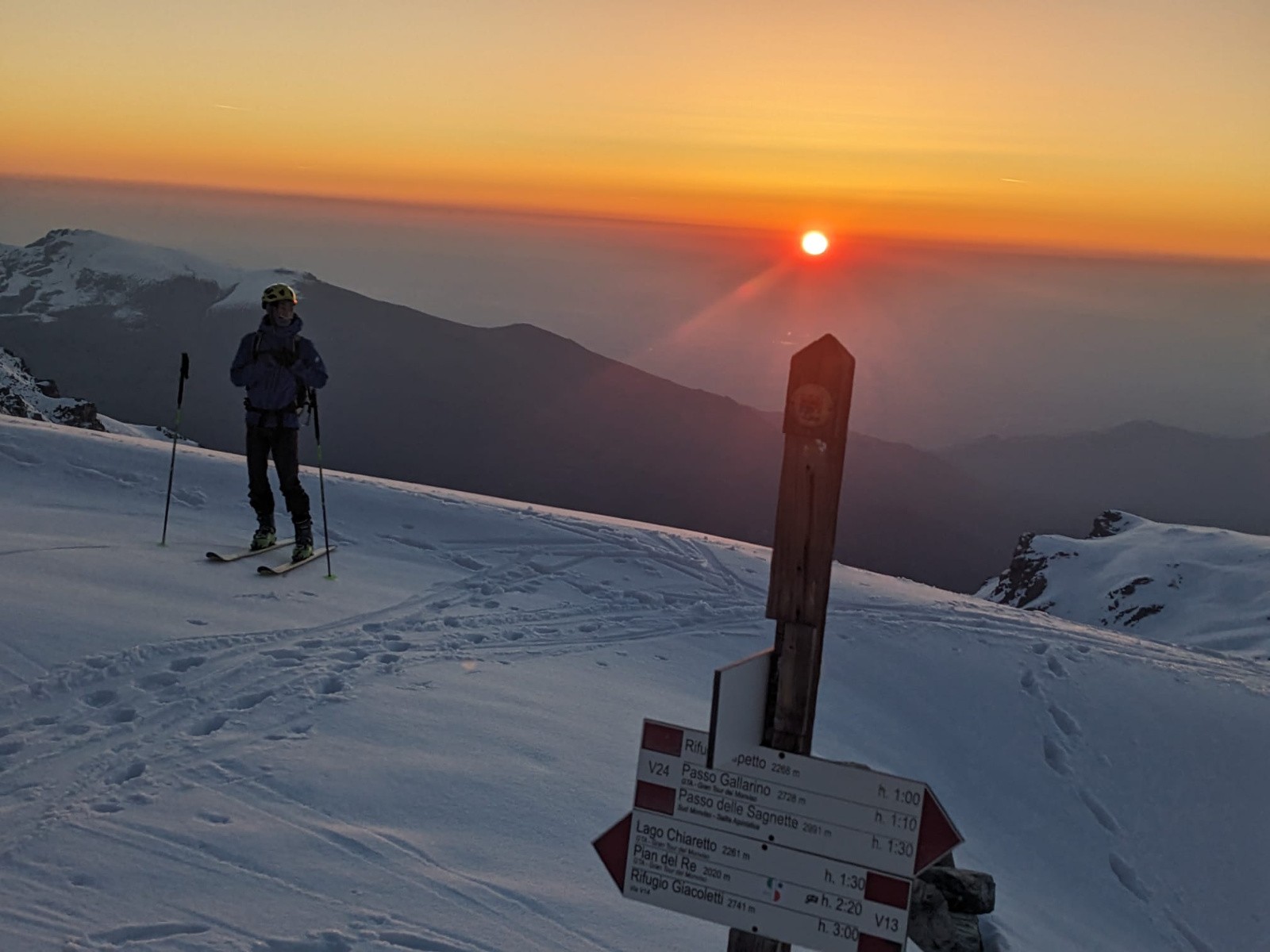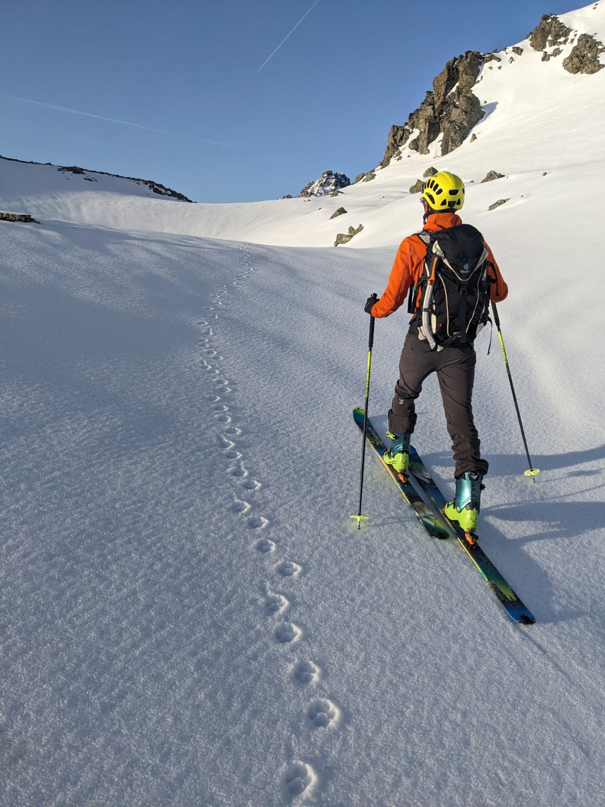 au bon moment, la neige étant revenue comme il faut (il aurait pas fallu passer 1h plus tard). Pas mal de monde côté italien qui se ballade à la journée. On était seul à Quintino Sella, lever de soleil somptueux sur la plaine du Pô. Côté Vallante, la remontée de la vallée est longue à pied (chaussage à 2300) au milieu des bouquetins et des marmottes. On est cuit au pied de la pointe Joanne, heureusement on croise deux skieur.es qui nous emmène au sommet et nous ravitaille un peu. Descente somptueuse en face nord ouest et ensuite y a plus qu'à rentrer au camion !