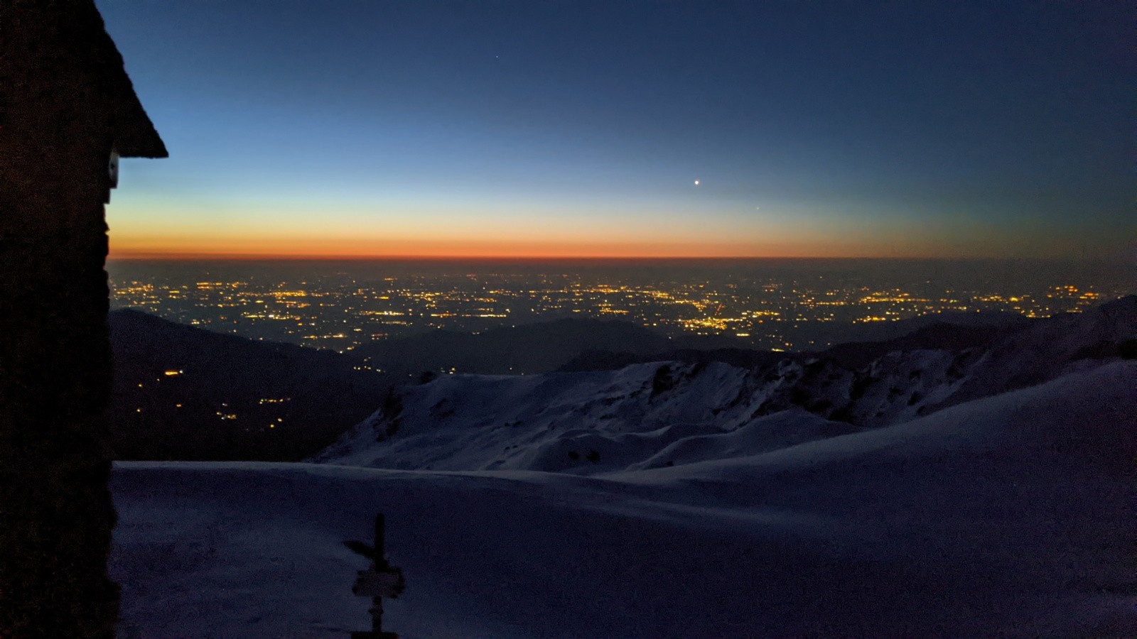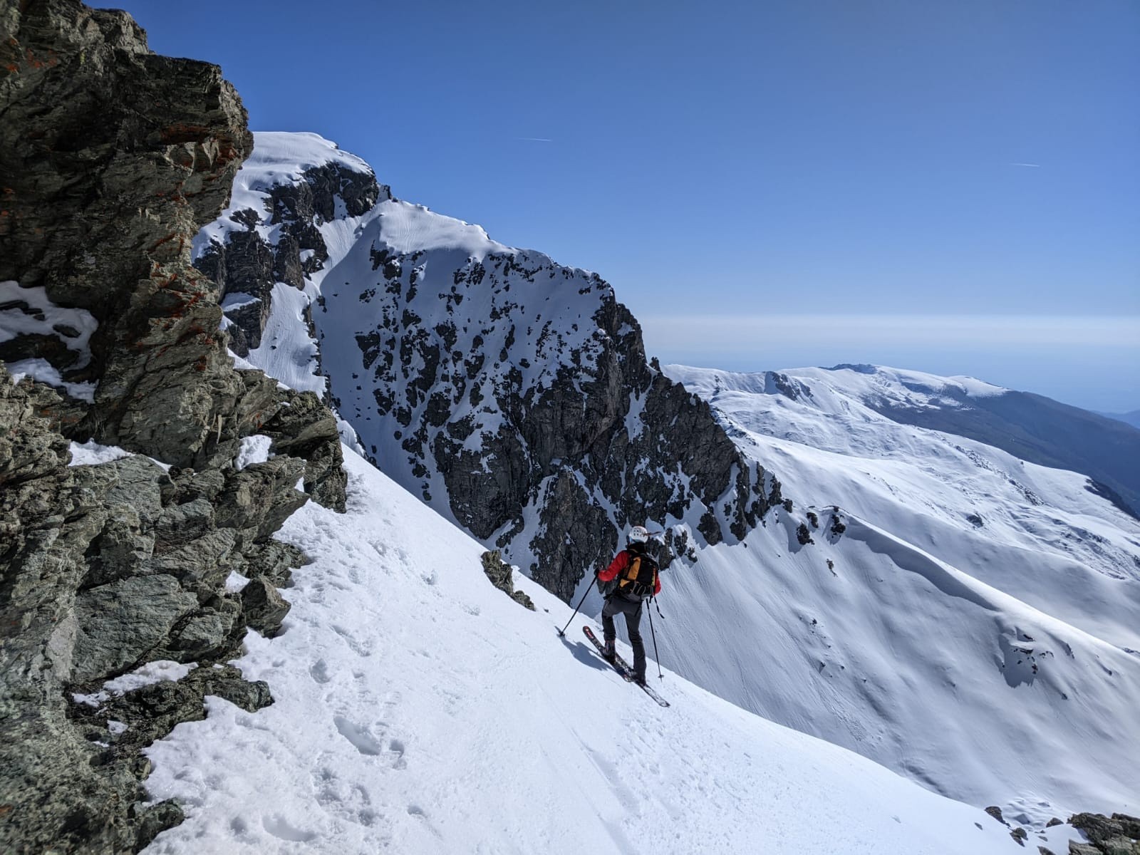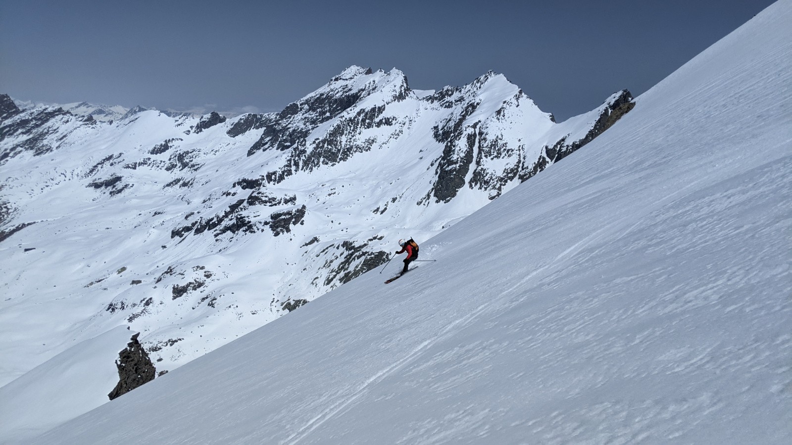 au bon moment, la neige étant revenue comme il faut (il aurait pas fallu passer 1h plus tard). Pas mal de monde côté italien qui se ballade à la journée. On était seul à Quintino Sella, lever de soleil somptueux sur la plaine du Pô. Côté Vallante, la remontée de la vallée est longue à pied (chaussage à 2300) au milieu des bouquetins et des marmottes. On est cuit au pied de la pointe Joanne, heureusement on croise deux skieur.es qui nous emmène au sommet et nous ravitaille un peu. Descente somptueuse en face nord ouest et ensuite y a plus qu'à rentrer au camion !