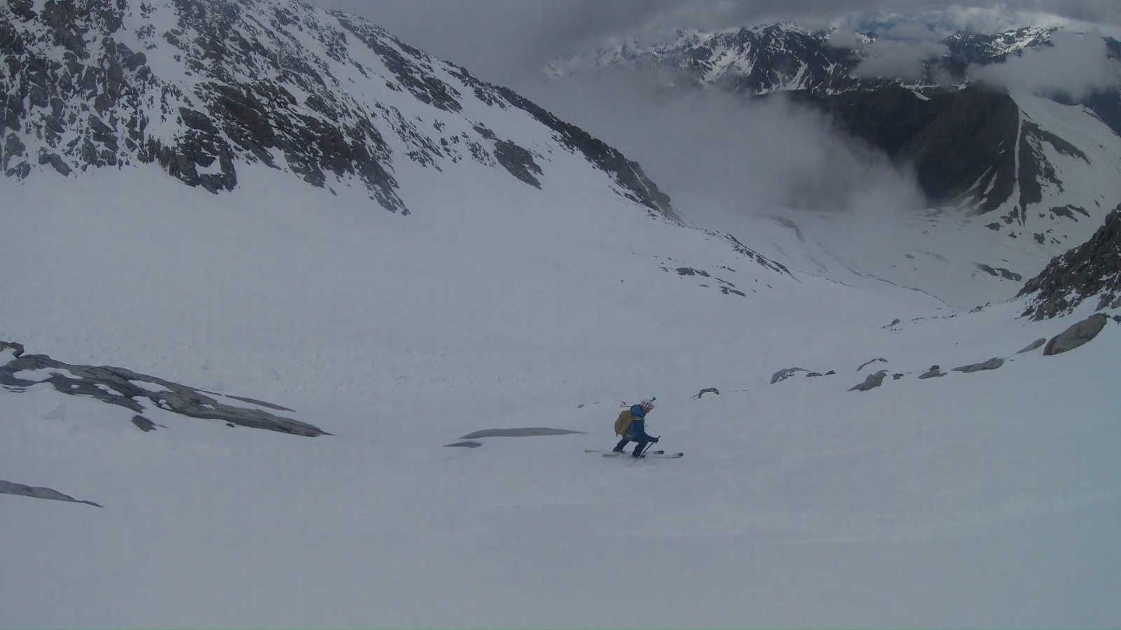 De l'autre coté c'est tout bâché, on ne voit pas grand chose. Par contre je vois que le sommet est juste à coté, il ne reste même pas 100m. Comme on n'était pas en avance je n'y suis pas allé. Dommage je n'avais pas calculé que j'avais le temps puisque Aymeric devait descendre à pied. Pas grave ce sera pour une prochaine fois, je chausse les skis et c'est parti pour la descente. De plus bas j'avais repéré un passage qui paraissait en meilleure neige un peu plus en rive droite. Je vais regarder d'en haut, c'est plus raide, le début est expo mais c'est quand même plus engageant. Je m'élance, je fais mes deux premiers virages sans problème puis je traverse une quinzaine de mètres pour me mettre dans l'axe de la pente en neige. C'est bien meilleur que par l'itinéraire de montée, je suis super bien passé sur une neige un peu dure mais avec un bon grip. On a ensuite attendu un peu qu'Aymeric descende à pied en sécurité puis on a continué la descente à ski. Le début est un peu crouté puis rapidement ça devient bon, même très bon. On descend doucement, le plaisir y est c'est le principal😁.