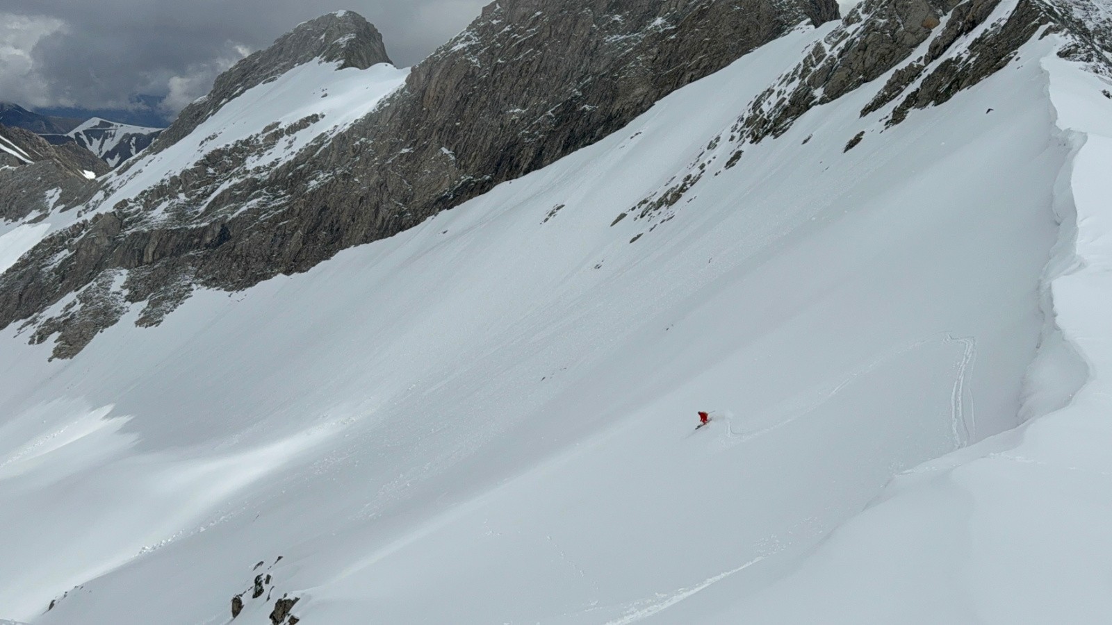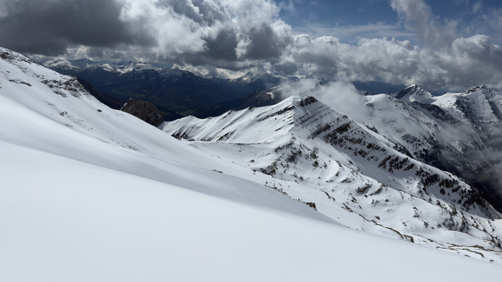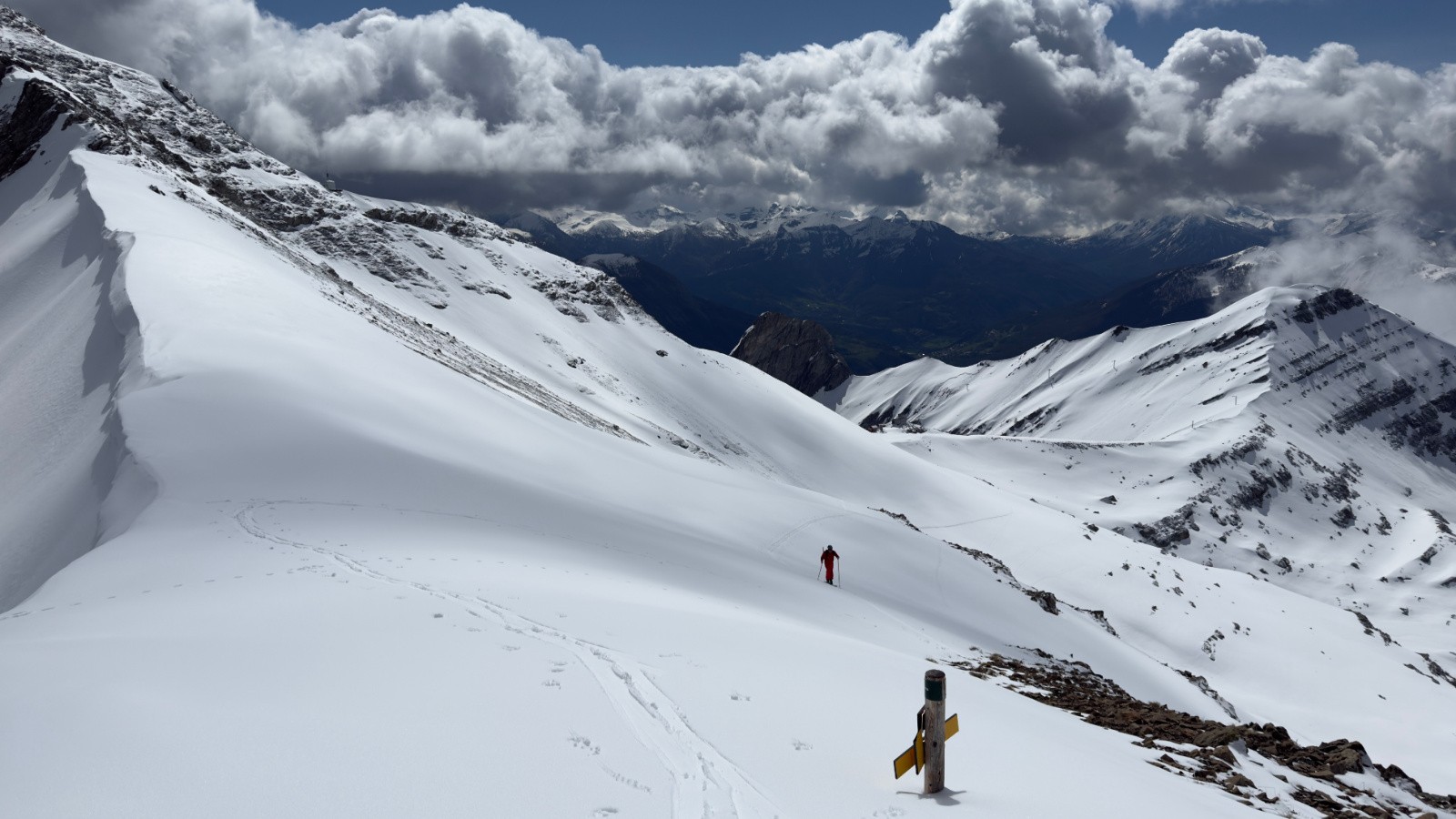En fin de matinée, ça se bâche un peu et je me prends même une averse de neige au sommet. Il faut un peut attendre qua ça se leve pour descendre avec la visi dasn un neige excellente sur fond dur pour un 9 mai.