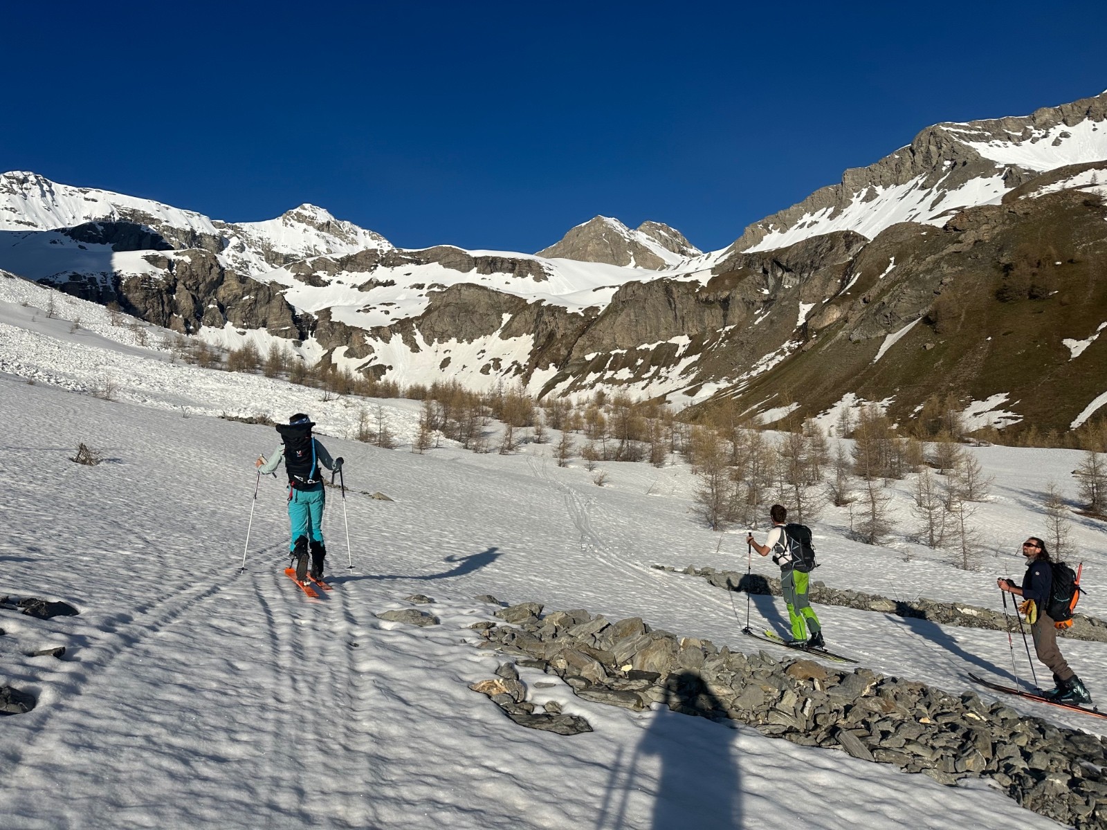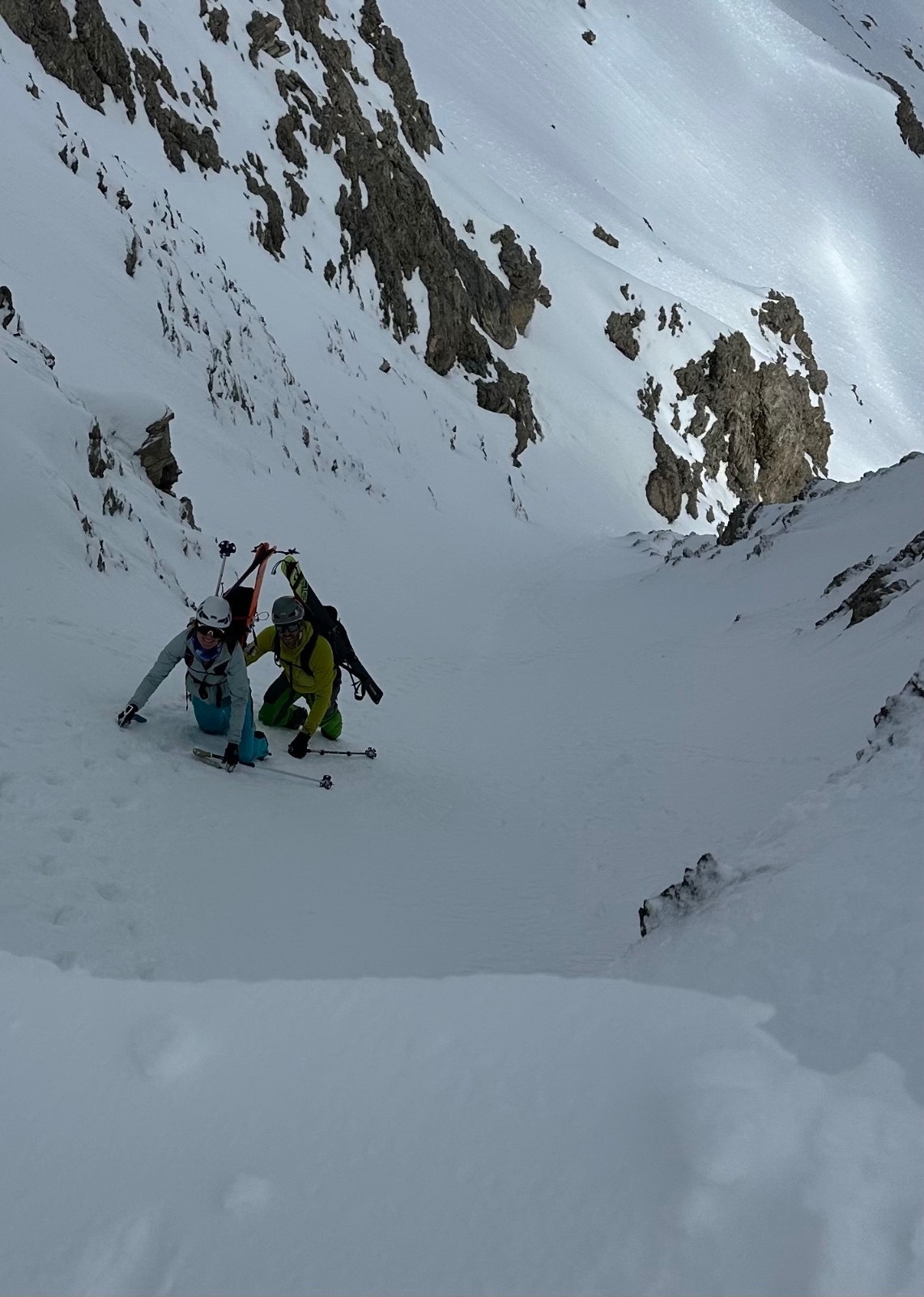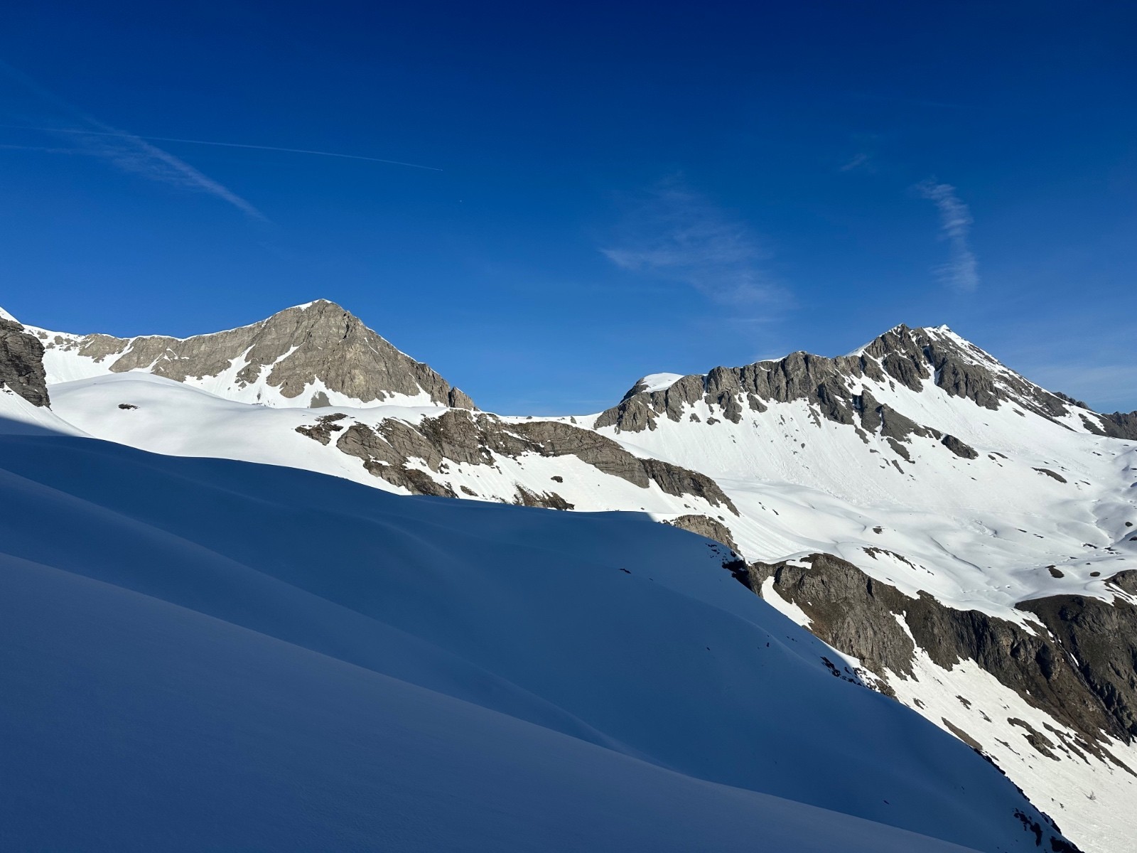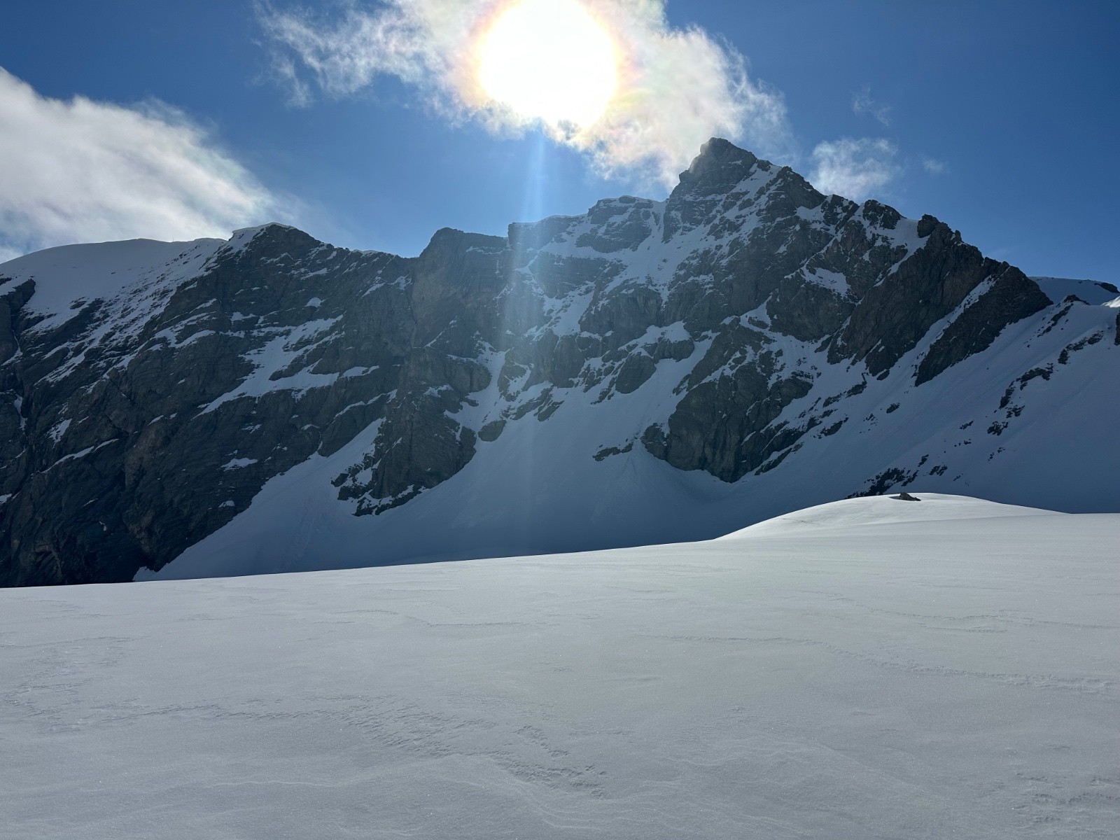 Un lever bien matinal mais au combien raisonnable pour sortir ce Pelât par le couloir Nord Ouest. Après un peu d’hésitation on prend le couloir de gauche, un peu plus raide mais qui sort au sommet. Trace facile à faire, sortie un peu sportive avec une belle corniche à passer. Il faut redescendre un peu du sommet pour trouver une neige très agréable à skier au milieu des marmottes. En cherchent un peu pas de déchaussage jusqu’à rejoindre le replat de remontée au pas de la grande barre. Remontée souple et descente agréable puis un peu moins pour traverser toutes les coulées d’avalanche heureusement bien transformées.