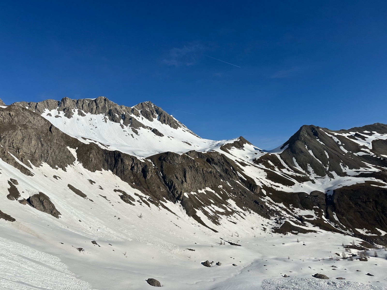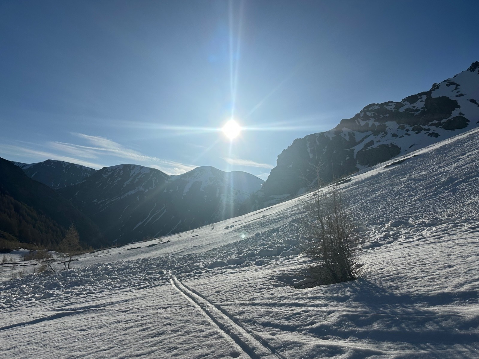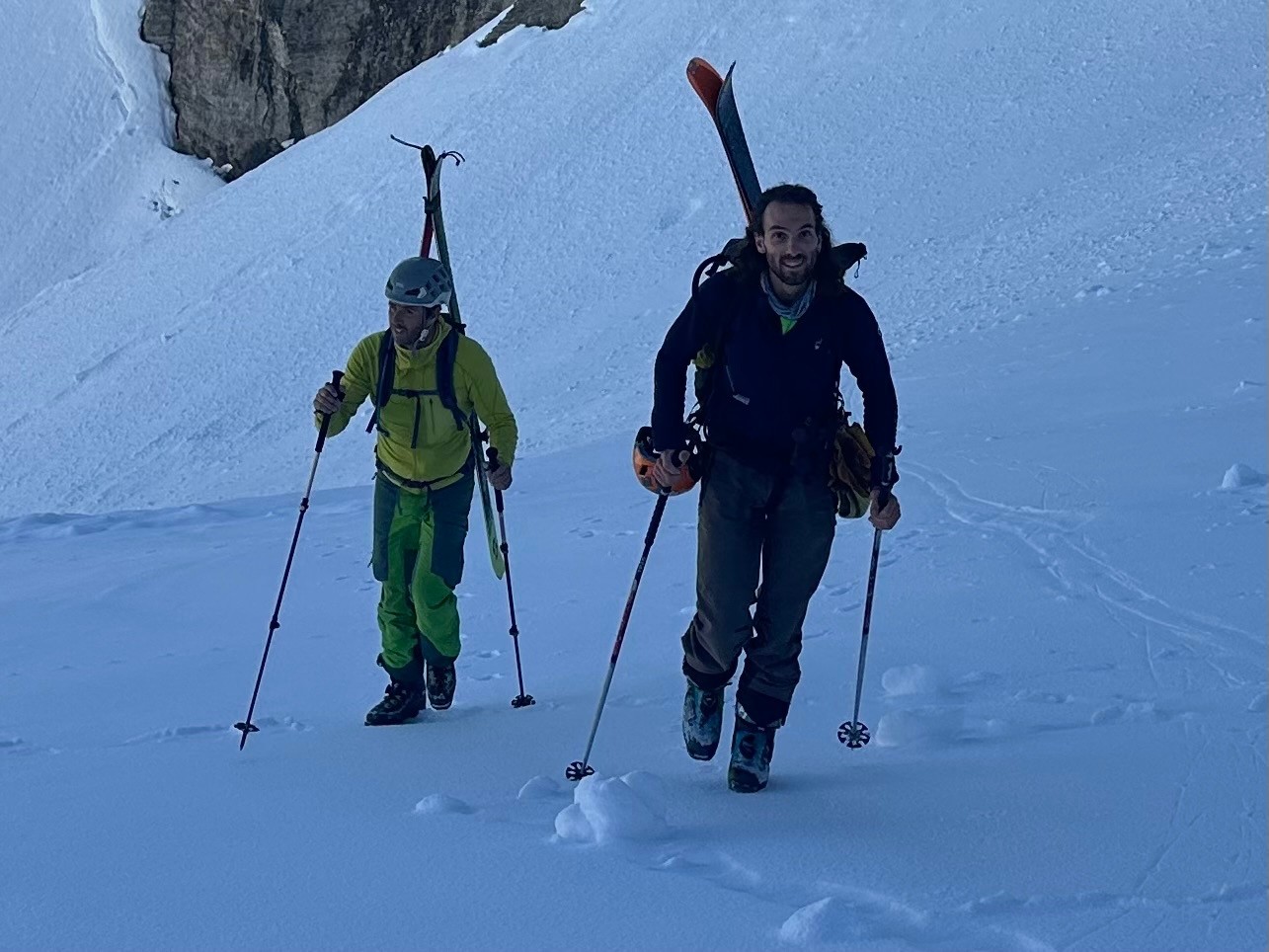 Un lever bien matinal mais au combien raisonnable pour sortir ce Pelât par le couloir Nord Ouest. Après un peu d’hésitation on prend le couloir de gauche, un peu plus raide mais qui sort au sommet. Trace facile à faire, sortie un peu sportive avec une belle corniche à passer. Il faut redescendre un peu du sommet pour trouver une neige très agréable à skier au milieu des marmottes. En cherchent un peu pas de déchaussage jusqu’à rejoindre le replat de remontée au pas de la grande barre. Remontée souple et descente agréable puis un peu moins pour traverser toutes les coulées d’avalanche heureusement bien transformées.