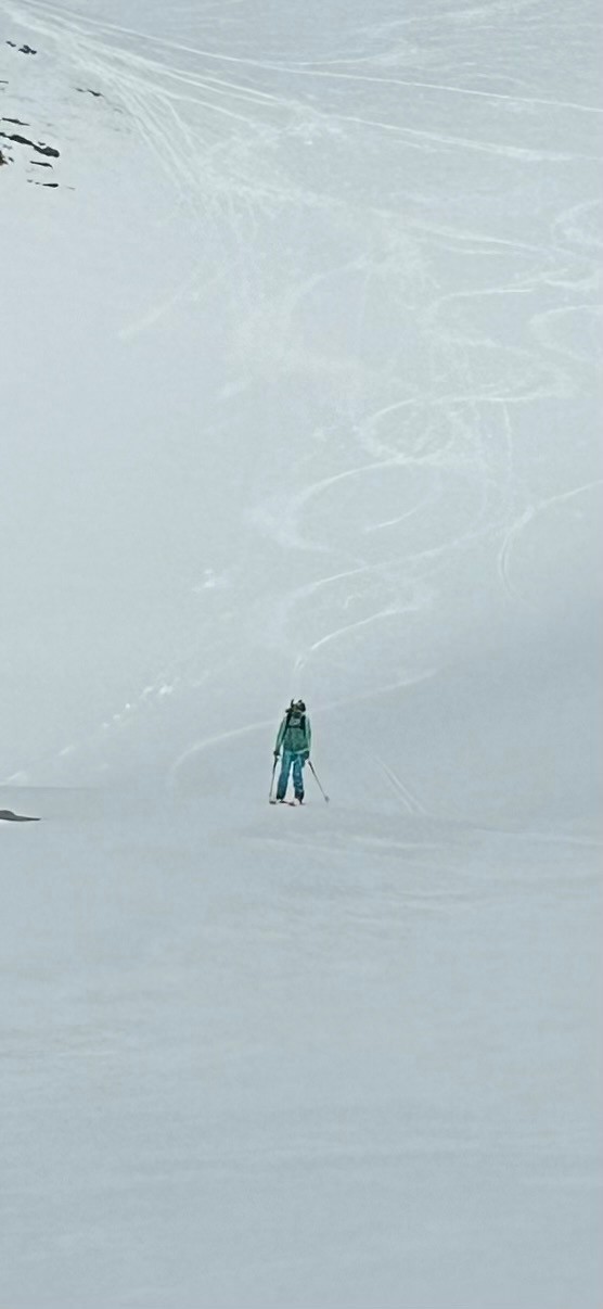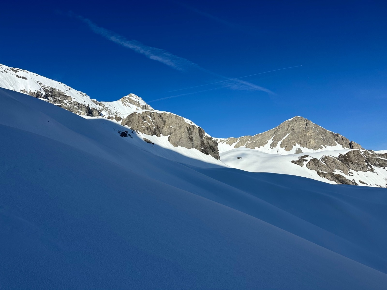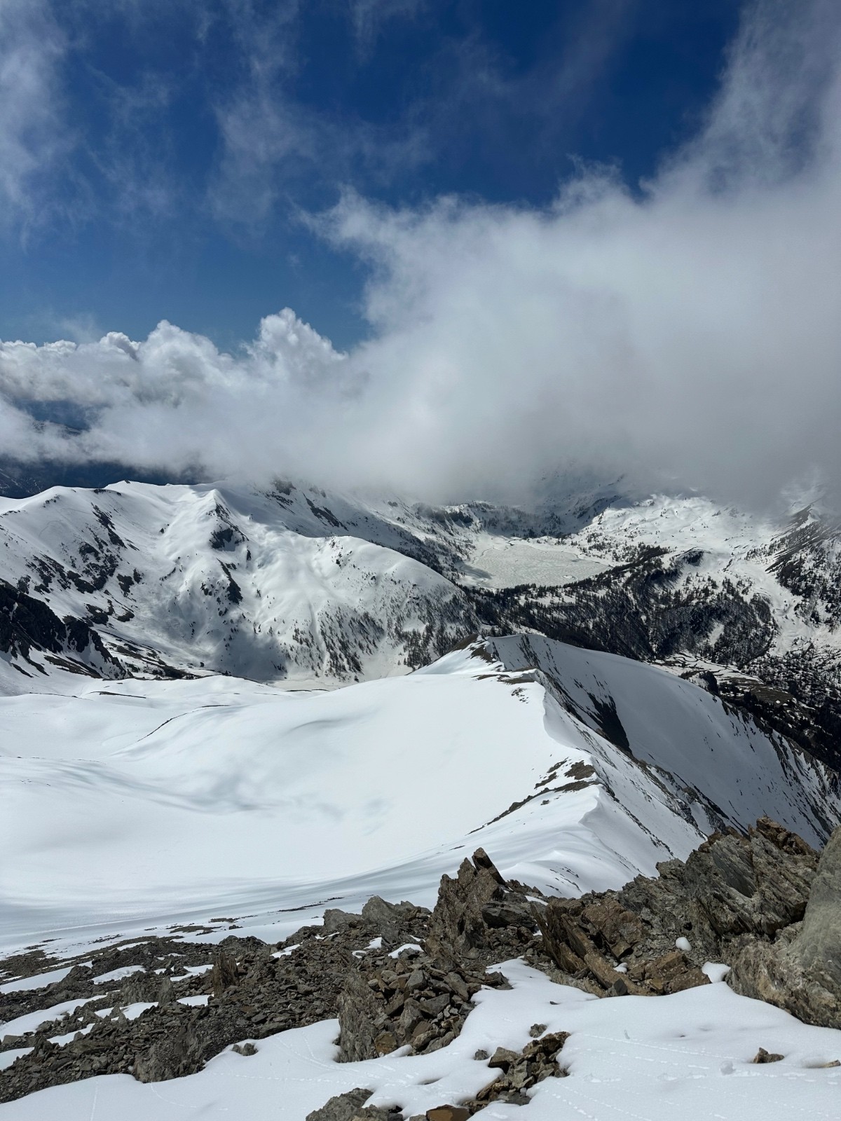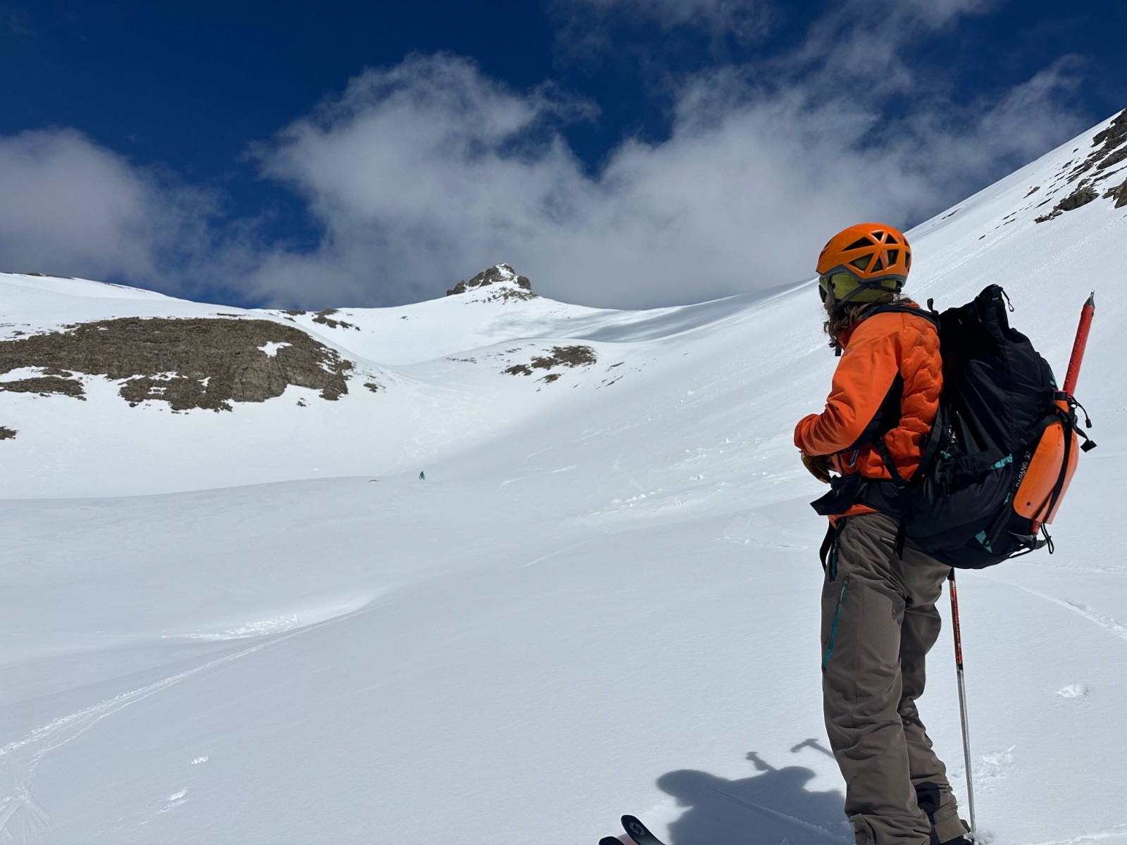 Un lever bien matinal mais au combien raisonnable pour sortir ce Pelât par le couloir Nord Ouest. Après un peu d’hésitation on prend le couloir de gauche, un peu plus raide mais qui sort au sommet. Trace facile à faire, sortie un peu sportive avec une belle corniche à passer. Il faut redescendre un peu du sommet pour trouver une neige très agréable à skier au milieu des marmottes. En cherchent un peu pas de déchaussage jusqu’à rejoindre le replat de remontée au pas de la grande barre. Remontée souple et descente agréable puis un peu moins pour traverser toutes les coulées d’avalanche heureusement bien transformées.