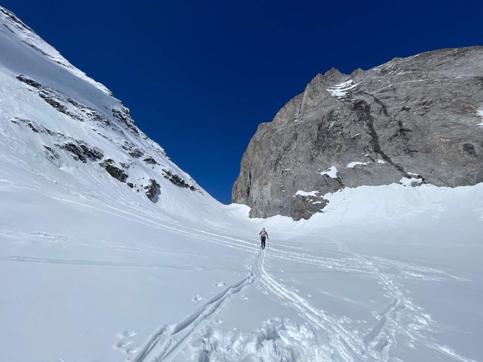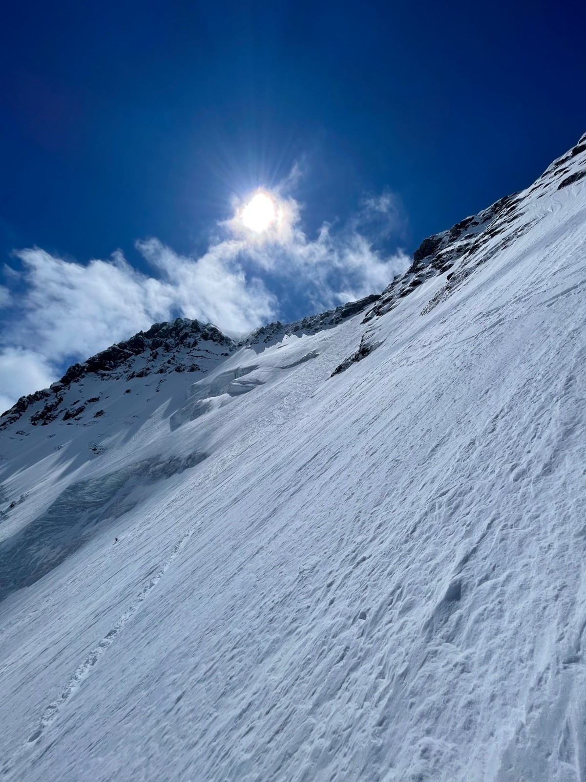 Finalement, les sorties d’hier, et notamment le sluff, avaient recouvert les traces de montée, donc nous avons dû nous employer pour retracer. Et la partie haute et médiane de la face nous a semblé bien dégarnie avec tous les passages, un peu trop pour nous décider à skier les italiens à la descente dans ces portions où nous étions à l’aise mais avec deux piolets à la main.