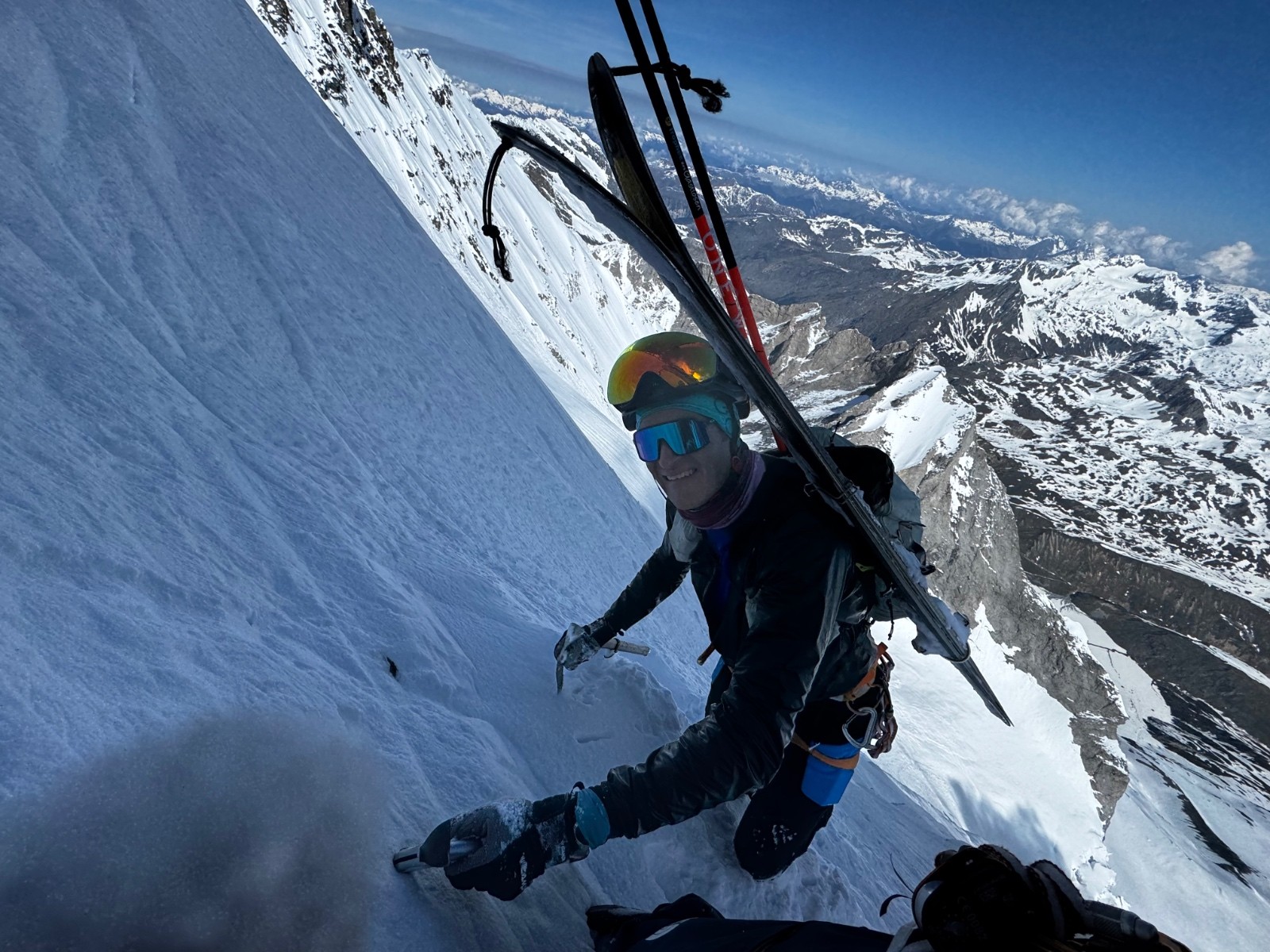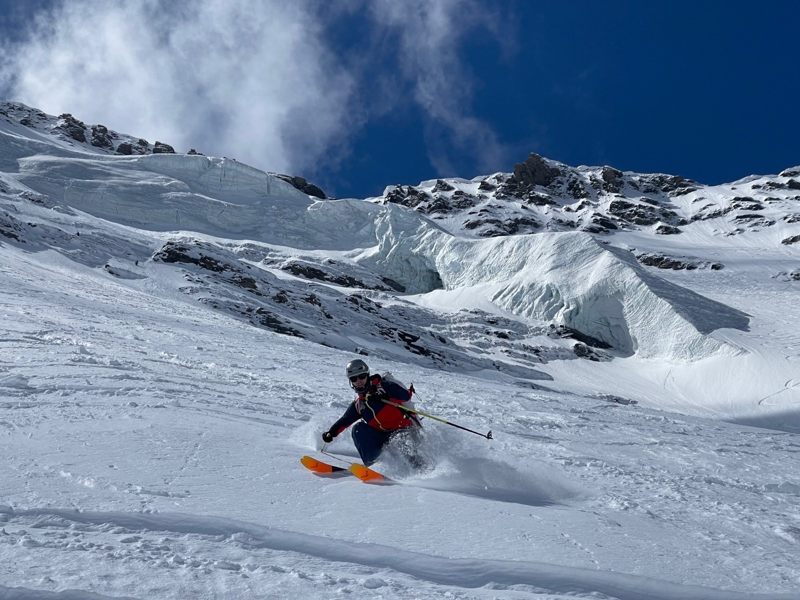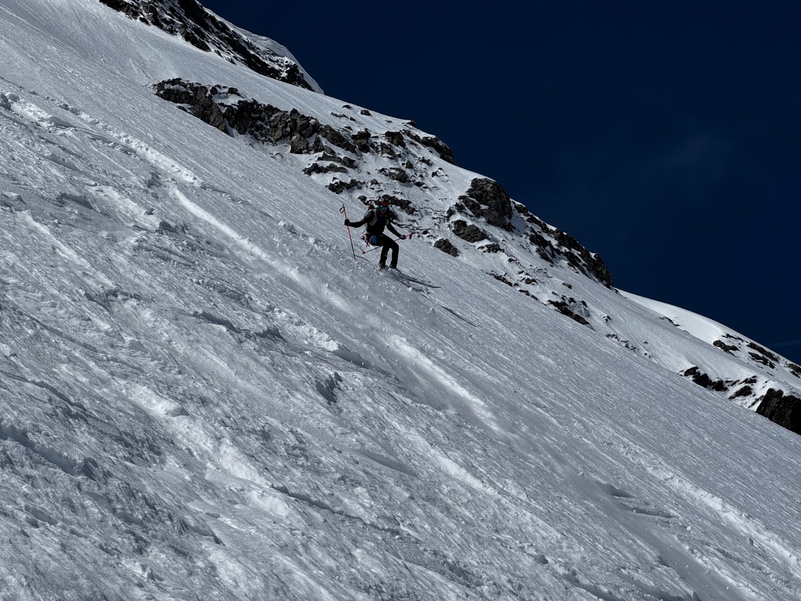 Après un peu d’hésitations dans l’etroiture et la sortie (qui ne nous semblaient pas insurmontables à descendre), nous avons fait le choix de la raison, en allant chercher la face Nord centrale. Il faut dire que nous n’avions pas mis les pieds dans le raide depuis un certain temps et que les skis larges ressortaient pour la première fois du placard depuis Noël. Mais bien nous en a pris : les conditions étaient excellentes, c’est ma troisième descente dans la centrale, à coup sûr la meilleure.