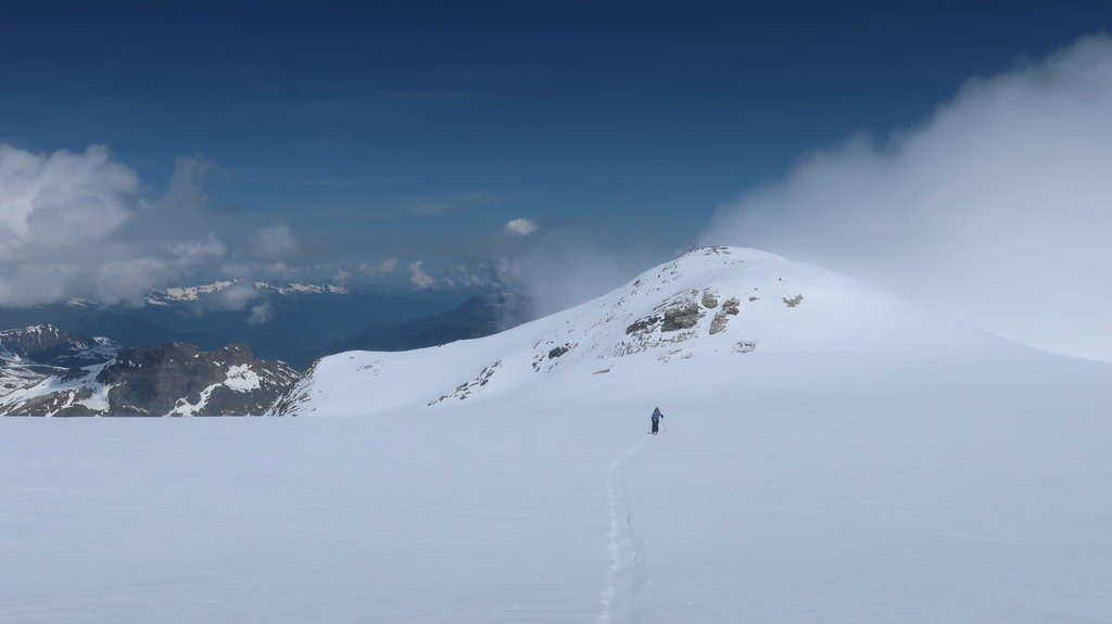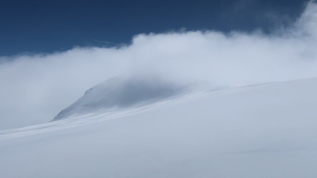 Les nuages se sont même développés et nous avons dû commencer la descente sur le glacier sans aucune visibilité, en suivant scrupuleusement nos traces.