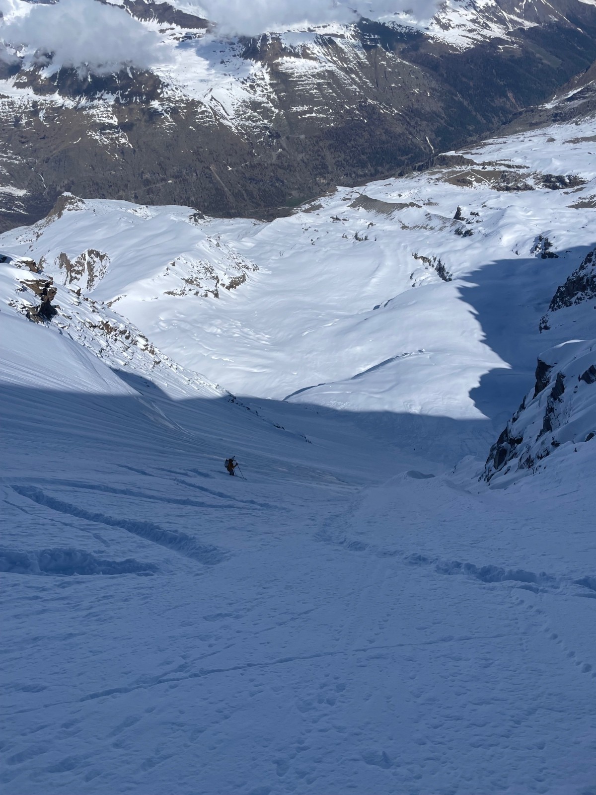 Pour éviter ses traces je fais pareil juste à côté sauf que la neige part sous les skis et me voilà en patinage sur 10 mètres. Heureusement j’arrive à raccrocher de la neige plus bas. Je respire un peu et on reprend le ski dans une neige qui peut accrocher légèrement à ce niveau. Le bas est cependant excellent jusqu’à la rimaye en choisissant bien ses zones ! Grandes courbes mais gaffe au sluff qui m’emmènera un petit coup sans danger.