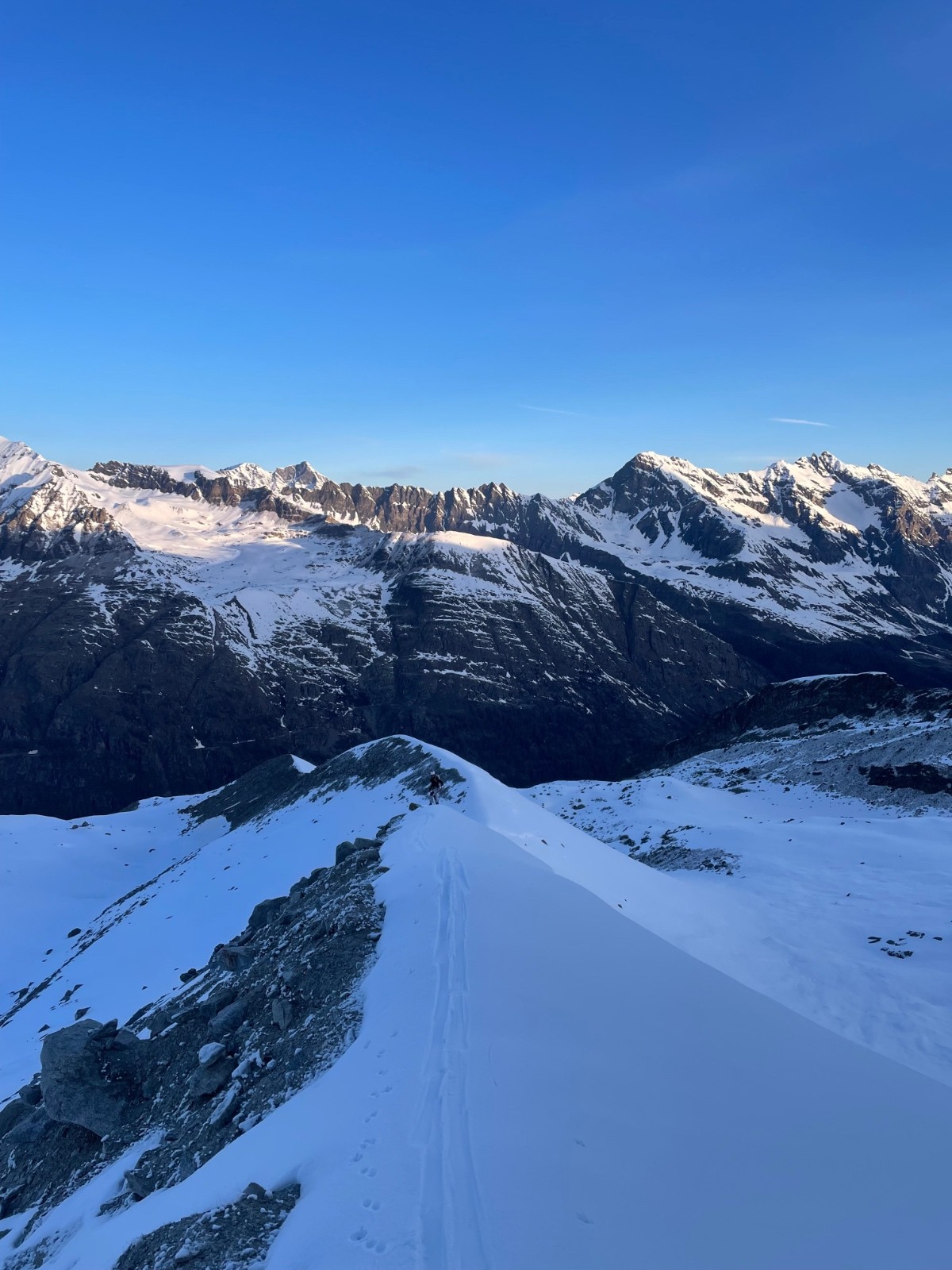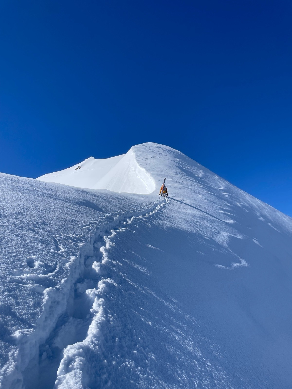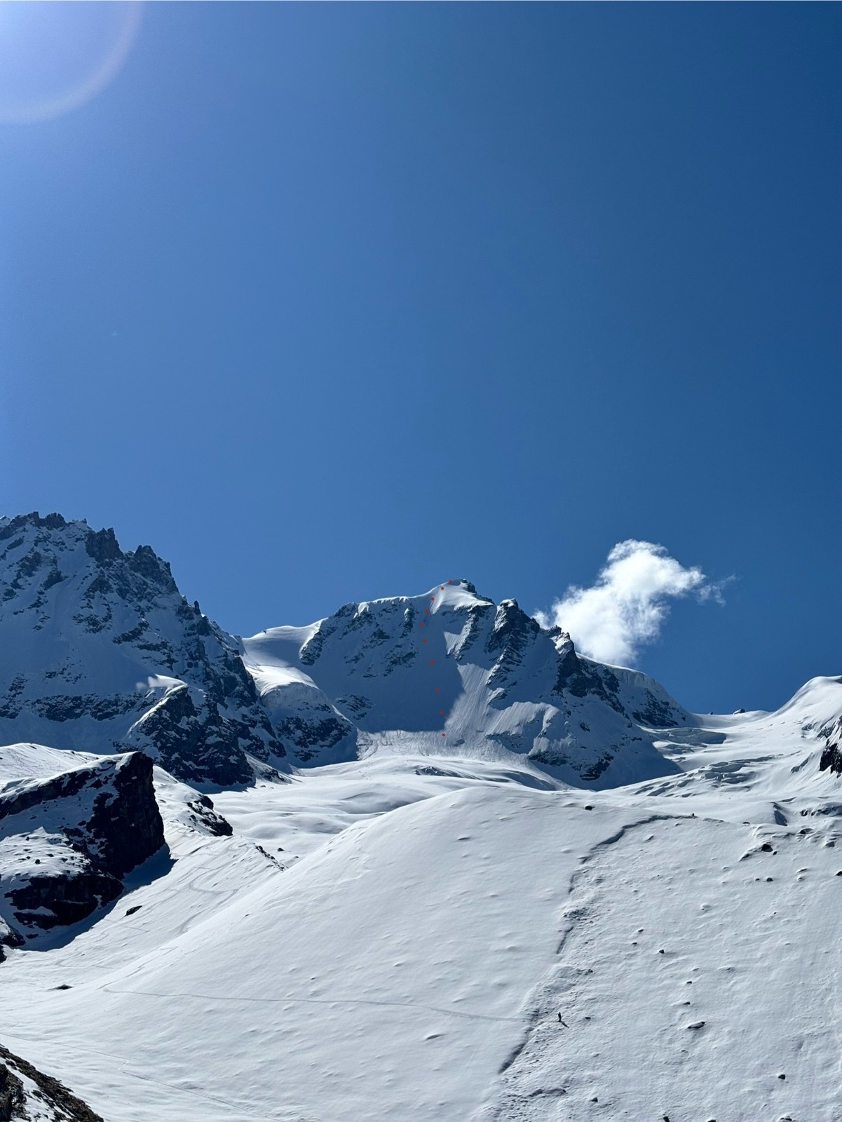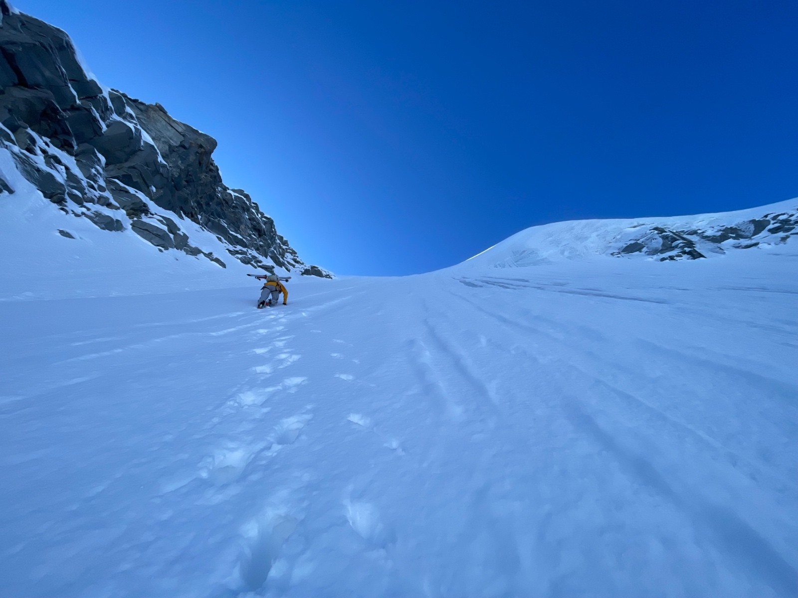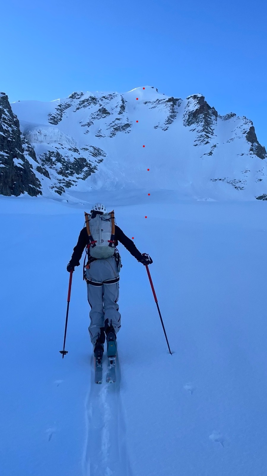Ski : Départ à l’axe de la face dans beaucoup de neige fraîche. Ça sluff un peu. Ensuite on rejoint l’axe de nos traces puis lorsqu’on arrive au passage avec un peu de glace Jules désescalade dans un spin, c’est limite mais ça accroche.