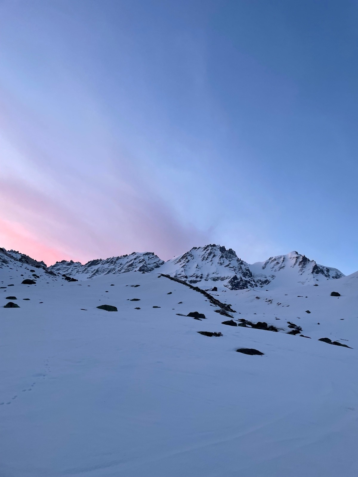 Parking - Refuge : 400m de portage puis on peaute sur une neige avec bon regel. On louvoie entre la végétation jusqu’aux moraines où on aperçoit la face. On a suivi la moraine à droite, inutile de passer au refuge.