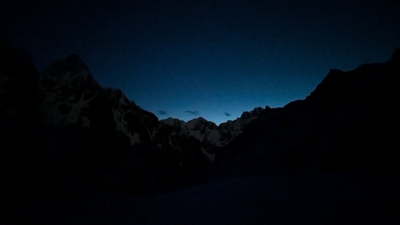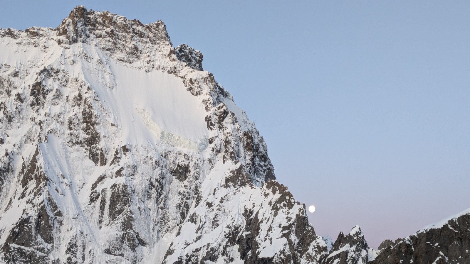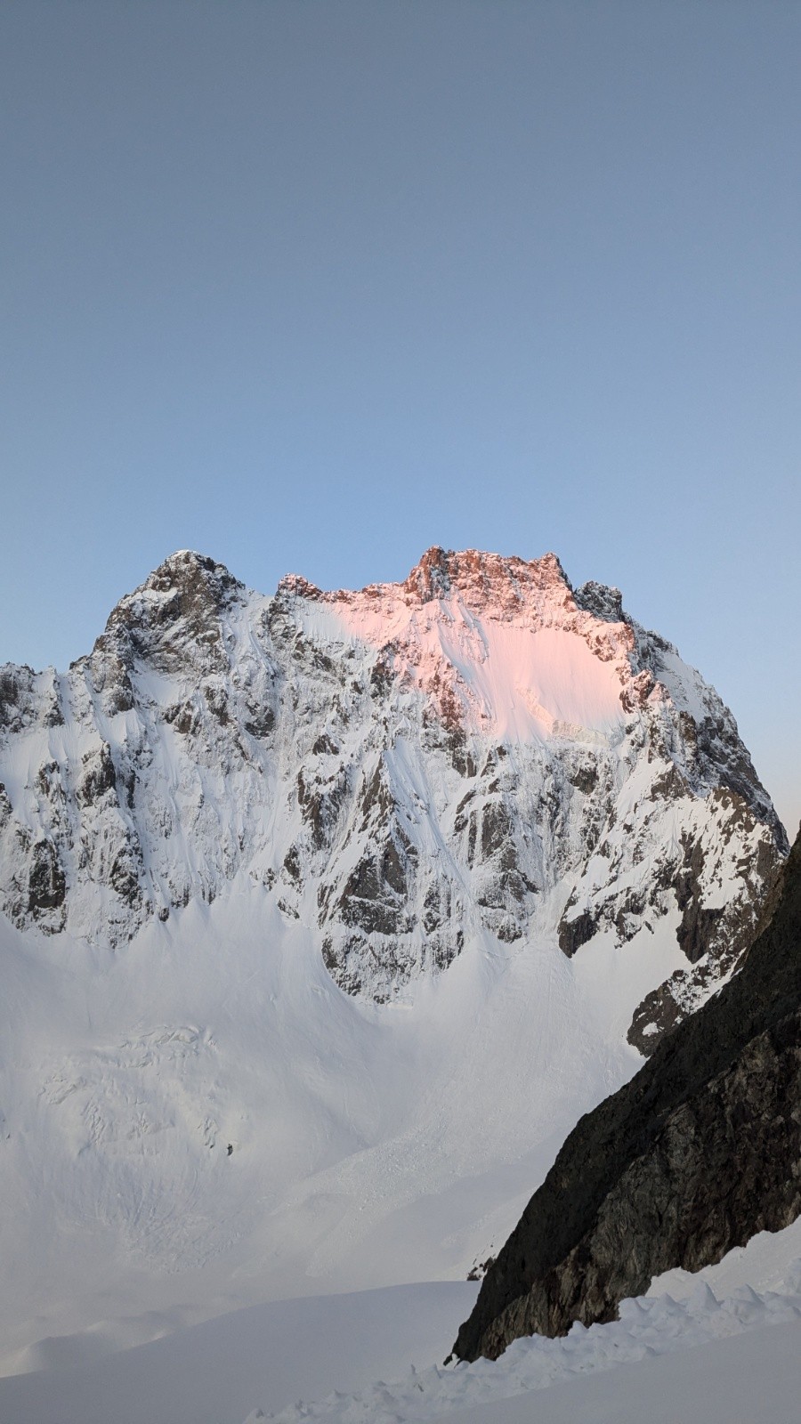Départ 3h10 du parking pour une arrivée au sommet à 8h max. Ça déroule assez la neige porte bien mais quand je prends pied dans la face, changement de neige. Je me retrouve à devoir traver dans une neige regelée sur 5/10cm qui casse, ski aux pieds au début mais très vite sous la rimaye je mets les crampons et là je m'enfonce au dessus des genoux...pas cool. Passé la rimaye je trouve une goulotte avec fond béton qui me soulagera mentalement mais me fumera les mollets. Puis les 100 derniers mètres où je recommence à m'enfoncer jusqu'au cuisses, ceux là achèveront ma volonté d'aller au sommet du Pic Coolidge, sorti du couloir je chausse.