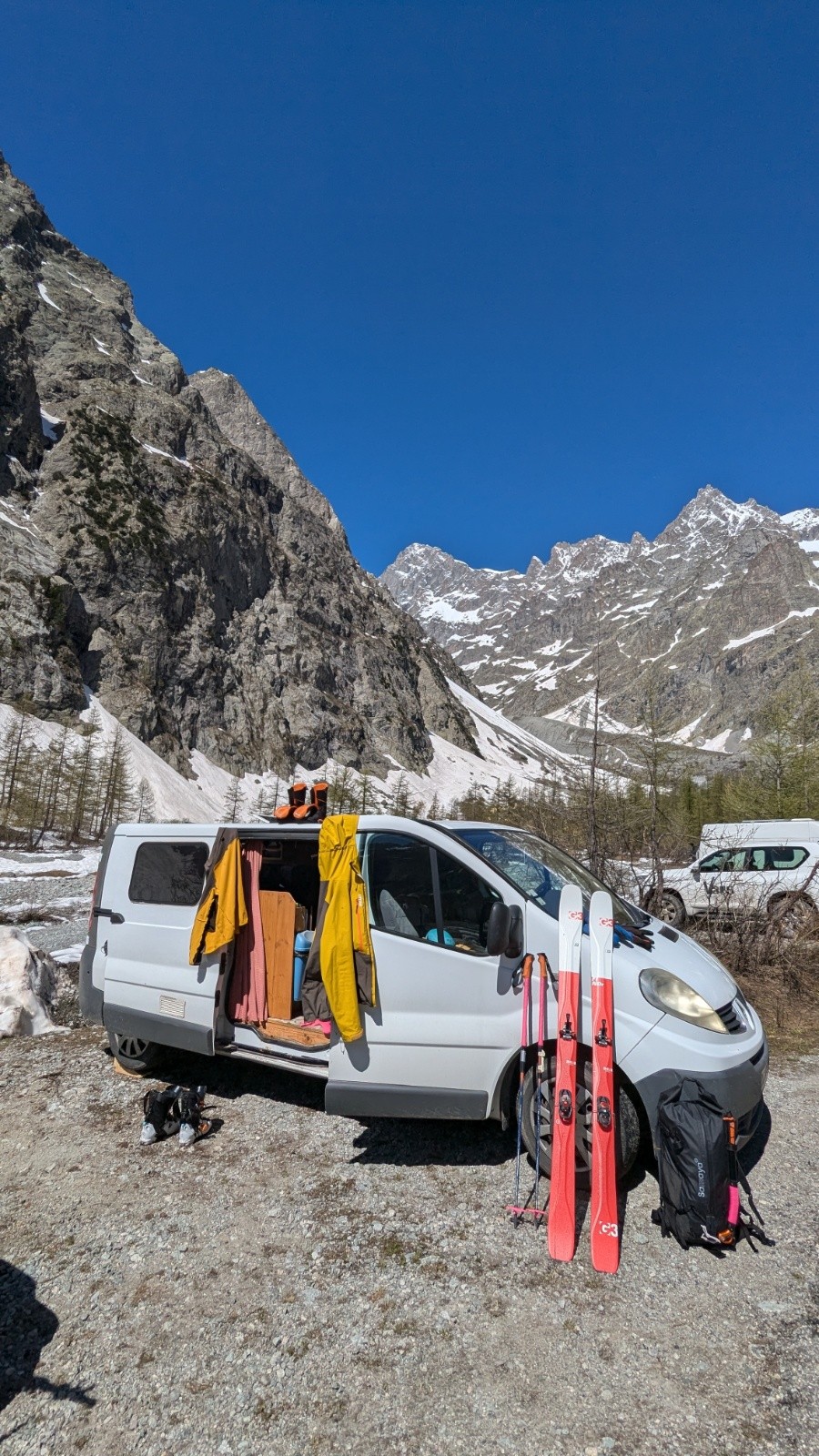 Je pars pour la rimaye du Col du Glacier Noir pour chausser à l'endroit où j'ai cassé le ski dimanche et où la descente à été moins sympa. J'aurais pu tirer jusqu'en haut mais il y a du monde dans le couloir qui descend et qui lâche de beaux sluffs ...bof . Je redescend jusqu'au parking dans différentes neiges printanière toutes chouettes a skier.