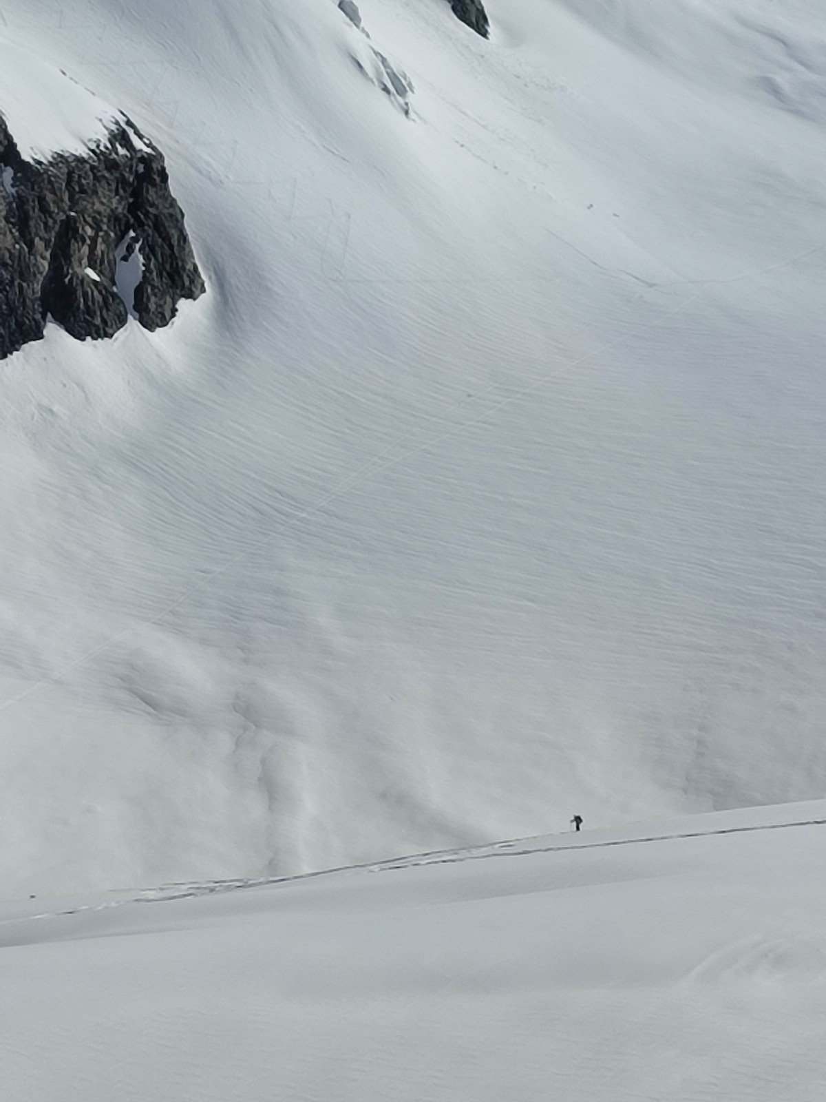 Je pensais qu'il en serait tombé un peu plus. Pour la barre, il manquait pas grand chose. L'entrée dans la face demande de passer ski au pied 5m de rocher. J'ai hésité. Je l'ai déjà skiée et je suis plus jeune et con (juste plus vieux), donc plus envie de tenter ces conneries.
