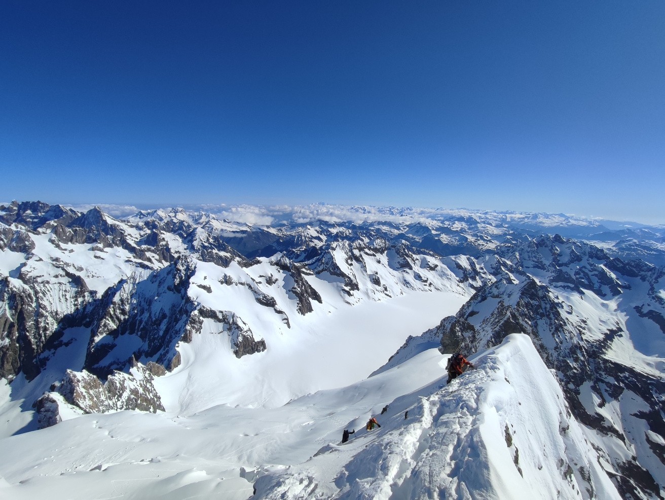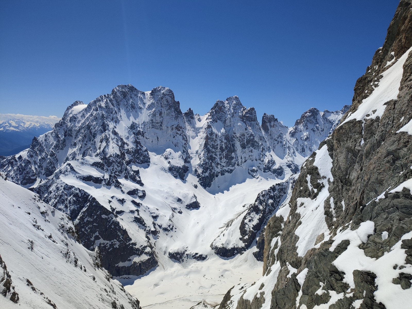 Barre des Ecrins : Elle est toute en neige, mais la quantité est pas énorme. Au sommet, il y a beaucoup de rochers. AR en crampons