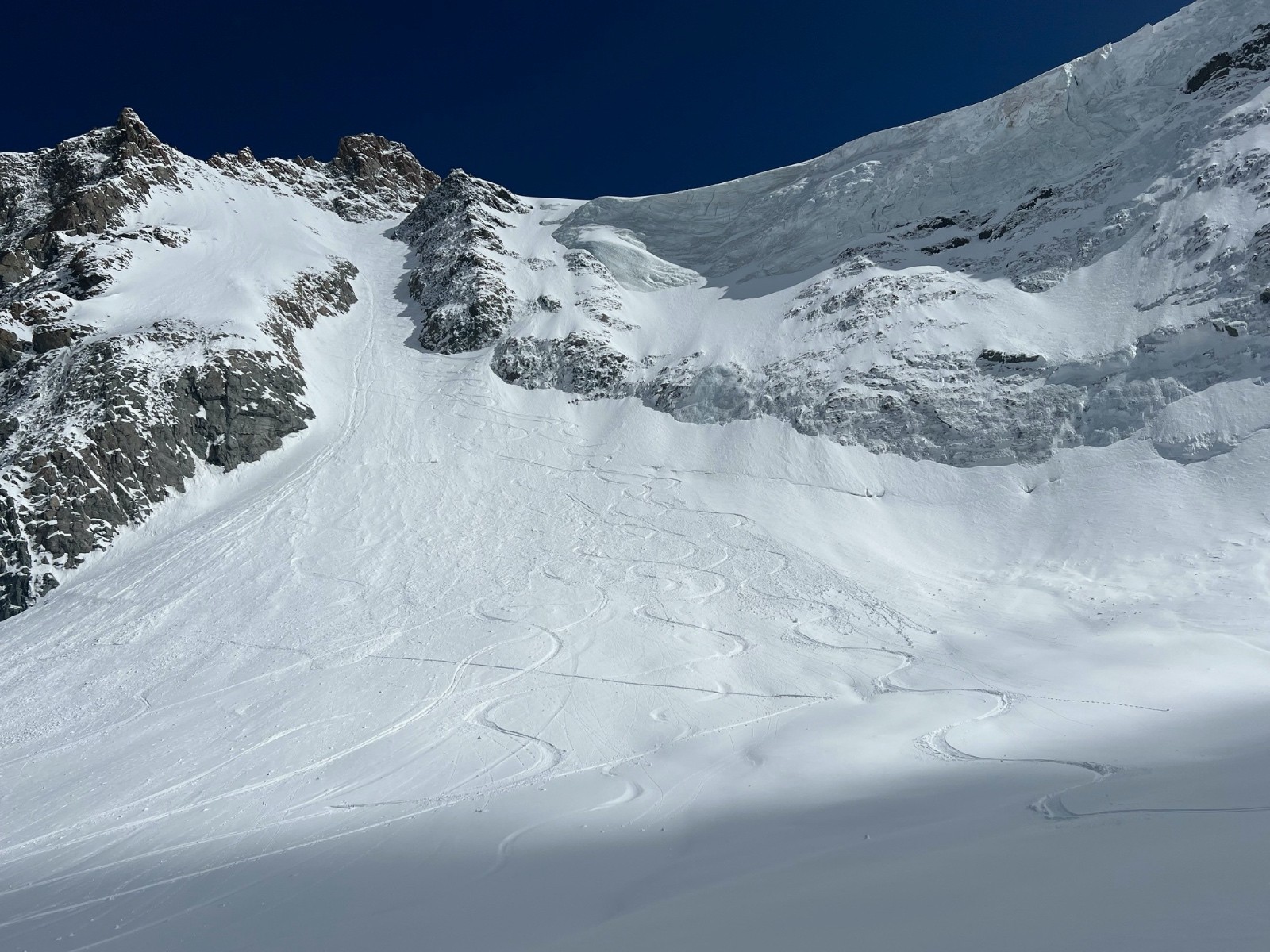 Conditions nivo et activité avalancheuse : Nombreuses chutes de pierres dans les avalanches, un tassement à la rimaye du glacier de la Pillate, une avalanche de neige humide déclenchée sous nos skis non loin du refuge du glacier Blanc (heure tardive)