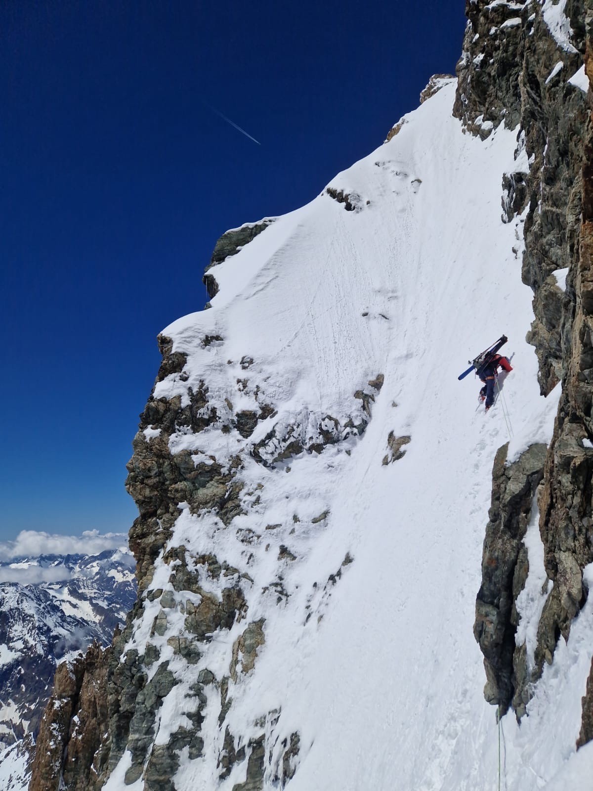 Franchissement de la rimaye skis aux pieds avant de débuter une ascension très difficile. Les levées de genoux vont achever de nous entamer. Nous brassons énormément et cette brèche Lory est vraiment exposée et aérienne. Elle me rappelle la sortie du couloir nord du Brec du Chambeyron , en sens inverse de la gauche vers la droite cette fois, mais surtout en beaucoup plus pentue. Une fois atteint le premier relais en place, nous nous assurerons jusqu'en haut. La neige commence à chauffer et nous bottons un maximum. Sangles sur becquets et un beau piton trouvé sur le parcours. Les nuages viennent nous caresser en fin de parcours. Nous gérons lentement mais surement ces difficultés imprévues et arrivons tard tout en haut. Il est 15h00. Le brassage, l'altitude et l'application nous ont bien fatigué. Repos 30 minutes. C'est encore grand beau de ce côté et tout nous semble "plat" par rapport à tout à l'heure. Nous sommes les derniers à skier ce versant. La barre des Ecrins a été gravie mais non skiée par manque de neige. La neige poudreuse est très légère. On se refait un peu les cuisses, se laissant glisser en poussée sur les tiges avant. J'apprécie le fartage. Nathalie opte pour un superbe champ de poudreuse immaculée sur la voie classique. J'ai quand même envie de skier Barre Noire certainement en bonnes conditions. Six skieurs seulement m'ont précédé. L'entrée se fera en dérapage, prudemment, avant d'arrondir de beaux virages. Je le savoure pour moi tout seul. Le retour par la Grande Sagne est oublié depuis longtemps. Regroupés au milieu du glacier, nous filons tranquillement sur ce glacier toujours en bonne neige non collante. La suite de dégrade forcément vue l'heure indue à laquelle nous passons. Nous ferons partir une petite coulée de neige humide sur une contre-pente près du refuge. Nous prenons notre temps car nous ne sommes vraiment plus à une heure près, enthousiasmés par cette magnifique boucle en haute montagne au coeur de ce décor grandiose que sont les Ecrins. C'est une très belle sortie de fin de saison et cette fois les skis vont au placard.
