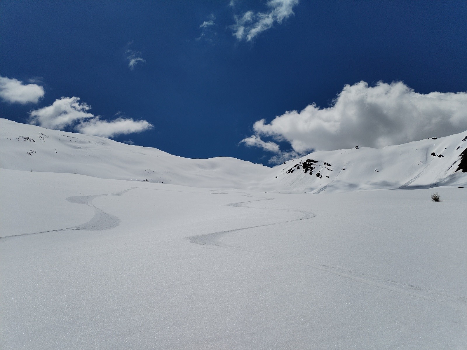 Conditions nivo et activité avalancheuse : des coulées des jours précédents visibles en pente raide. RAS sur le parcours, malgré l'isotherme 0 à 2800m. La neige est béton lmatin