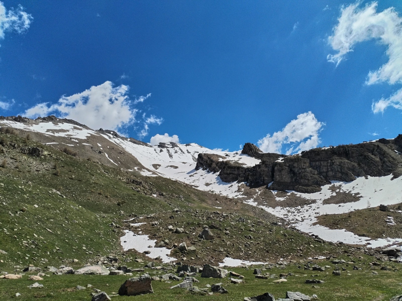 On envisageait de redescendre par le vallon du Parpaillon. Vu l'état corniche de départ et raideur, on a abandonné l'idée.