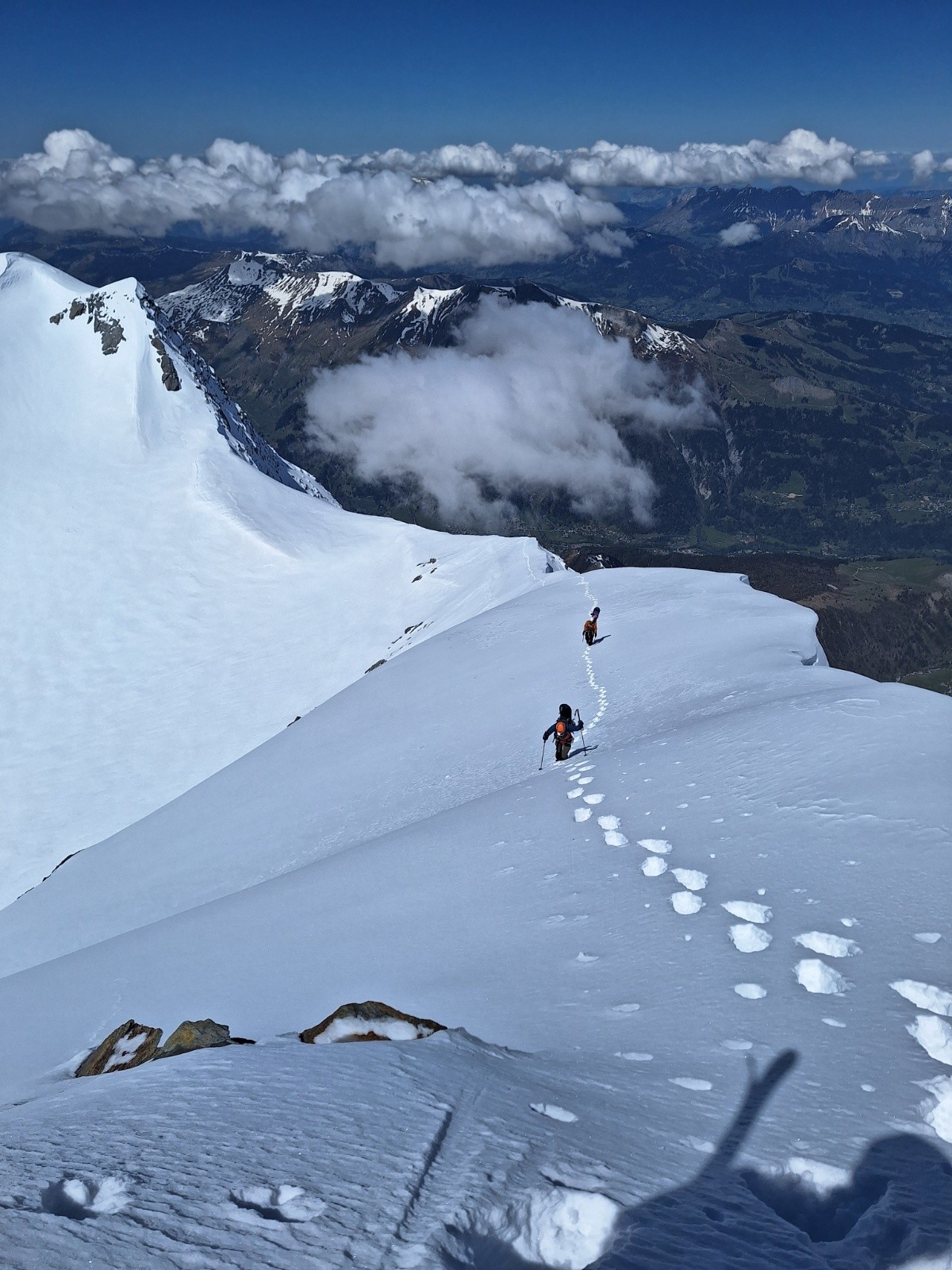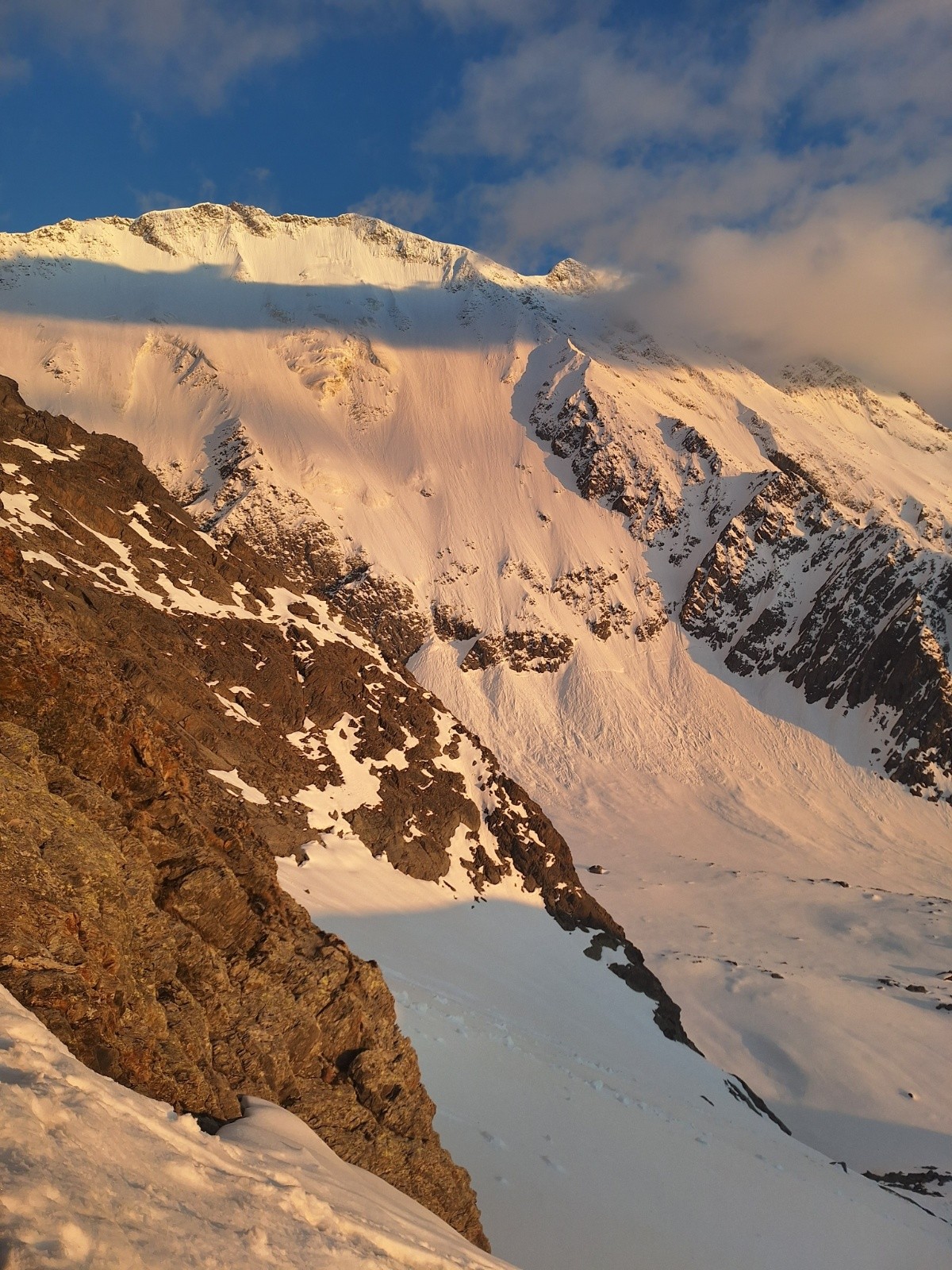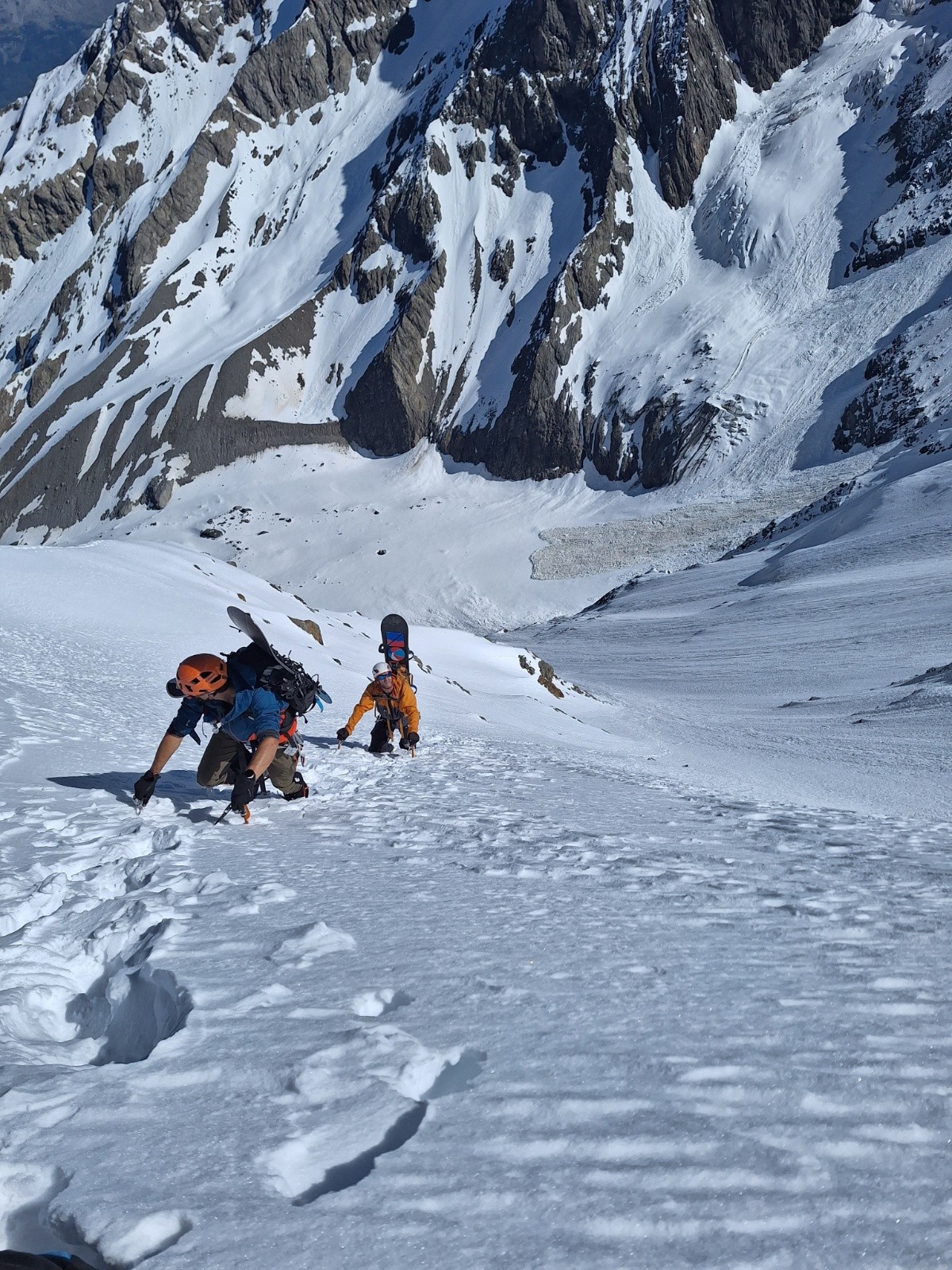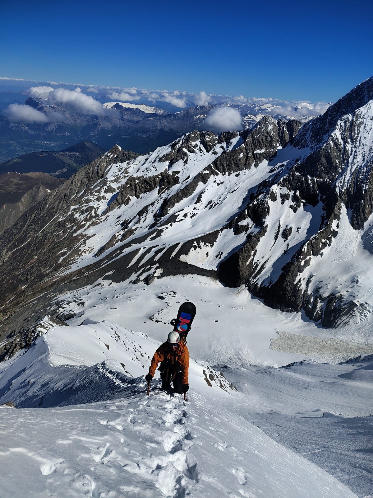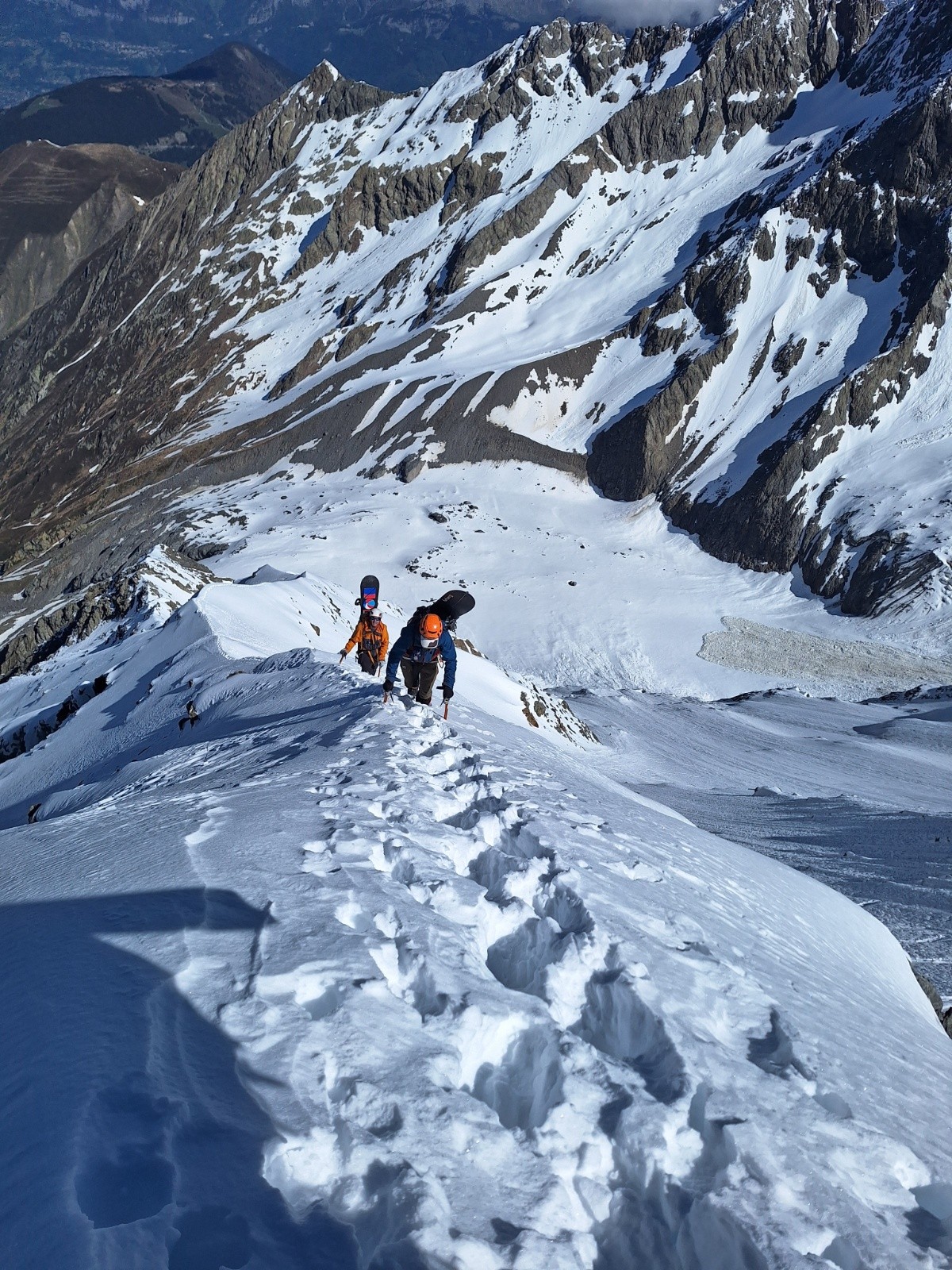 Départ à 8h du refuge(belle grasse mat pour une fois), à l'attaque de l'immense face. Ça passe vite au début, on a la chance d'avoir des traces mais les dernières centaines de mètres nous ont paru bien plus longue. On a bifurqué à 300m du sommet sur l'arête Métrier.