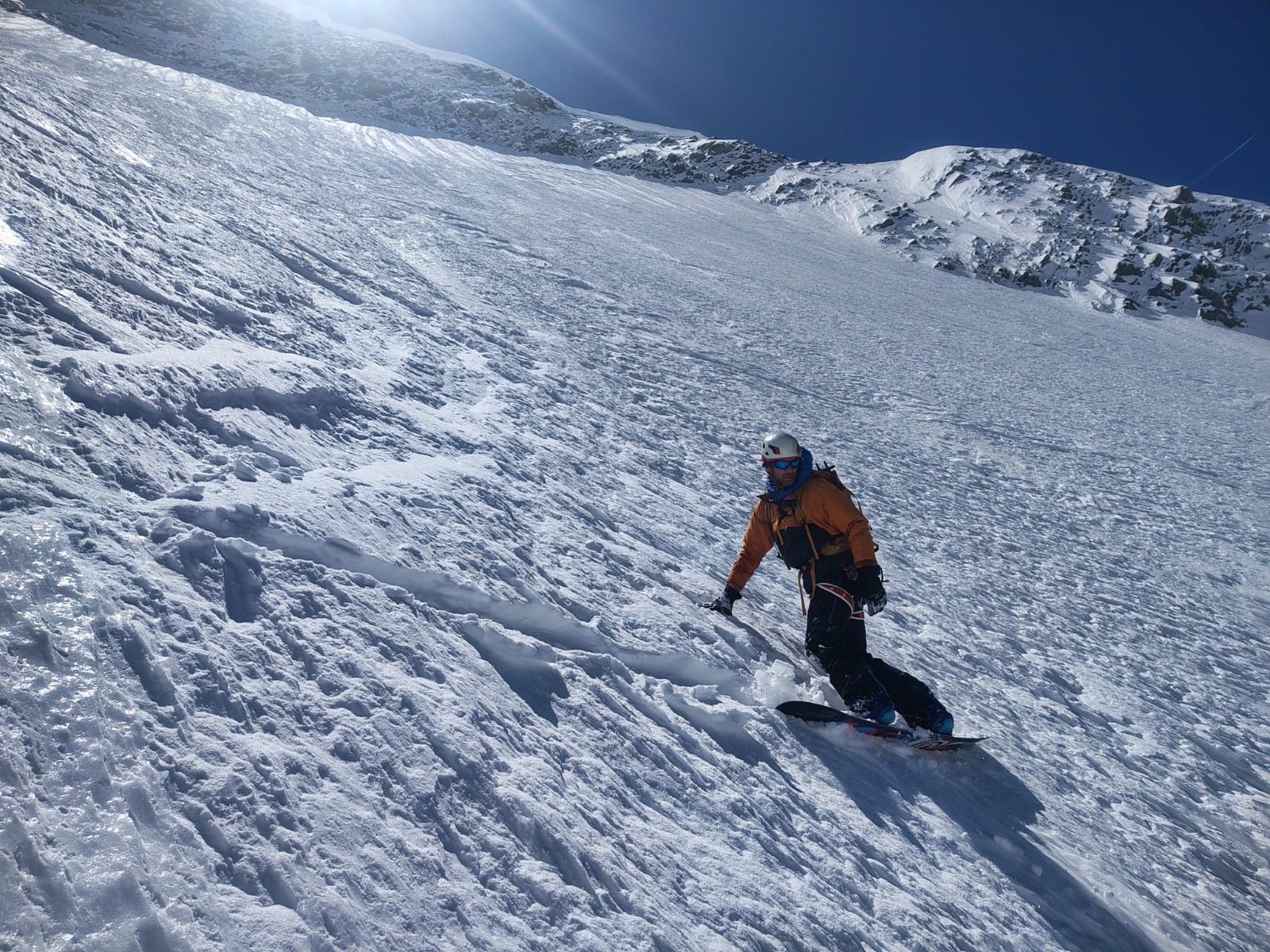 À la descente, David et Clément choisissent de tenter l'écharpe sous le sommet faiblement enneigé qui permet de rejoindre le haut de la face. Ça avait l'air d'être une petite mission vu le faible enneigement en haut, j'ai préféré skier l'arête par litineraire de montée. Ça se skie bien, quelques passages en dry ski sont un peu pénibles. Je les retrouve dans la face, ils se sont bien fait plaisir dans le haut. On termine la descente, toujours dans le même type de neige : vieille poudreuse un peu croûtée au dessus, pas très souple mais qui permet quand même de faire des virages sympas, sans pouvoir complètement se lâcher.