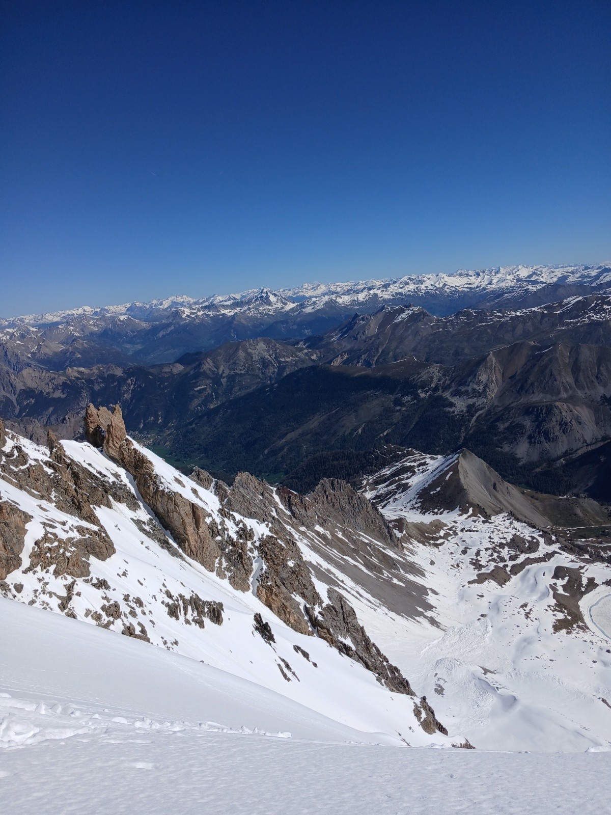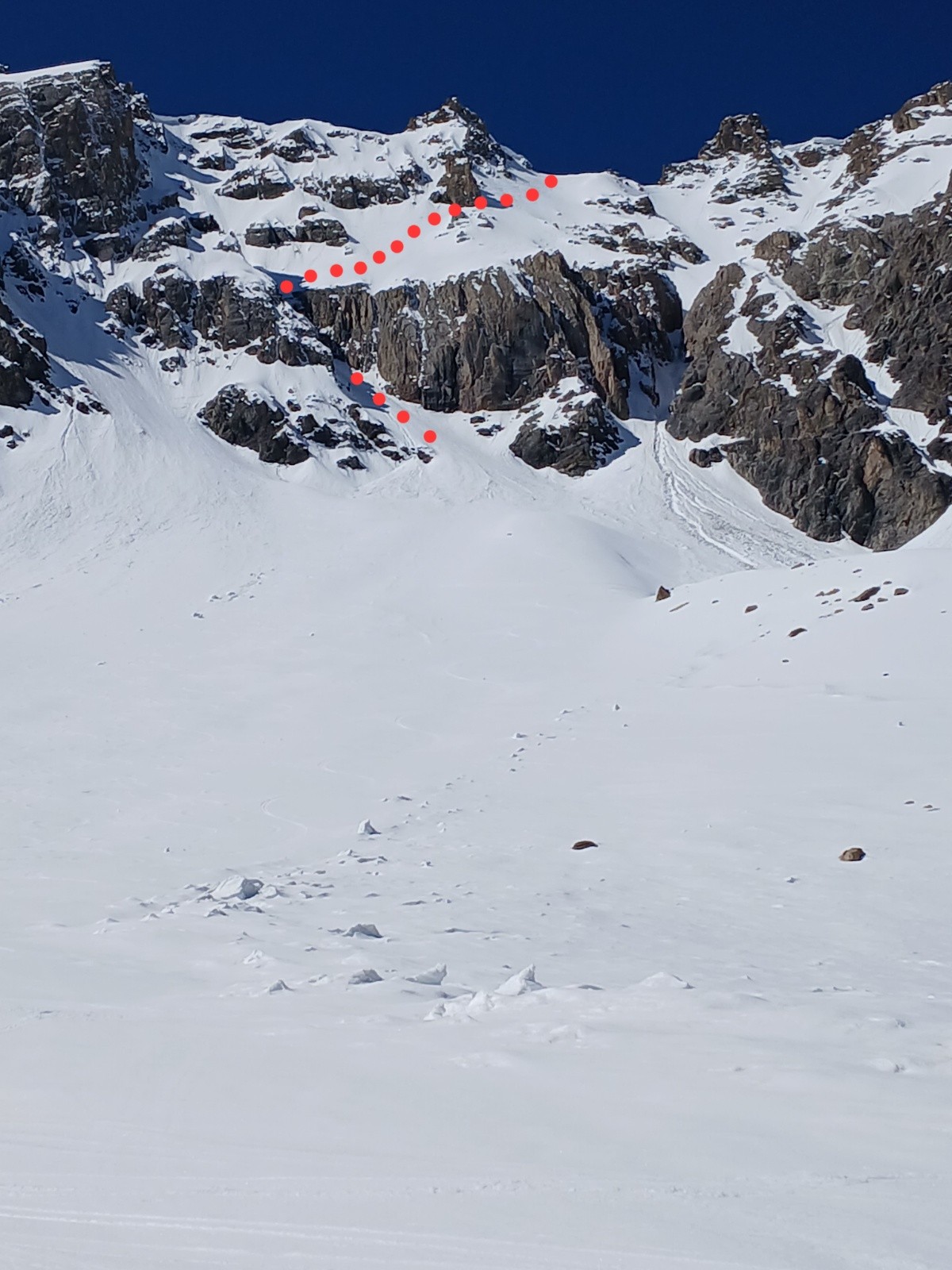 Itinéraire suivi : Chaurionde, lac St Anne, 1 er tiers du couloir Nord, bascule à droite sur les pentes suspendus de l'Écharpe Nord, descente par le même itinéraire