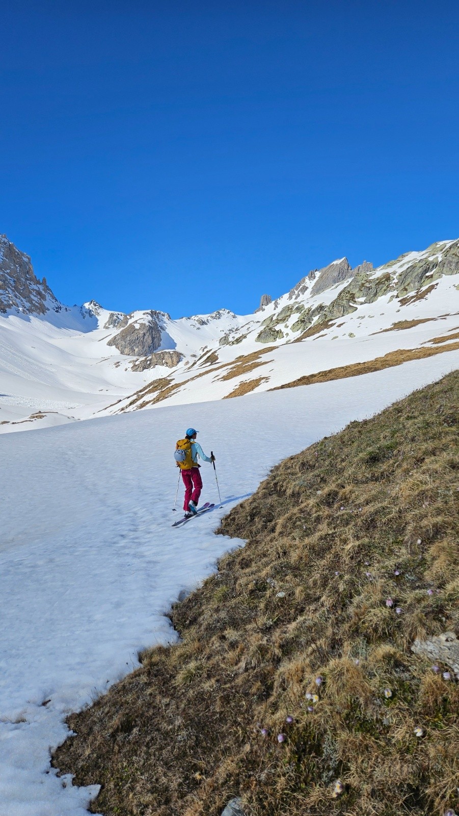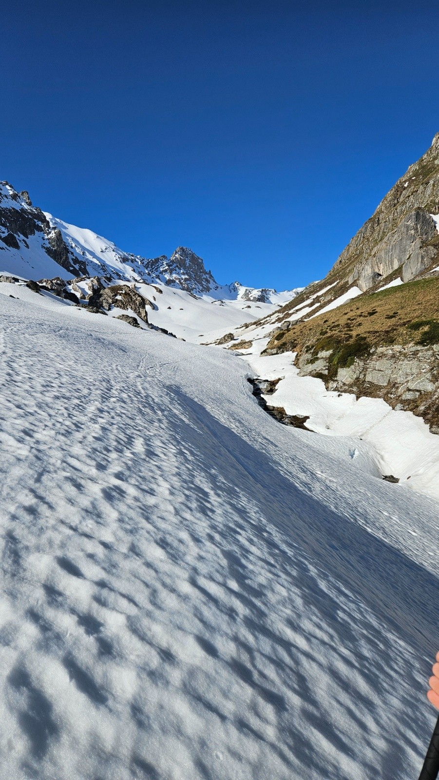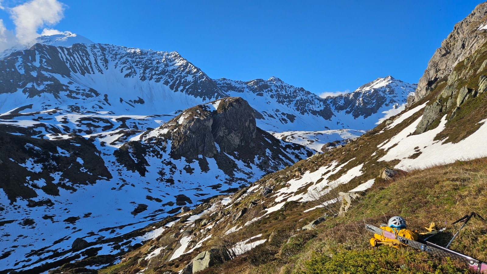 Après une journée sur glacier à haute altitude hier nous faisons le choix de la balade en mode visite au départ du Cormet de Roselend pour aujourd'hui. Au programme rien de précis, on va dans la combe de la Neuva et on avise en fonction de l'enneigement. On démarre donc à pied en prenant une piste. Rapidement on se retrouve face à des névés bien regelés. Il faudrait mettre les crampons vite fait, traverser le névé et ne plus en parler (seulement 2 névés nécessitaient les crampons, les autres ne sont pas raides) . Malheureusement ça ne se passe pas comme ça, comme Lucie monte en baskets on essaie de contourner en montant dans les broussailles et ça devient vite une belle galère. En plus tout le groupe n'est pas forcément d'accord sur une poursuite ou un demi tour pour skier dans le vallon d'Arpire. Galères et tergiversations nous mènent finalement à rester sur le plan initial après une énorme perte de temps. On finit donc par chausser au bout de la piste avec les couteaux. Après un petit déchaussage on les enlève et on n'aura plus besoin de les remettre.