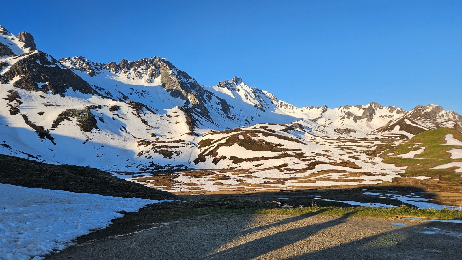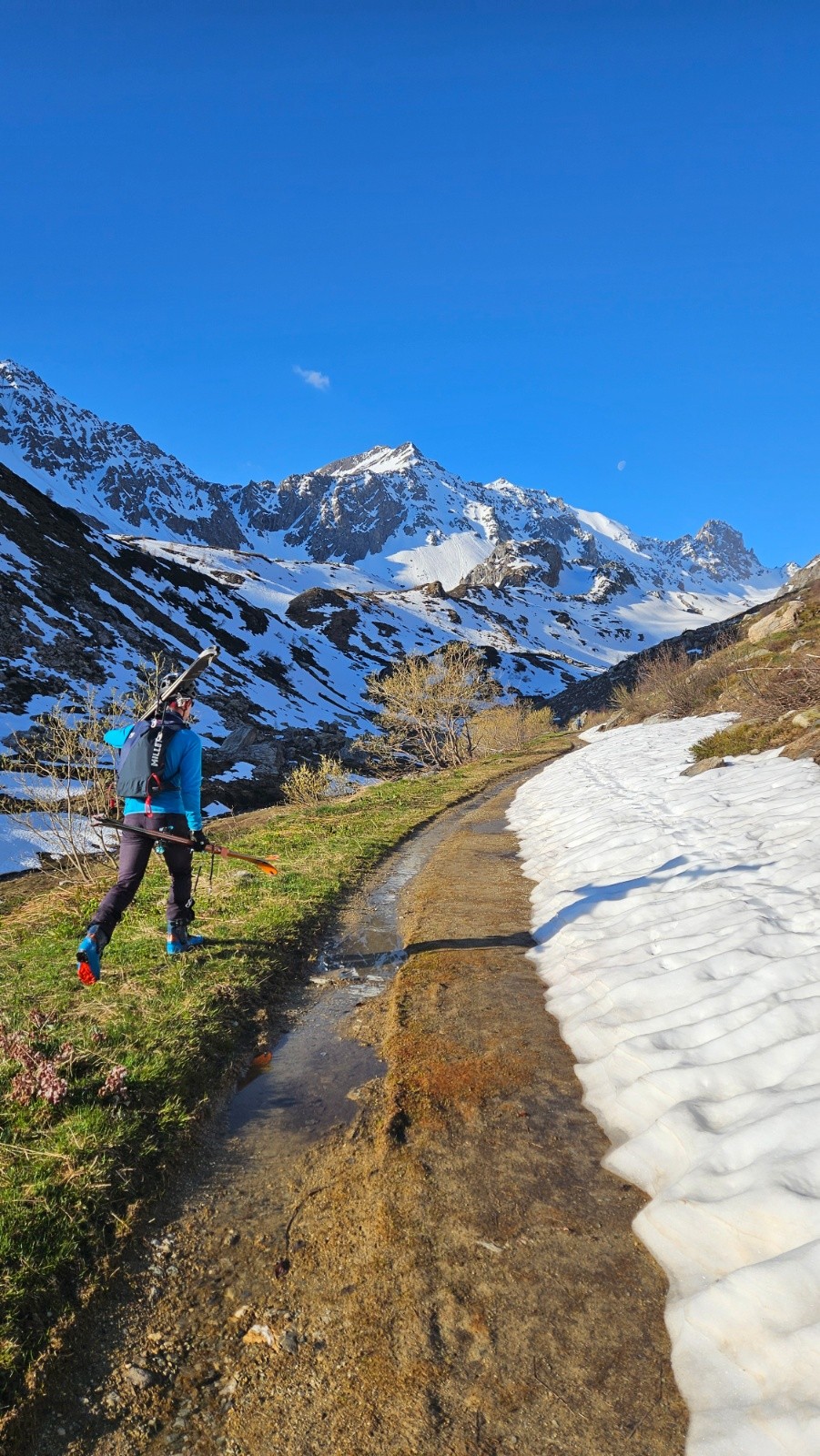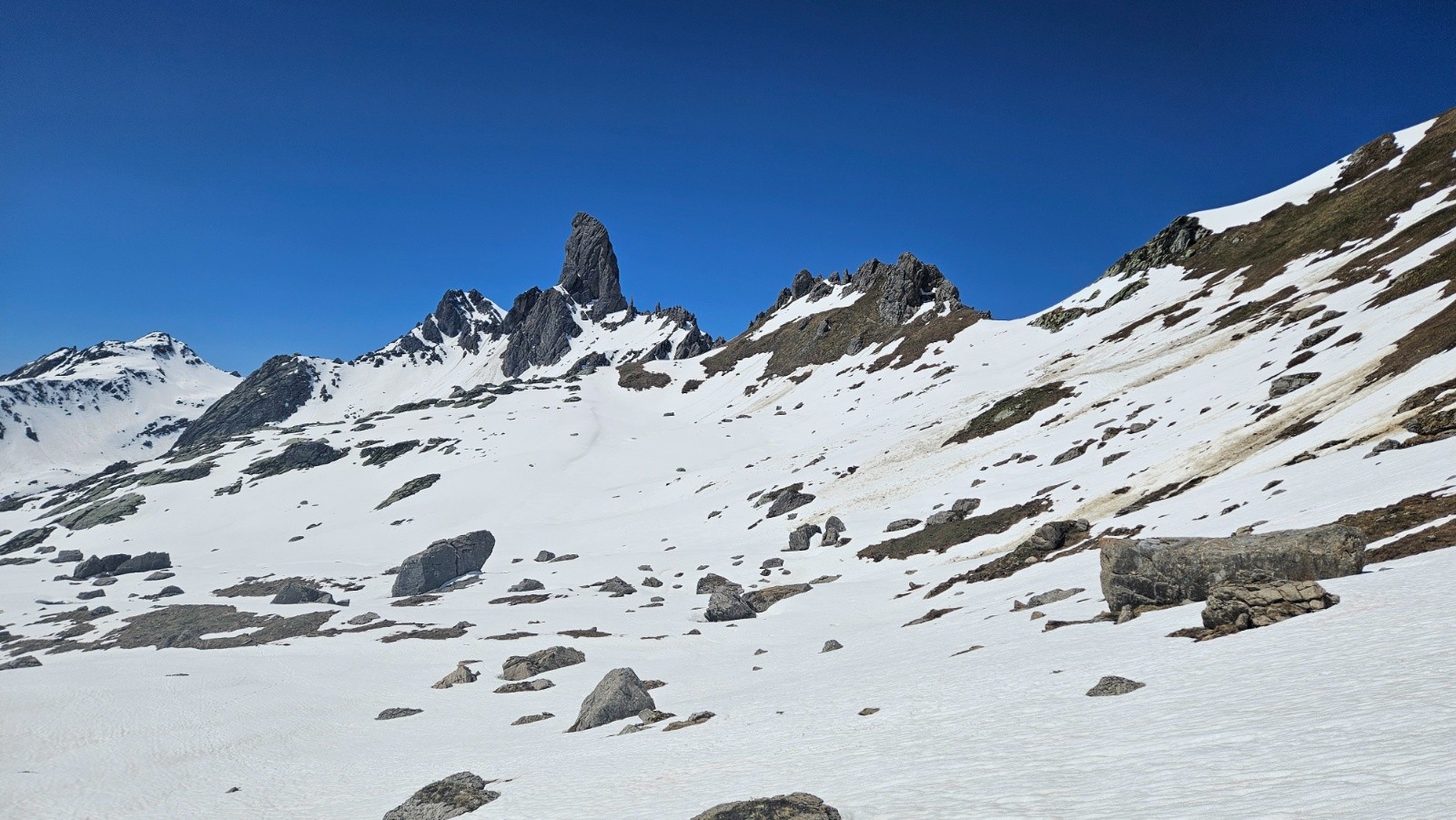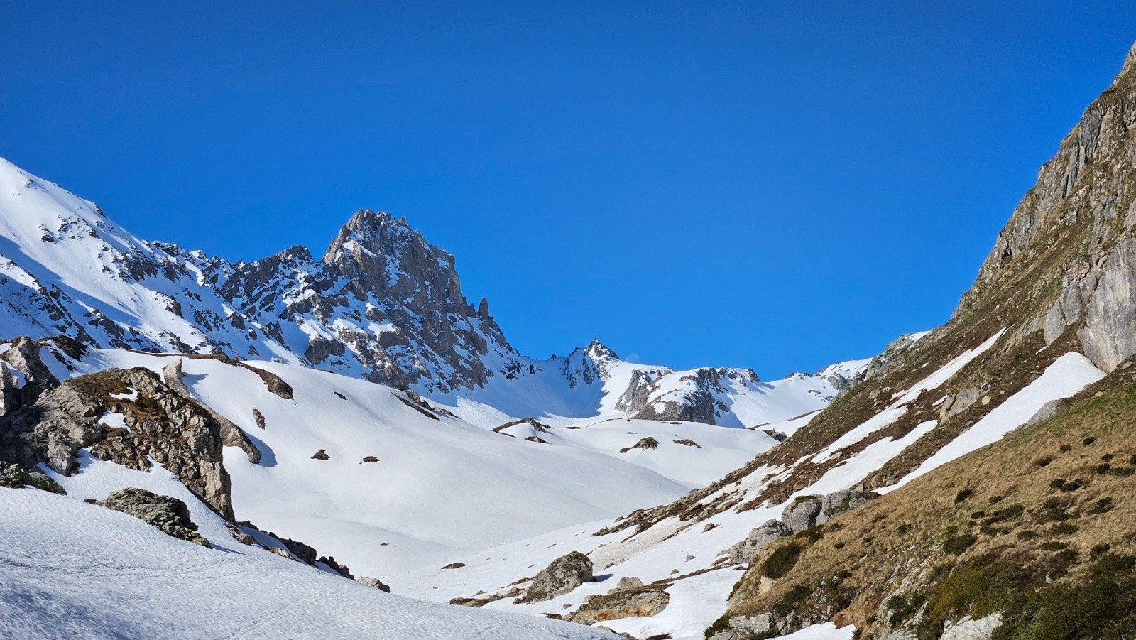 Après une journée sur glacier à haute altitude hier nous faisons le choix de la balade en mode visite au départ du Cormet de Roselend pour aujourd'hui. Au programme rien de précis, on va dans la combe de la Neuva et on avise en fonction de l'enneigement. On démarre donc à pied en prenant une piste. Rapidement on se retrouve face à des névés bien regelés. Il faudrait mettre les crampons vite fait, traverser le névé et ne plus en parler (seulement 2 névés nécessitaient les crampons, les autres ne sont pas raides) . Malheureusement ça ne se passe pas comme ça, comme Lucie monte en baskets on essaie de contourner en montant dans les broussailles et ça devient vite une belle galère. En plus tout le groupe n'est pas forcément d'accord sur une poursuite ou un demi tour pour skier dans le vallon d'Arpire. Galères et tergiversations nous mènent finalement à rester sur le plan initial après une énorme perte de temps. On finit donc par chausser au bout de la piste avec les couteaux. Après un petit déchaussage on les enlève et on n'aura plus besoin de les remettre.