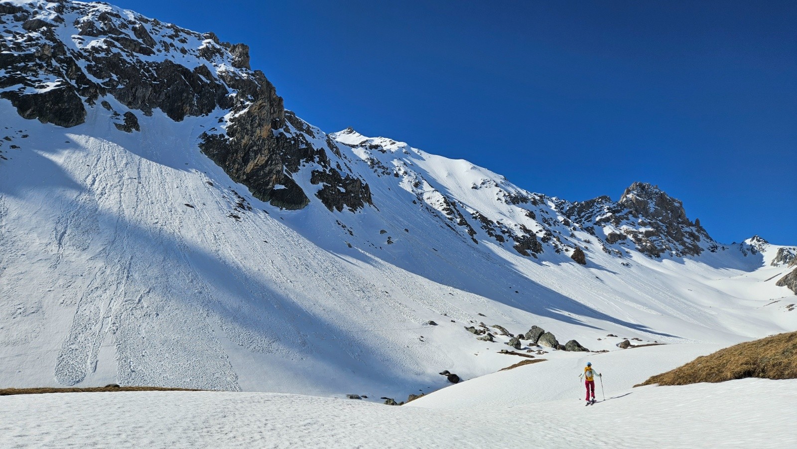 On recolle les peaux pour enchainer avec le col du Grand Fond, fini les bêtises de jeunes, je finirai la journée avec le groupe. Le temps et le paysage sont tellement nouveaux et extras il faut en profiter tranquillement. Après quelques efforts on arrive au col, la neige est bonne des deux cotés. On décide donc de basculer de l'autre coté et de descendre jusqu'au refuge de Presset et d'aviser ensuite. Encore une très bonne moquette et un grand sourire sur les visages. Tout le monde continue de descendre jusqu'à 2300m à peu près, Lucie et moi avons continué jusqu'à 2150m. En dessous ça ne vaut plus le coup...