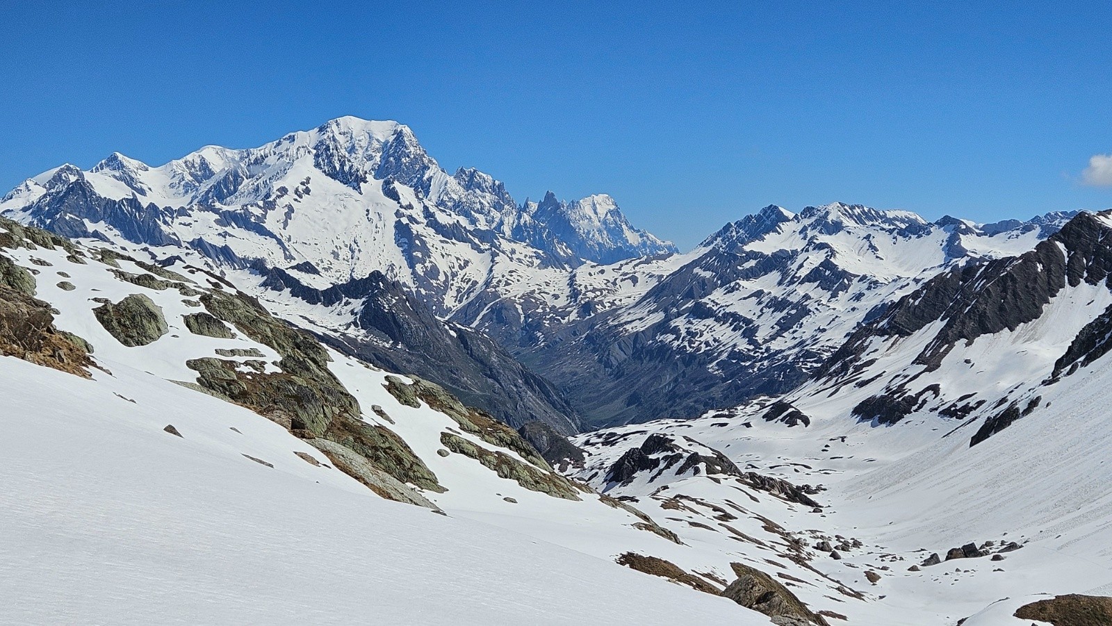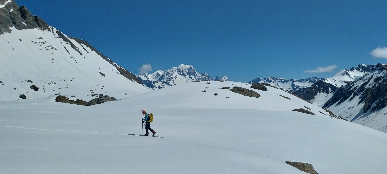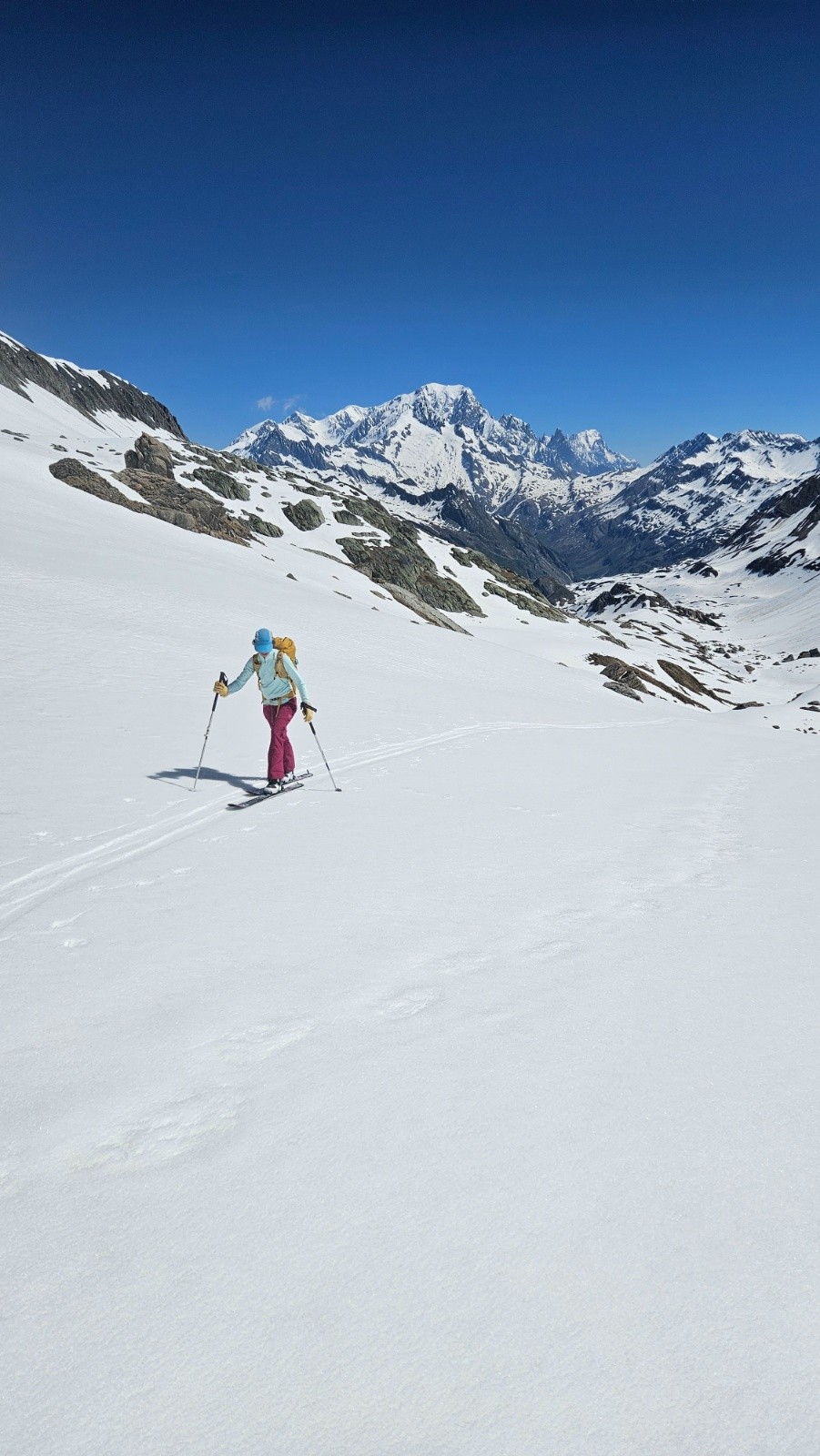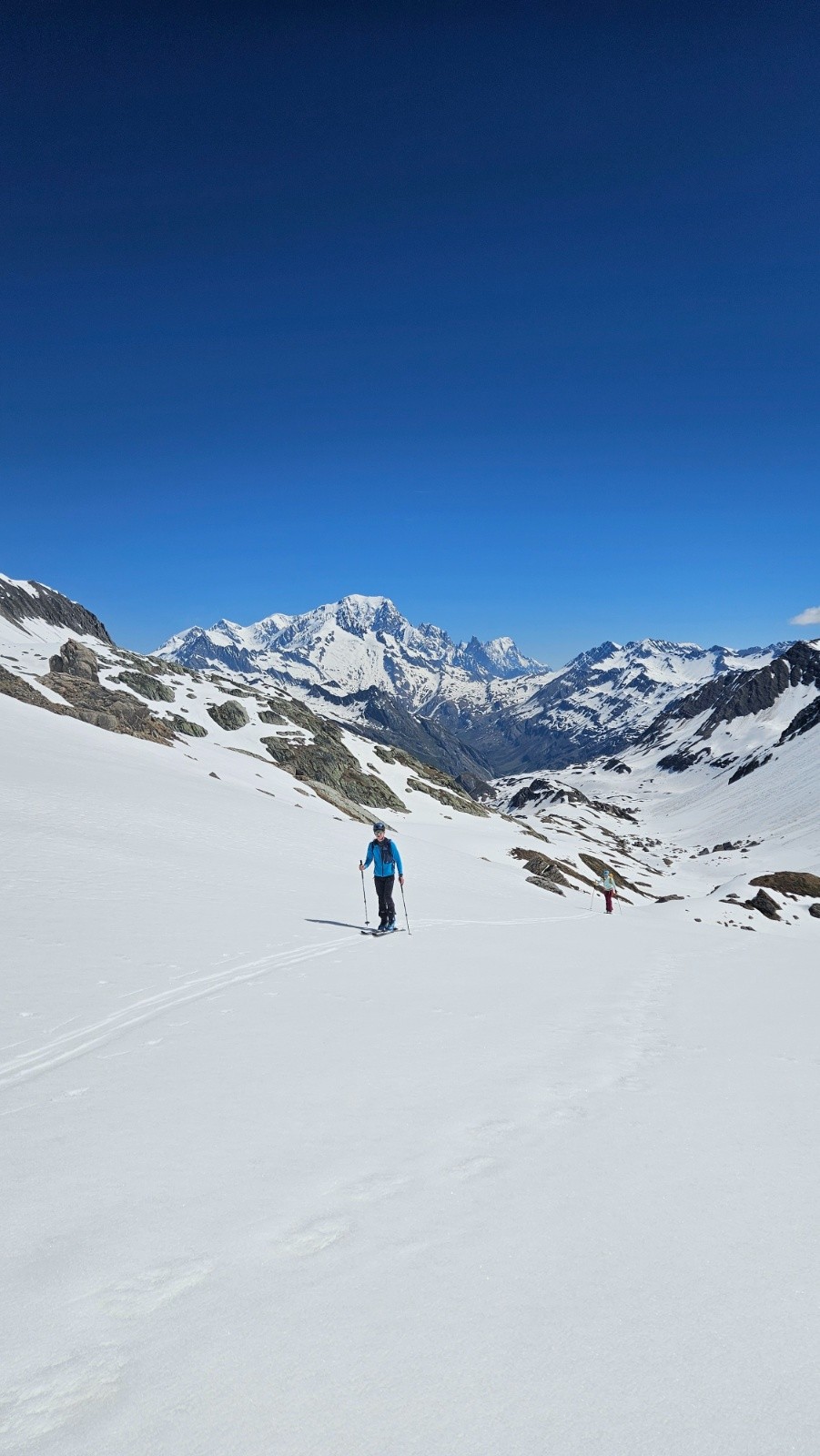 Le vallon est magnifique, le Mont Blanc couvert comme hier mais il finira par vite se dégager. Par contre c'est très long et relativement plat. On oublie rapidement les faces sud bien sèches et les faces nord bien dures et en boulettes. Pour une première descente on choisit donc de monter à la brèche de Parozan déjà bien au soleil. Je me mets à fond pour les 200 derniers mètres pour faire deux fois la descente qui à l'air super bonne. A la montée je perds un max d'énergie en passant par une vielle trace qui zippe beaucoup, en plus il fait très chaud, je dégouline de transpiration comme ça m'arrive très rarement. Une fois en haut j'attaque la descente du même coté, c'est excellent. La neige est bien revenue et la pente parfaite pour en profiter. Je recolle les peaux pour remonter les 200m que je viens de descendre. Lucie, Sandra et Aymeric sont encore au milieu de la montée, je vais tenter de me raccrocher au train avant l'arrivée, ce n'est pas gagné🤔. Je ripe beaucoup moins maintenant que la neige est tassée mais je reprends tout de même une belle transpirée et j'arrive finalement à revenir au niveau d'Aymeric et même de le doubler au sprint juste sur la ligne d'arrivée pour le faire sourire😁(je me suis mis dans le rouge avec 10m de conneries, heureusement qu'on est en haut😂).