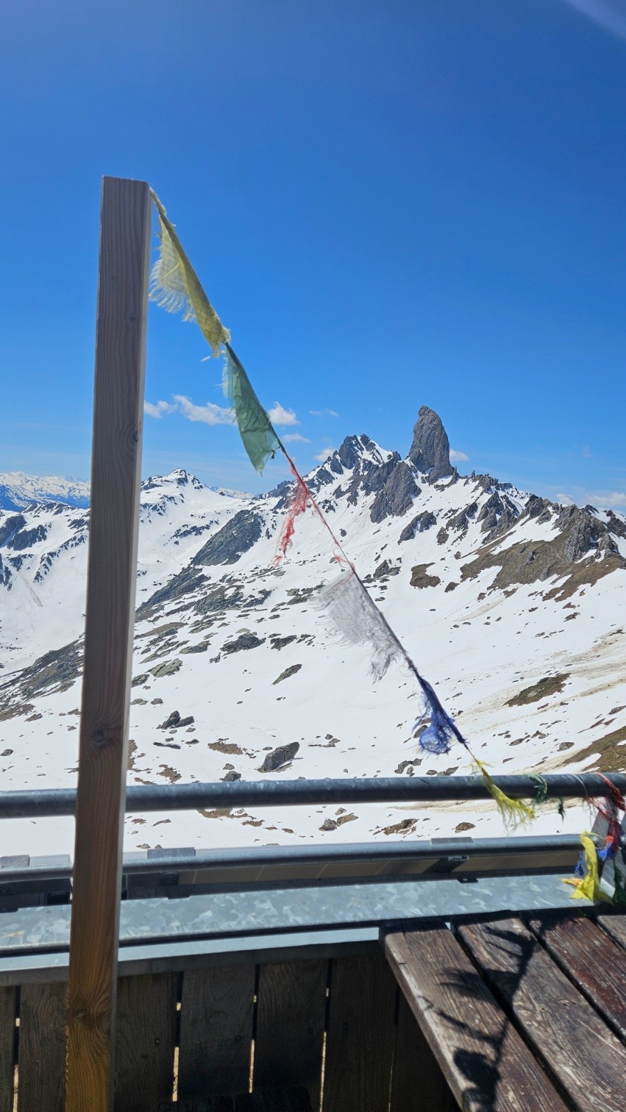 Le rendez vous des retrouvailles se fait au refuge. Après être remonté doucement avec Lucie nous arrivons au refuge, Aymeric est à la sieste, Sandra regarde la vue avec attention et les peaux bien trempées par la neige du mois de mai sèchent sur les rambardes. Ce refuge est magnifique et la vue sur la Pierra Menta est superbe ! On voit même la Barre des Ecrins tout au fond🤩.