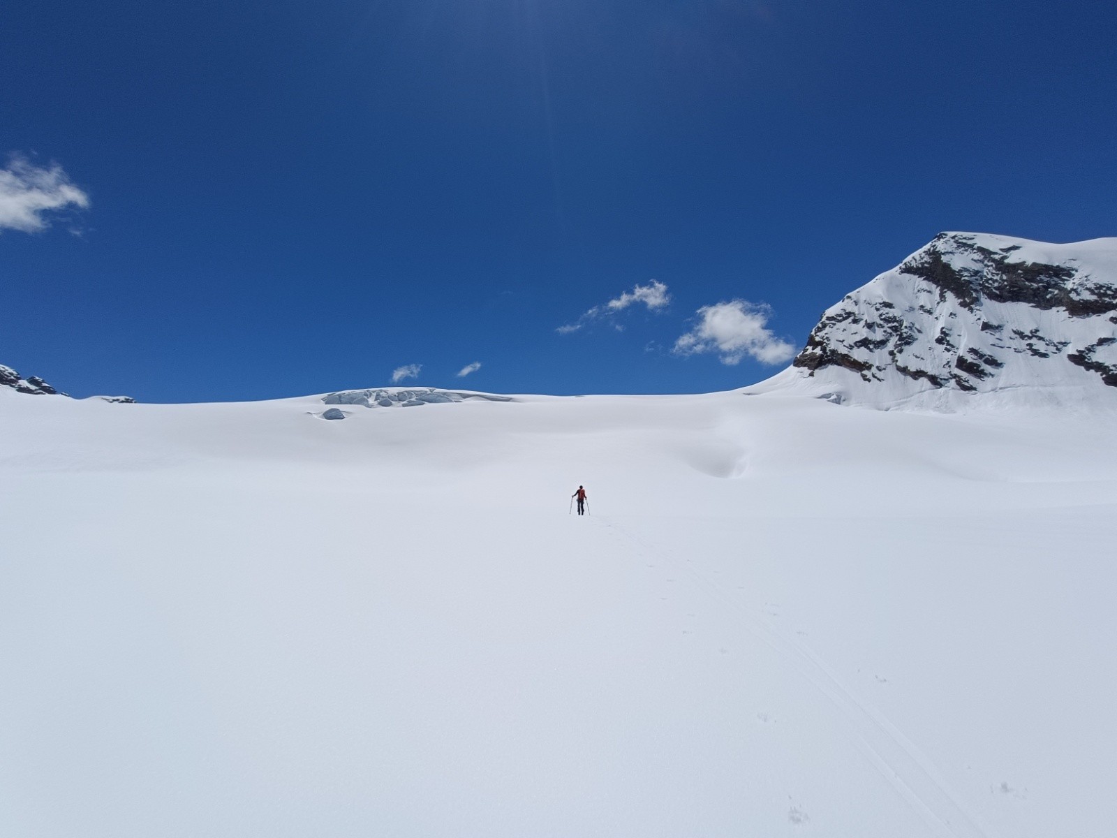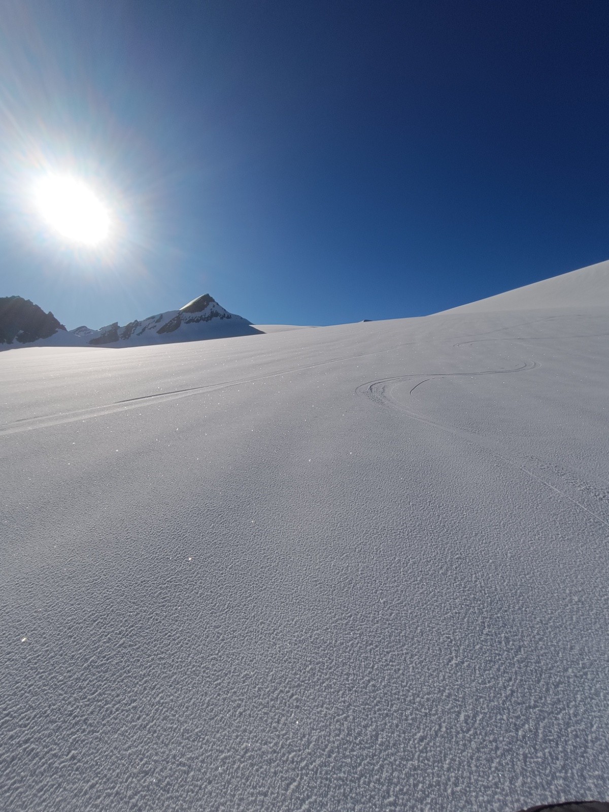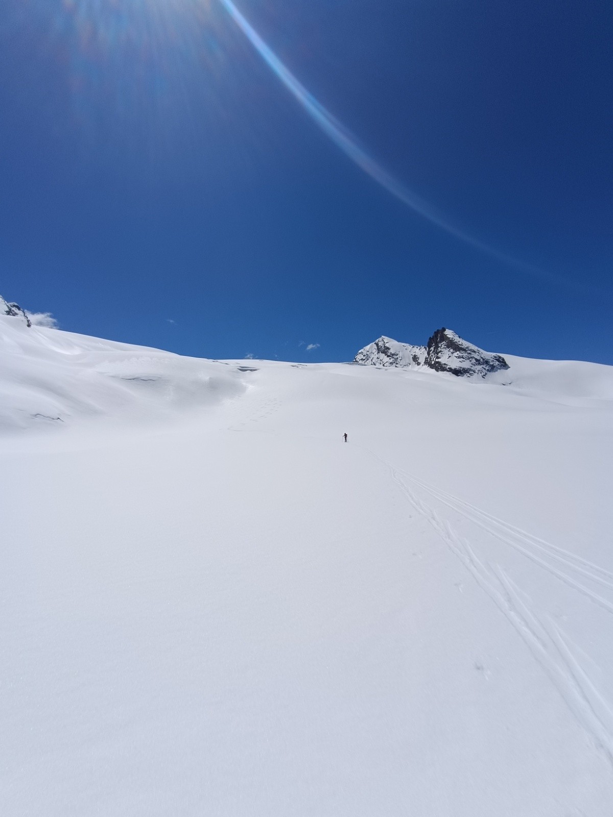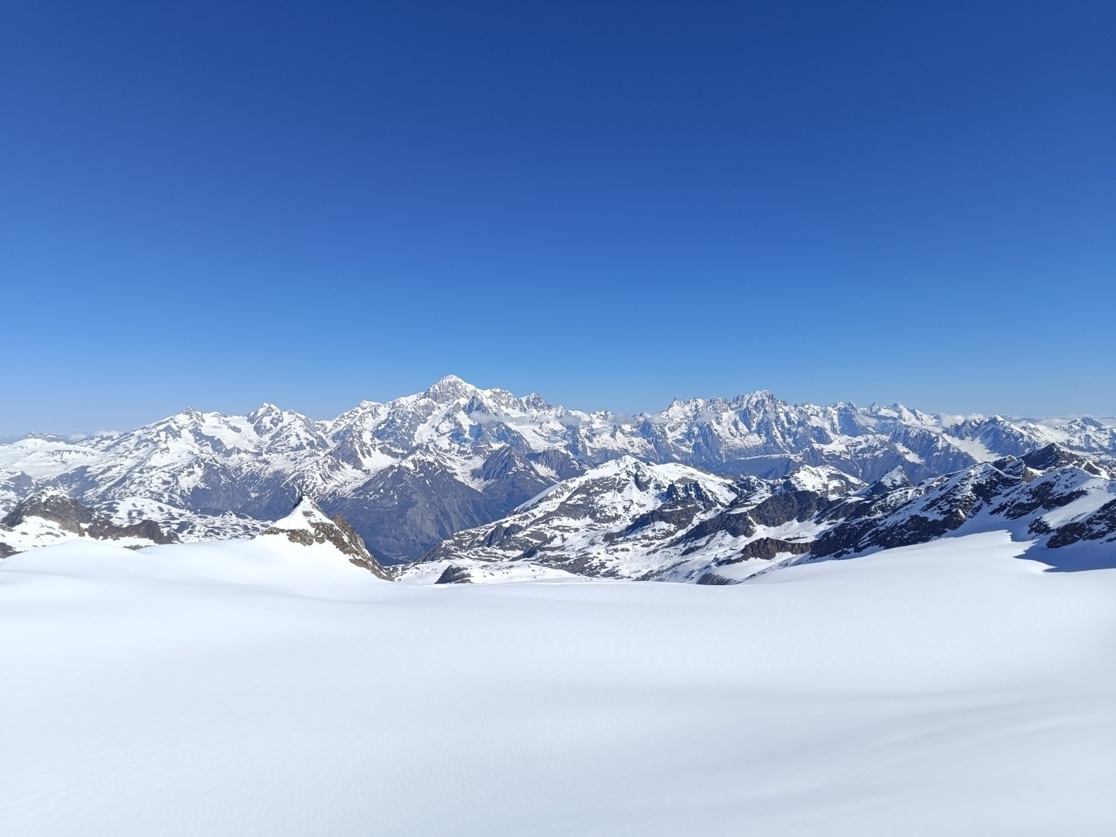 Itinéraire suivi :départ la veille pour monter au refuge avec chaussage à 1900m . Repas et dodo conforts au refuge , départ 5h et montée par col des grands et ensuite sommet du Ruitor ( vieille corde pour accéder au rocher sommital) , ensuite descente rive droite du glacier du Ruitor jusqu'à 2700m, puis remontée au col des Vedettes et descente jusqu'à l'altitude du refuge en versant nord.