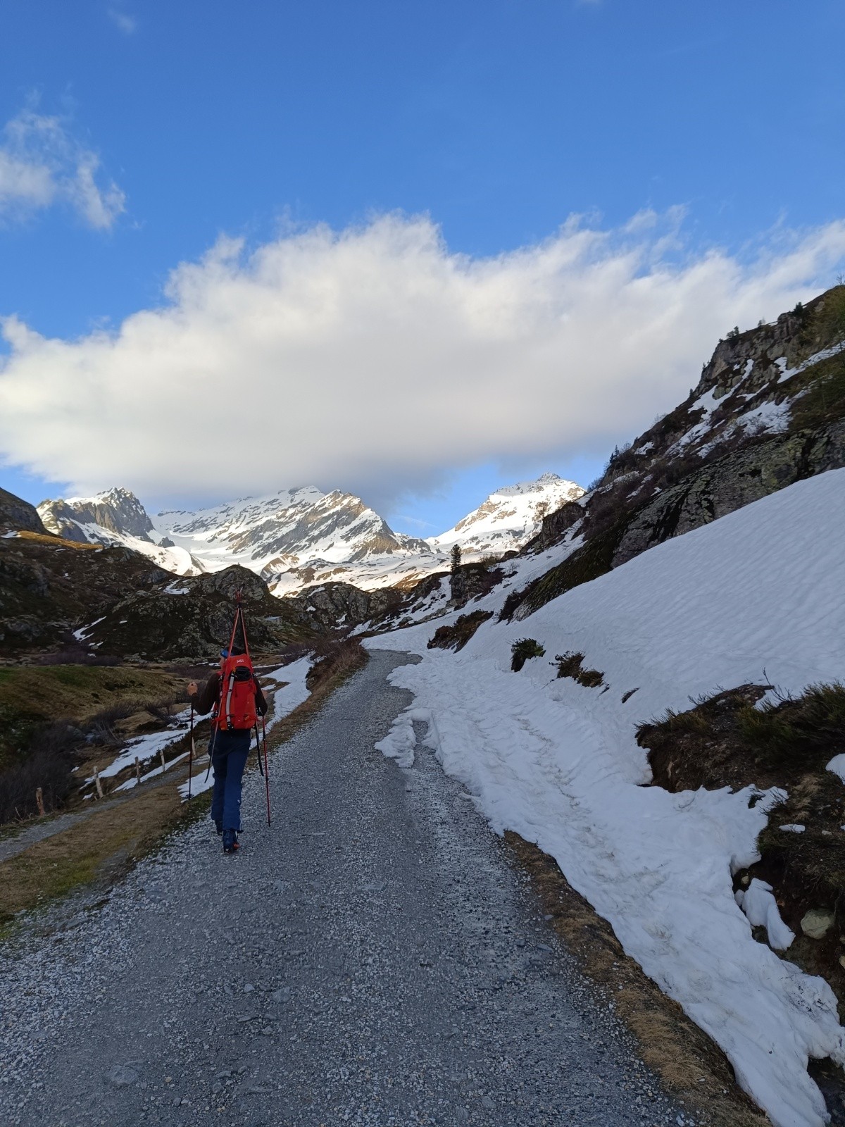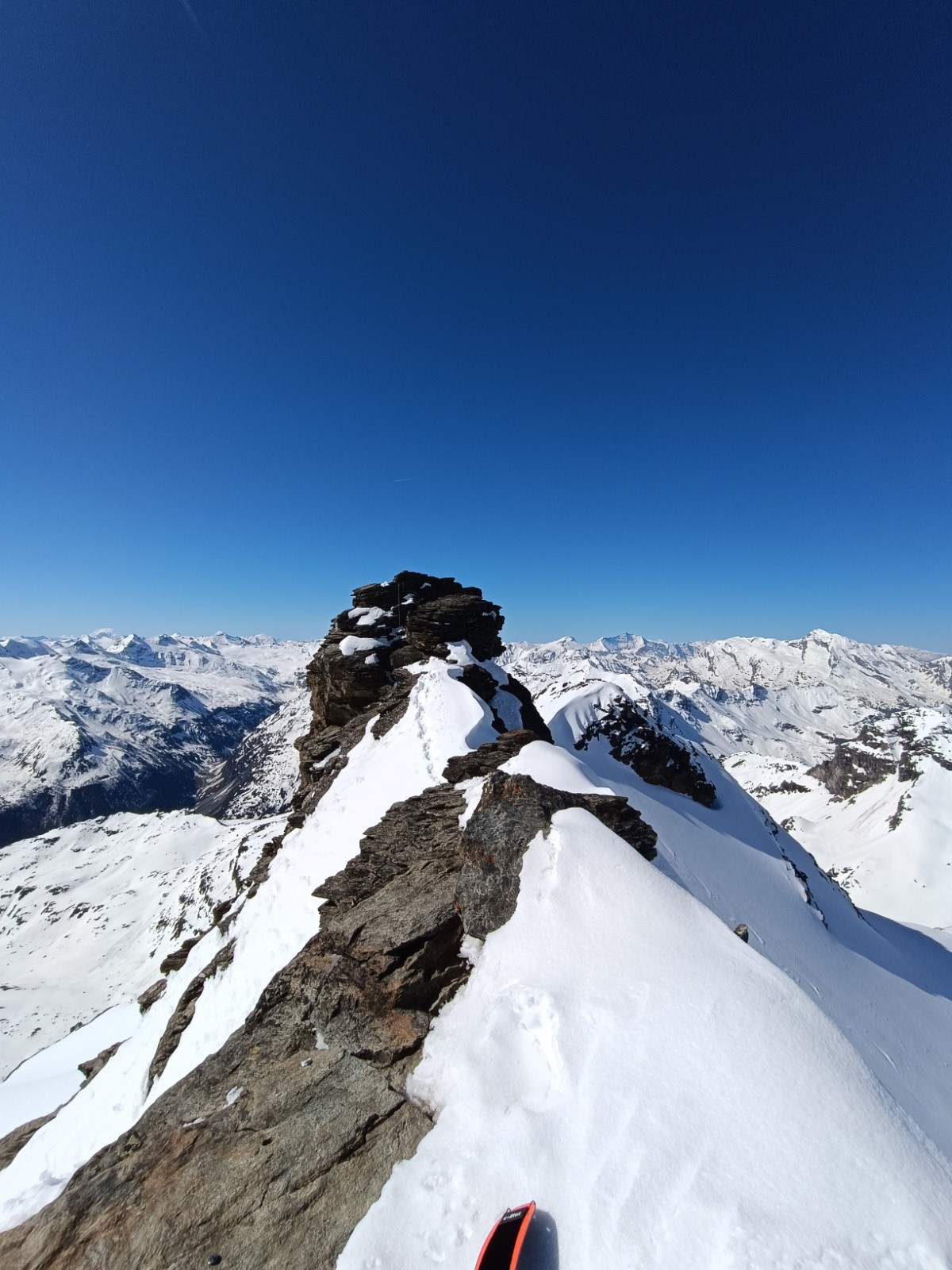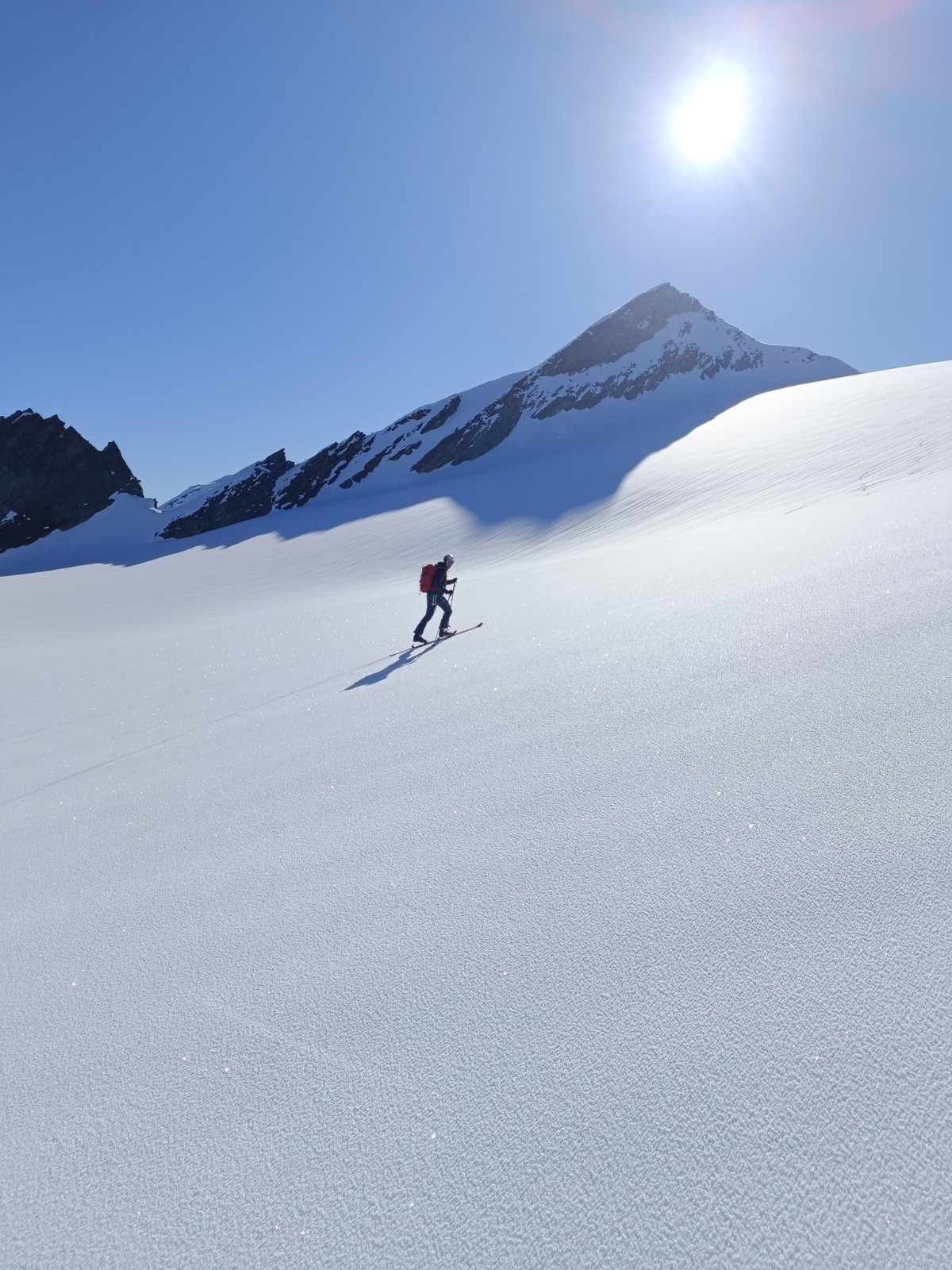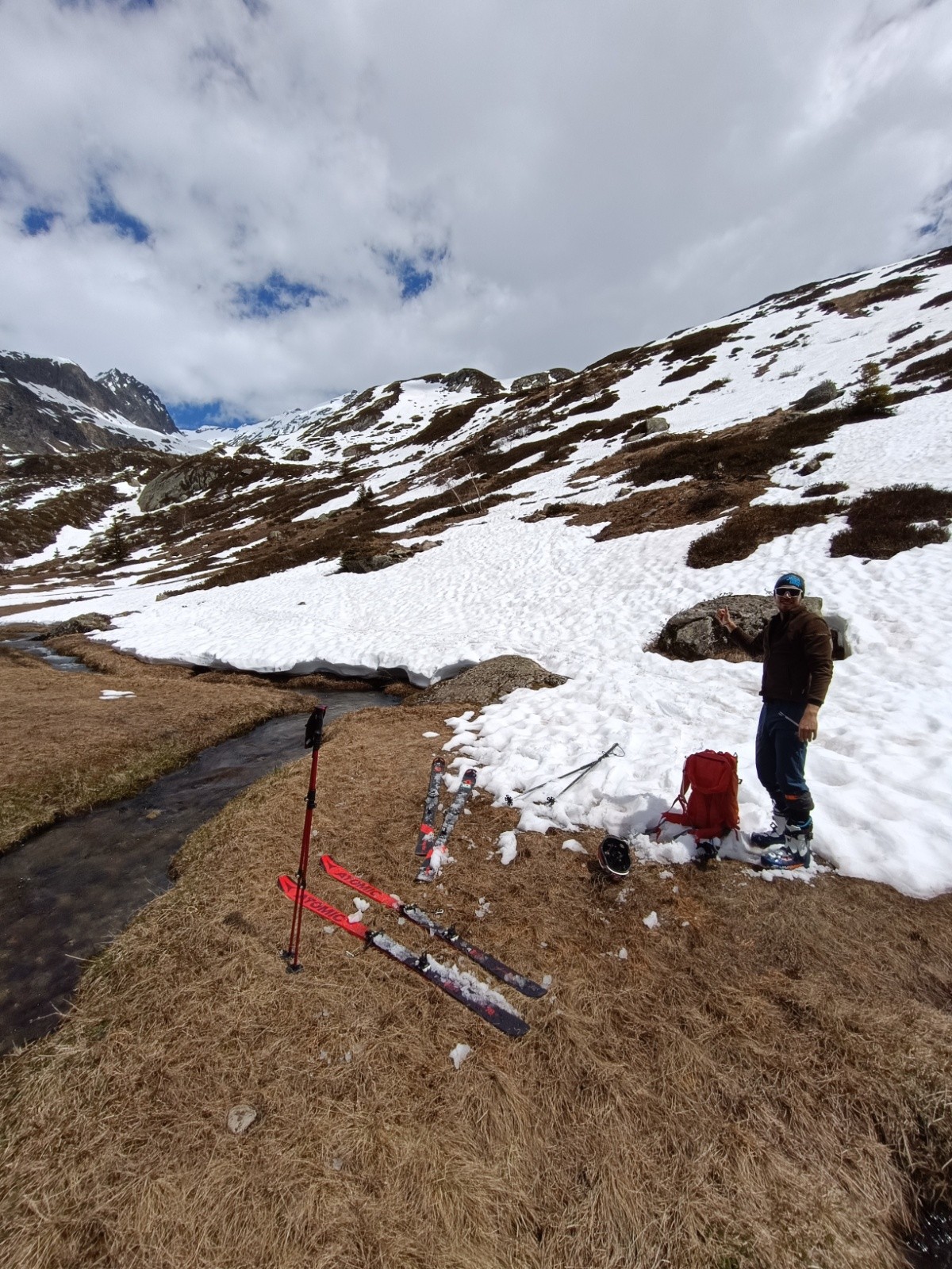 Itinéraire suivi :départ la veille pour monter au refuge avec chaussage à 1900m . Repas et dodo conforts au refuge , départ 5h et montée par col des grands et ensuite sommet du Ruitor ( vieille corde pour accéder au rocher sommital) , ensuite descente rive droite du glacier du Ruitor jusqu'à 2700m, puis remontée au col des Vedettes et descente jusqu'à l'altitude du refuge en versant nord.