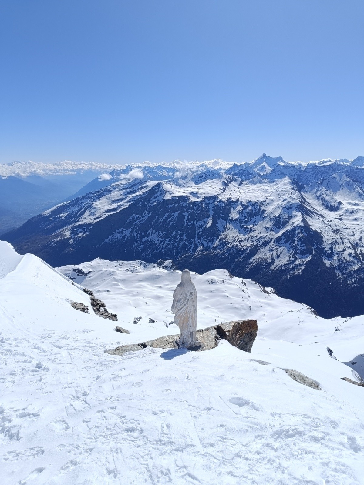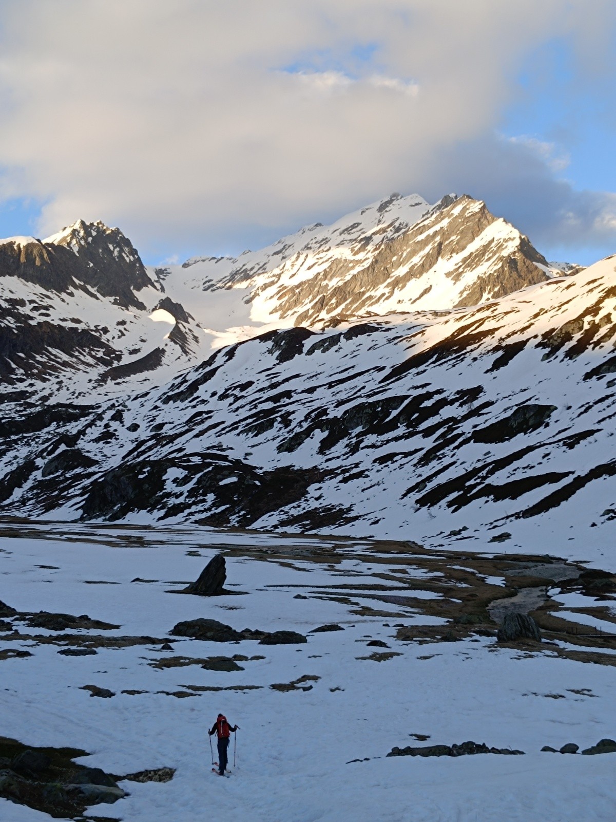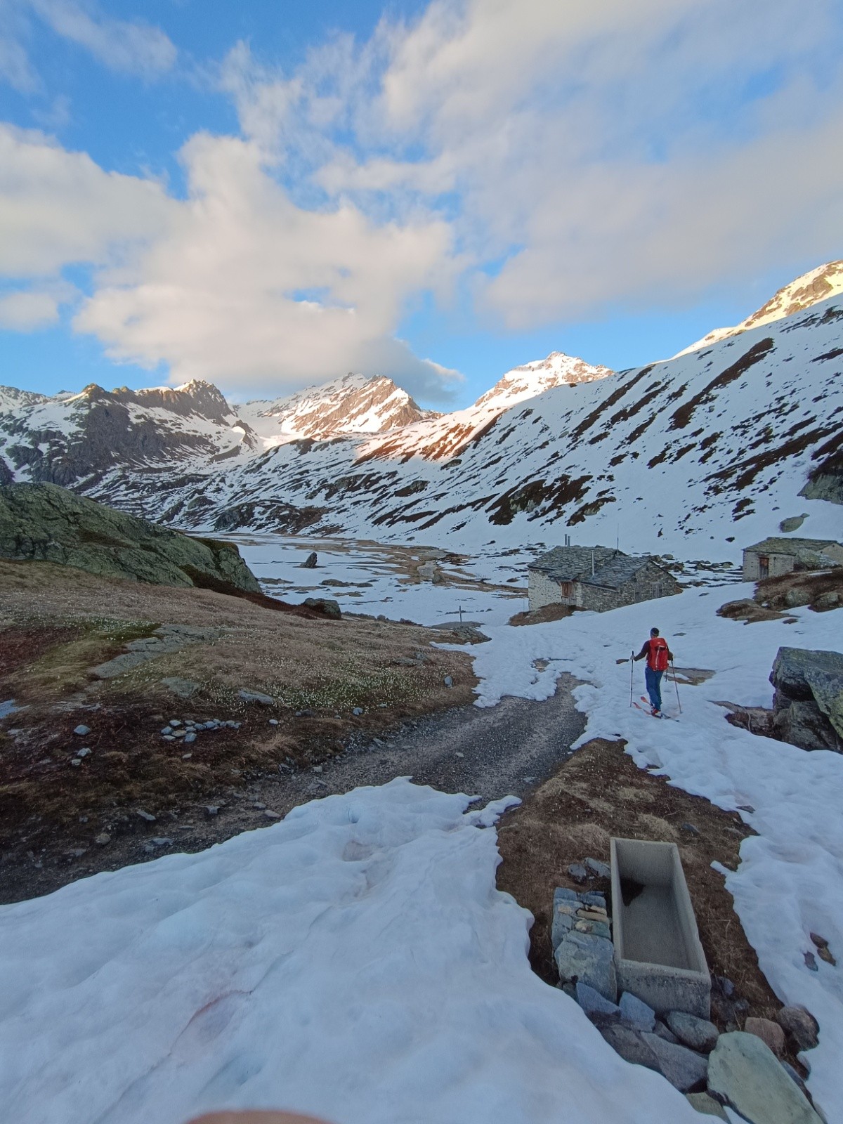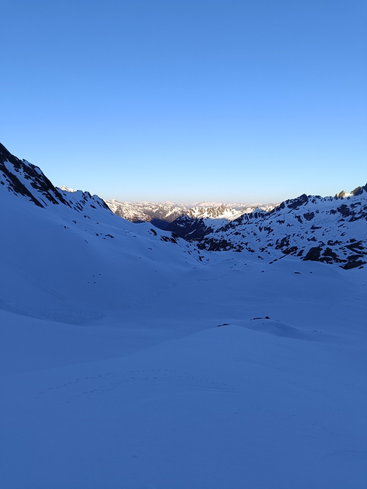 Itinéraire suivi :départ la veille pour monter au refuge avec chaussage à 1900m . Repas et dodo conforts au refuge , départ 5h et montée par col des grands et ensuite sommet du Ruitor ( vieille corde pour accéder au rocher sommital) , ensuite descente rive droite du glacier du Ruitor jusqu'à 2700m, puis remontée au col des Vedettes et descente jusqu'à l'altitude du refuge en versant nord.