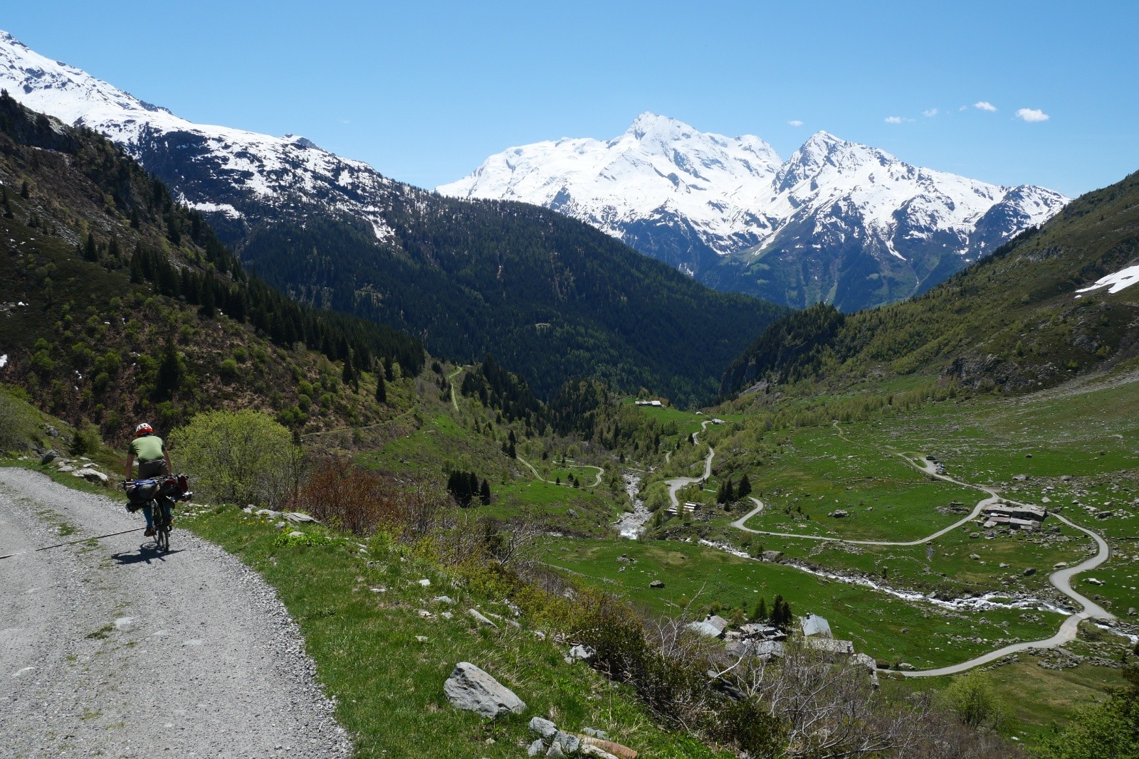 En mai, quand on ne sait pas choisir entre faire du vélo ou du ski, le plus simple reste de combiner les 2 ! Nous voilà donc partis pour le Ruitor en véloski, depuis la gare de Bourg Saint Maurice. L'avantage de faire une partie de l'approche en train, c'est que ça permet de faire des exercices de mouflage (première photo !). L'avantage de faire la suite de l'approche à vélo, c'est que ça permet de monter jusqu'à la neige et d'éviter le portage ! Bon, la montée jusqu'à la Savonne puis sur le chemin n'est quand même pas une mince affaire, c'est en gros 1000m de D+ en 10 km !