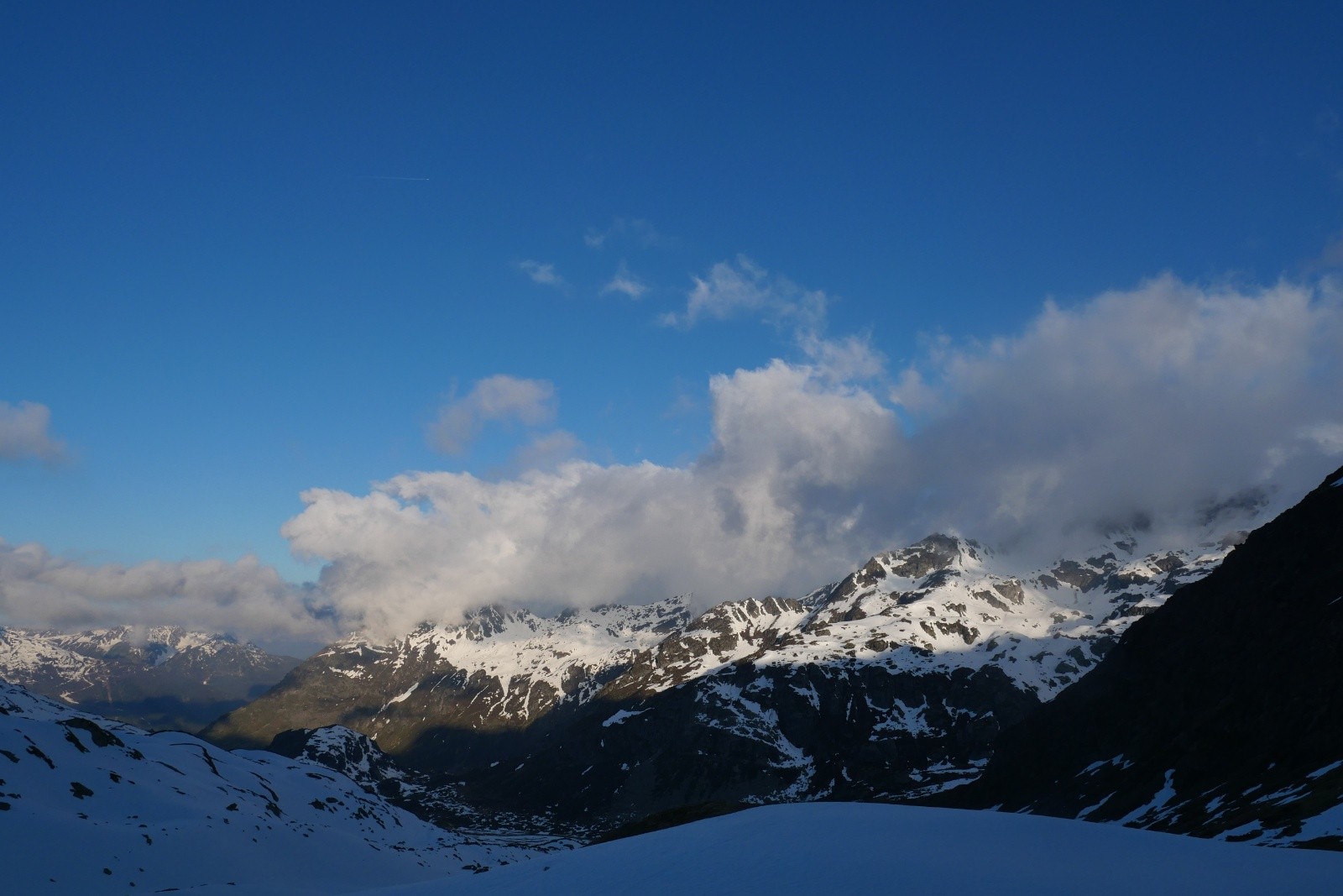 Conditions pour le ski : Poudre dans les 150 premiers mètres sous le sommet, puis moquette jusqu'à 2200 et transfo en dessous