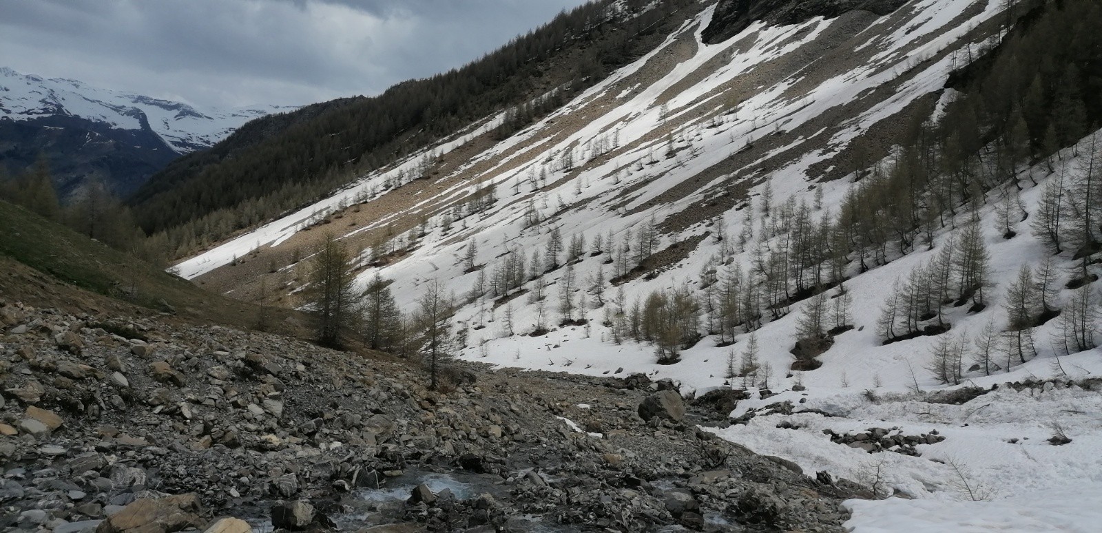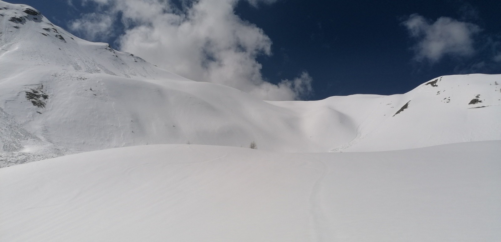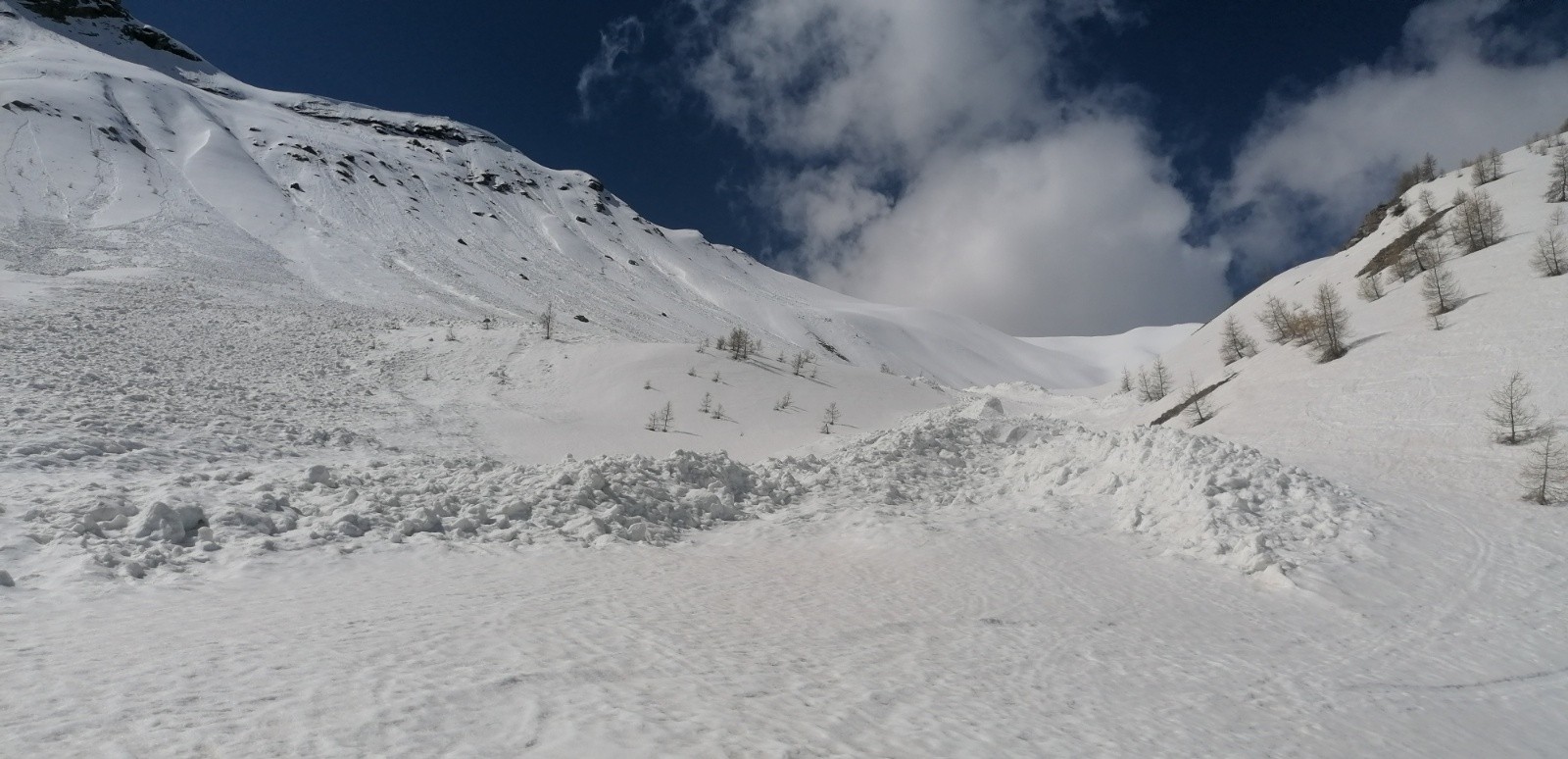 Conditions nivo et activité avalancheuse : grosse ancienne avalanche dans le vallon. Purge des faces pentues, pas d'observation d'avance durant la matinée passée dans le vallon.