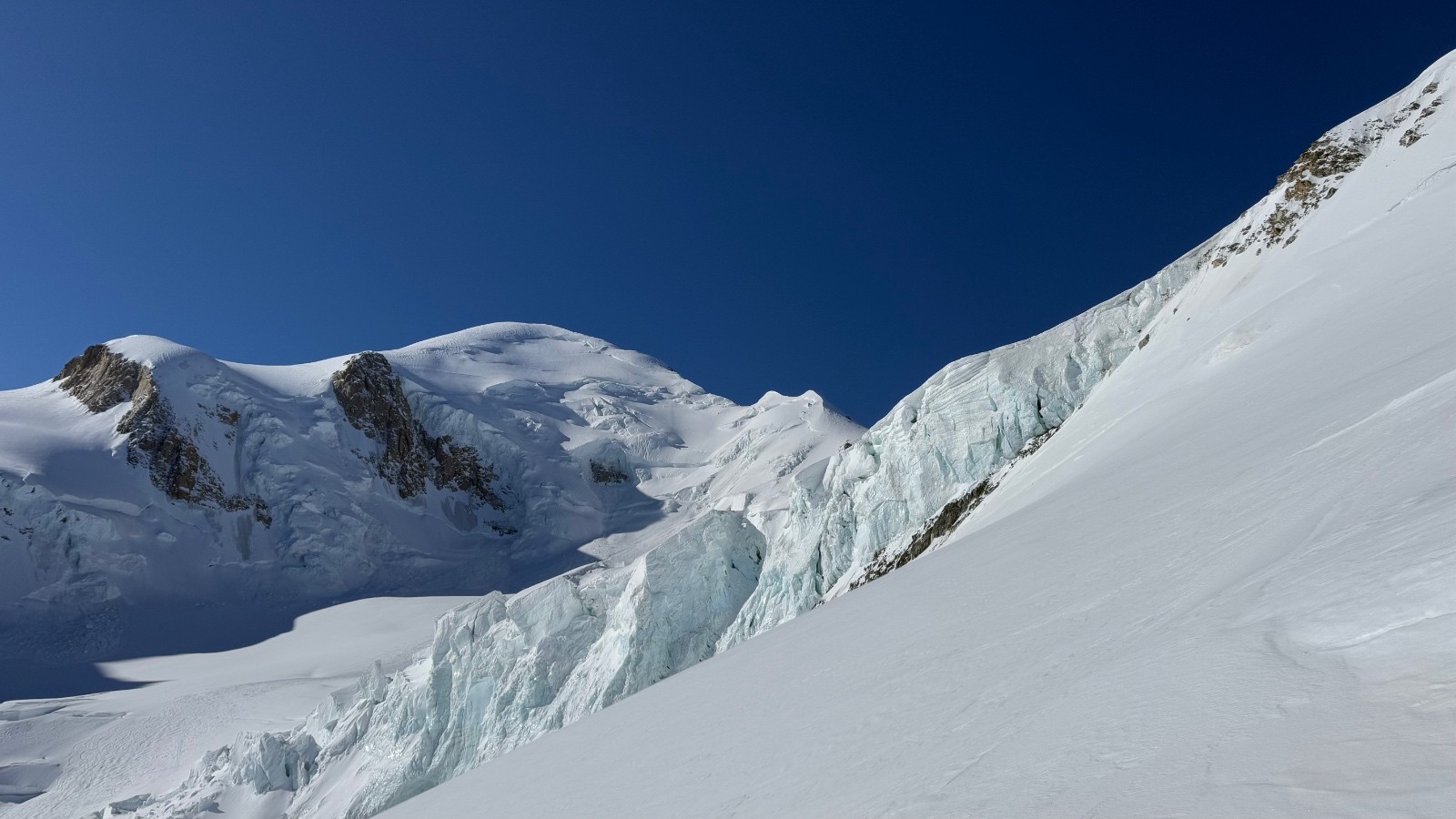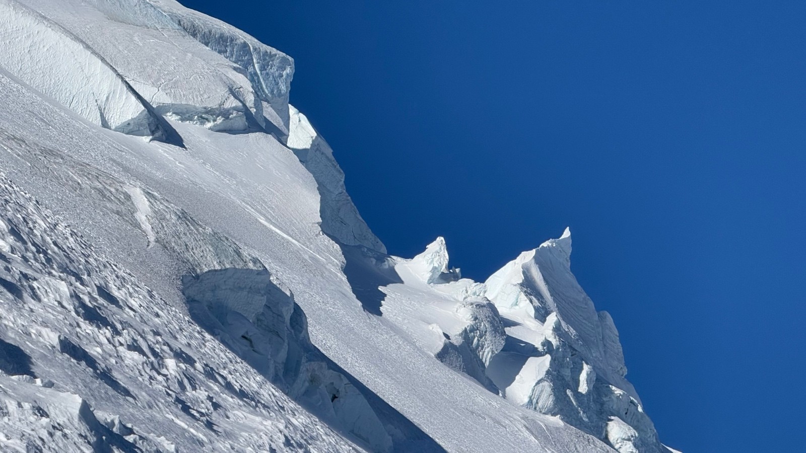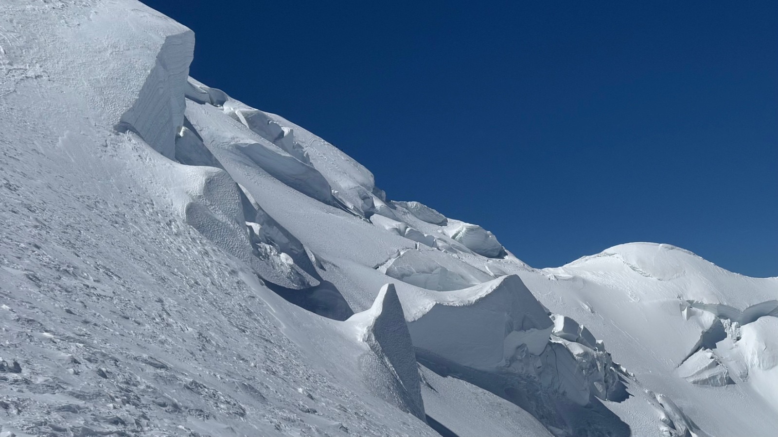 Avalanches : pas d’avalanches mais traces de nombreuses chutes de séracs, balayant le bas de la face Nord, le passages sous les grandes montées, et une imposante chute sur les petits plateaux. Cette dernière ne fait vraiment pas rire, on a un amoncellement de glace sur à peu près 100 mètres de large, recouvrant tout le petit plateau.