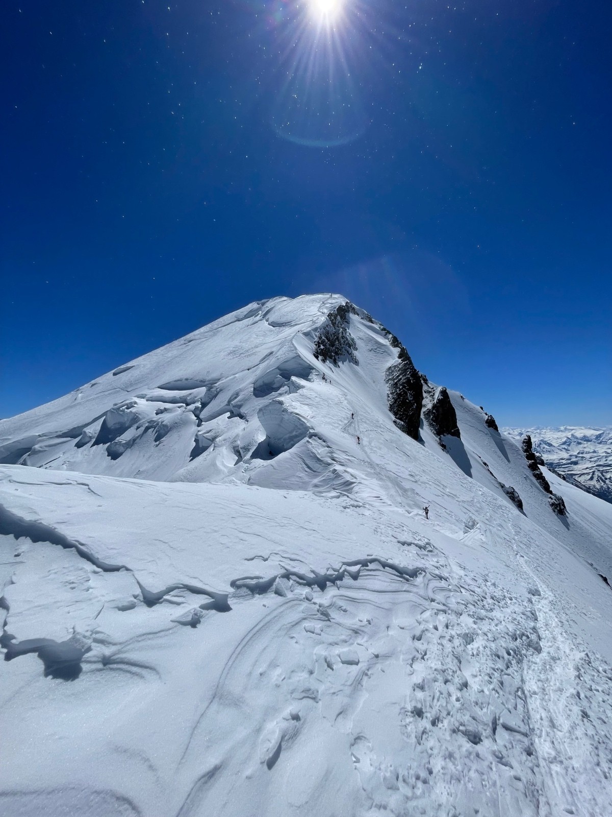 Un tour au Mont-Blanc, ça devient le classique de fin de saison. Profitant de l’iso assez bas (annoncé à 2500 par météo Cham), et voyant que le vent allait baisser à partir de 10 - 11h, nous avons opté pour un départ tardif. Le calcul était bon, nous avons pris quelques petits coups de vent sur l’arête des bosses et eu un peu froid dans le descente de la face nord mais pas plus. Malheureusement, à la descente, il était trop tard pour un décollage parapente pour Thomas. On était assez tranquilles aussi jusqu’à Vallot où nous avons rattrapé quelques cordées.