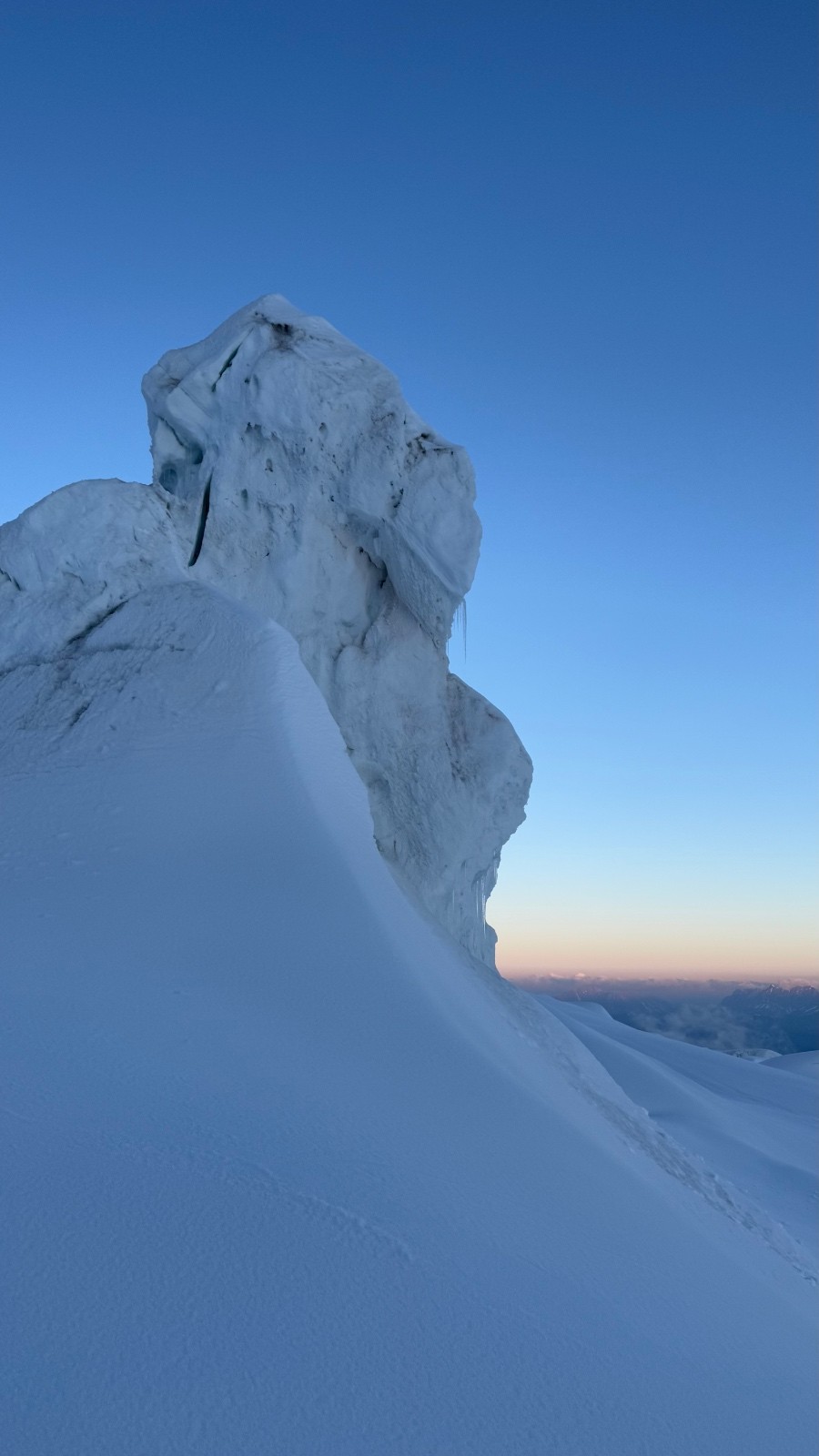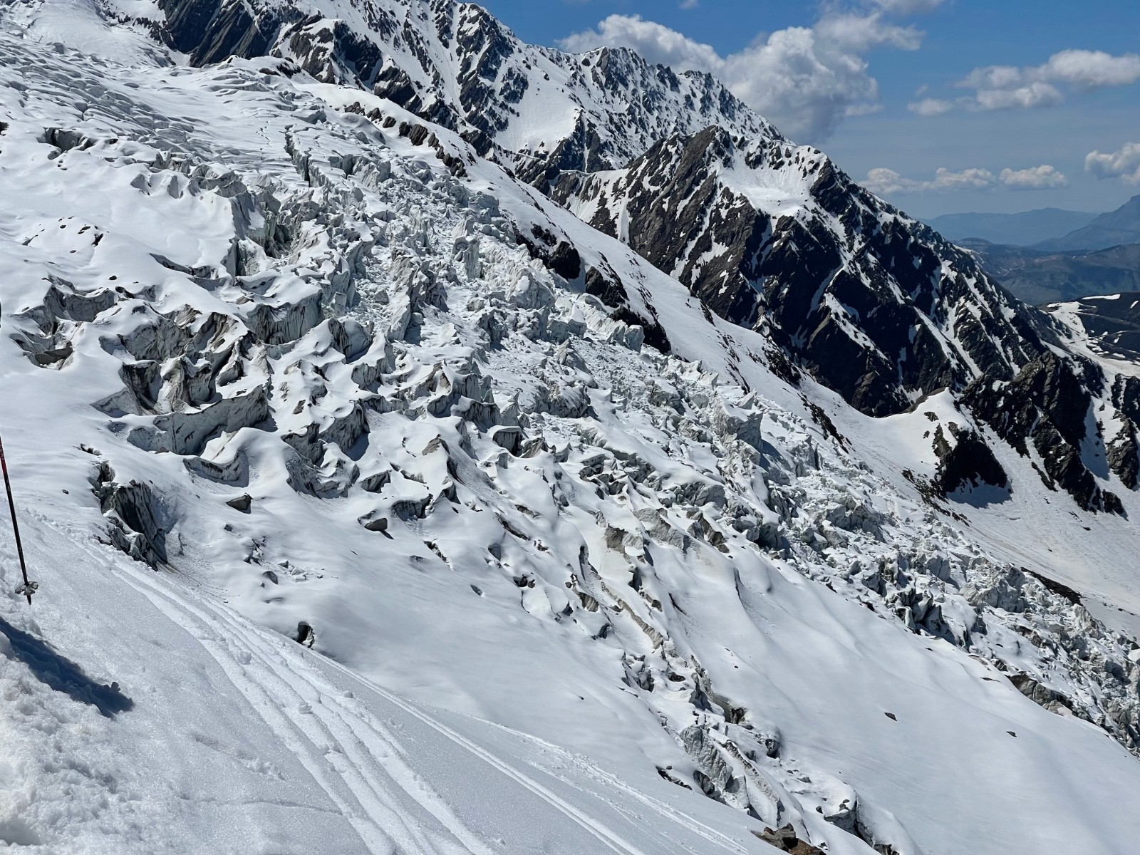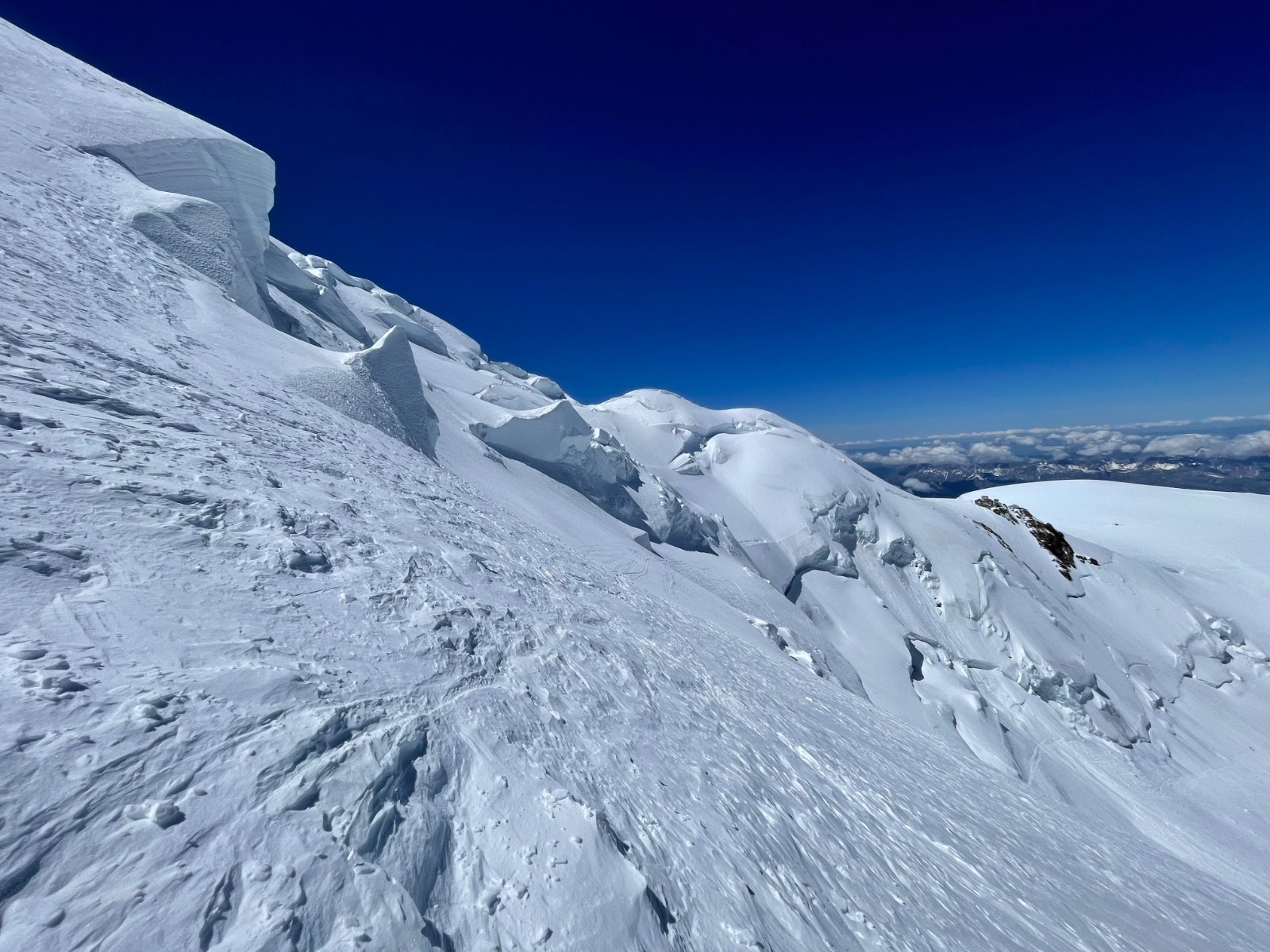 Enfin, une grande lucidité et prudence s’impose sur la descente, car les traces des nombreux passages s’approchent très près des crevasses et des séracs, sans doute l’une des causes de l’accident de ce jour.