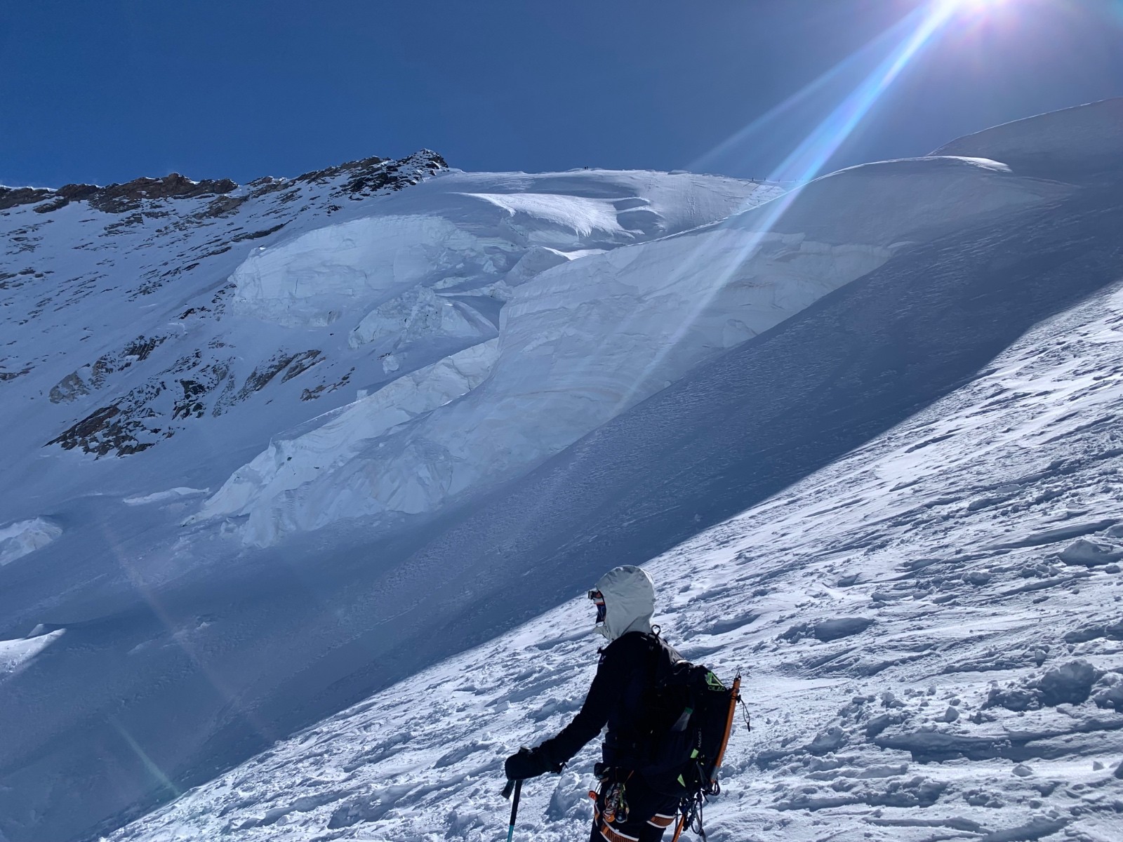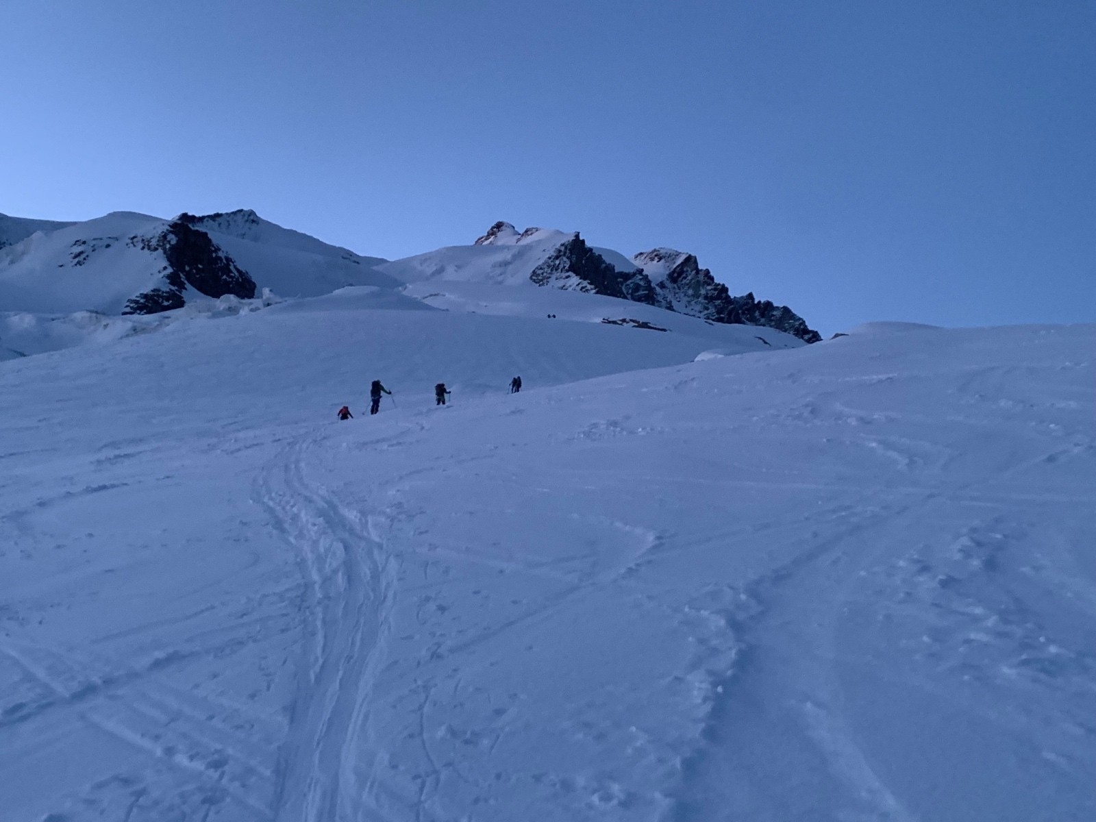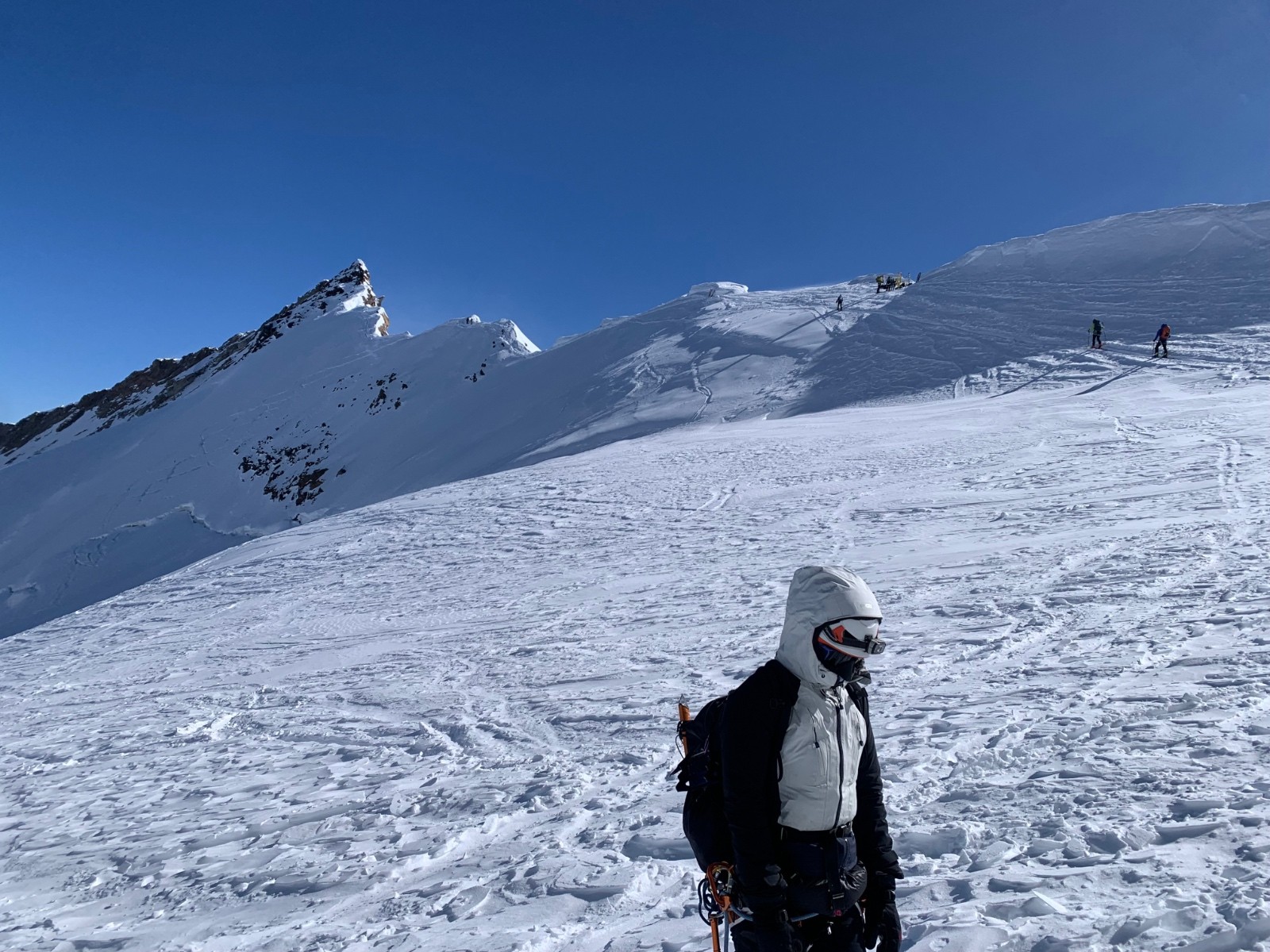 La dernière montee vers le nordend est encore plus froide, tous les skieurs font ce qu'ils peuvent pour se réchauffer les mains.