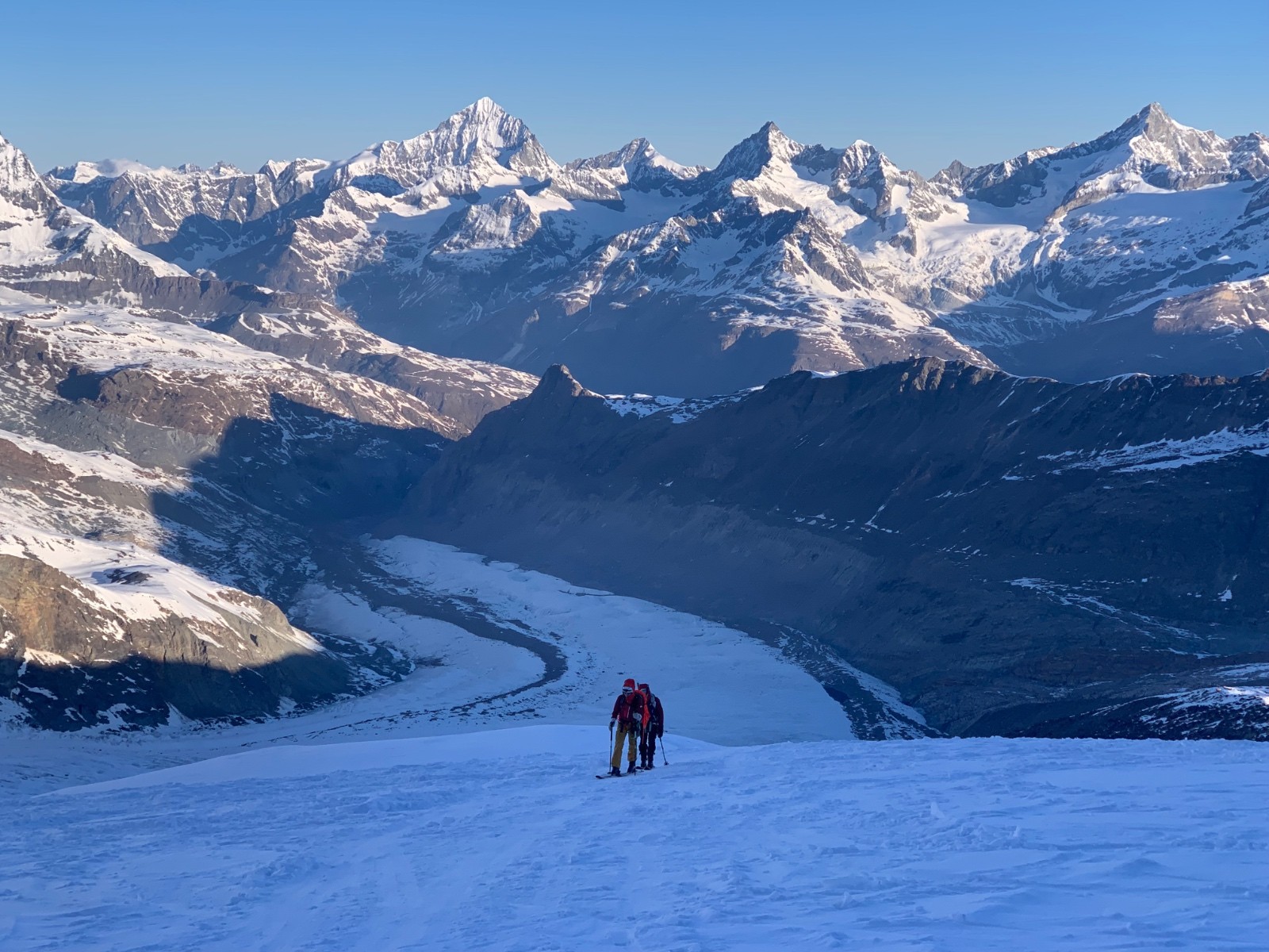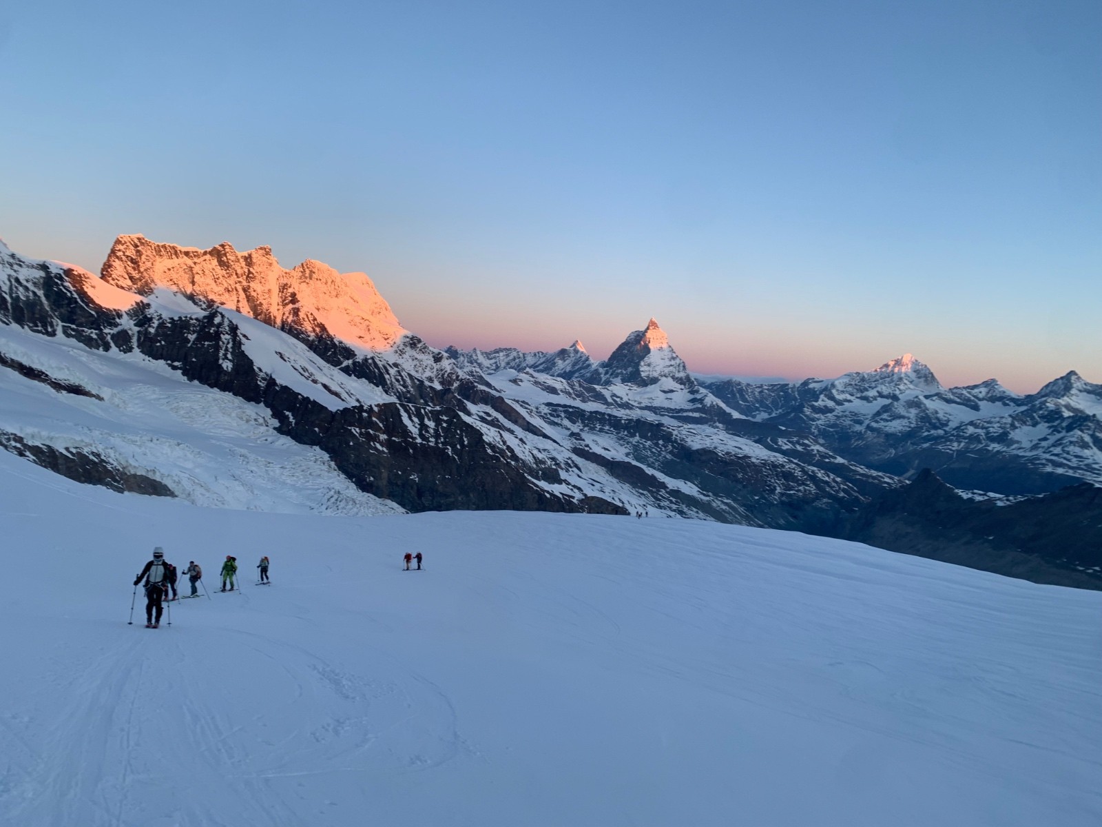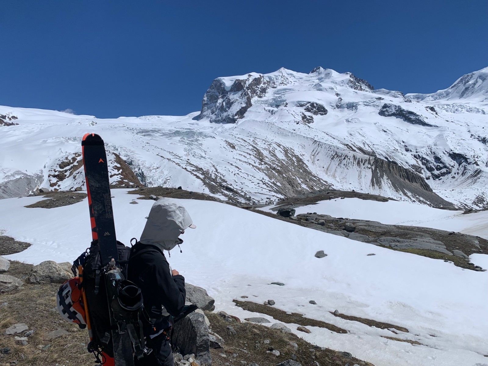 La dernière montee vers le nordend est encore plus froide, tous les skieurs font ce qu'ils peuvent pour se réchauffer les mains.