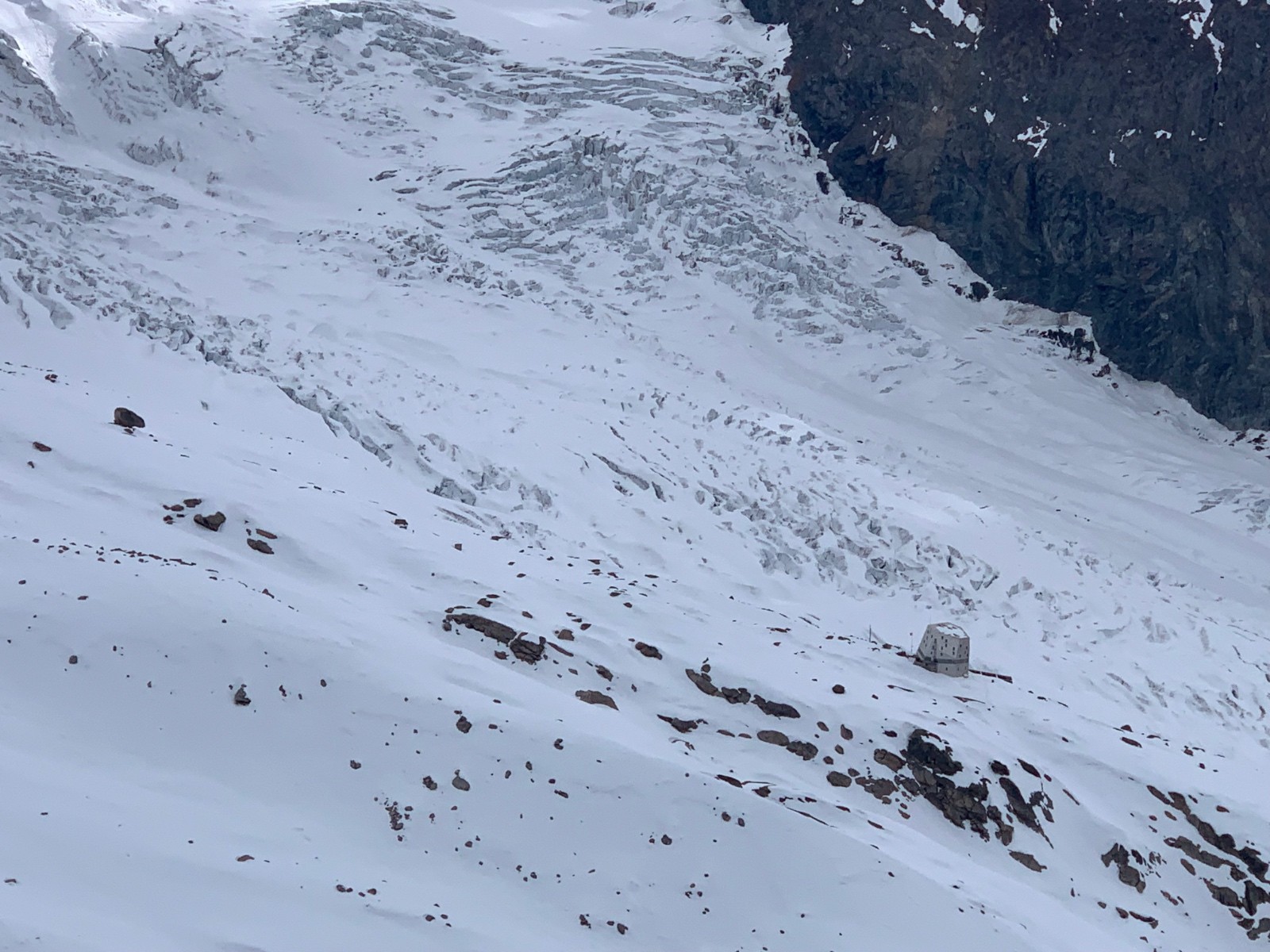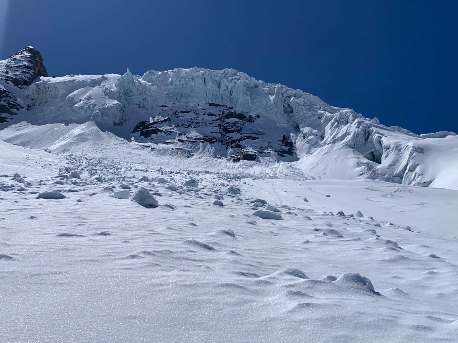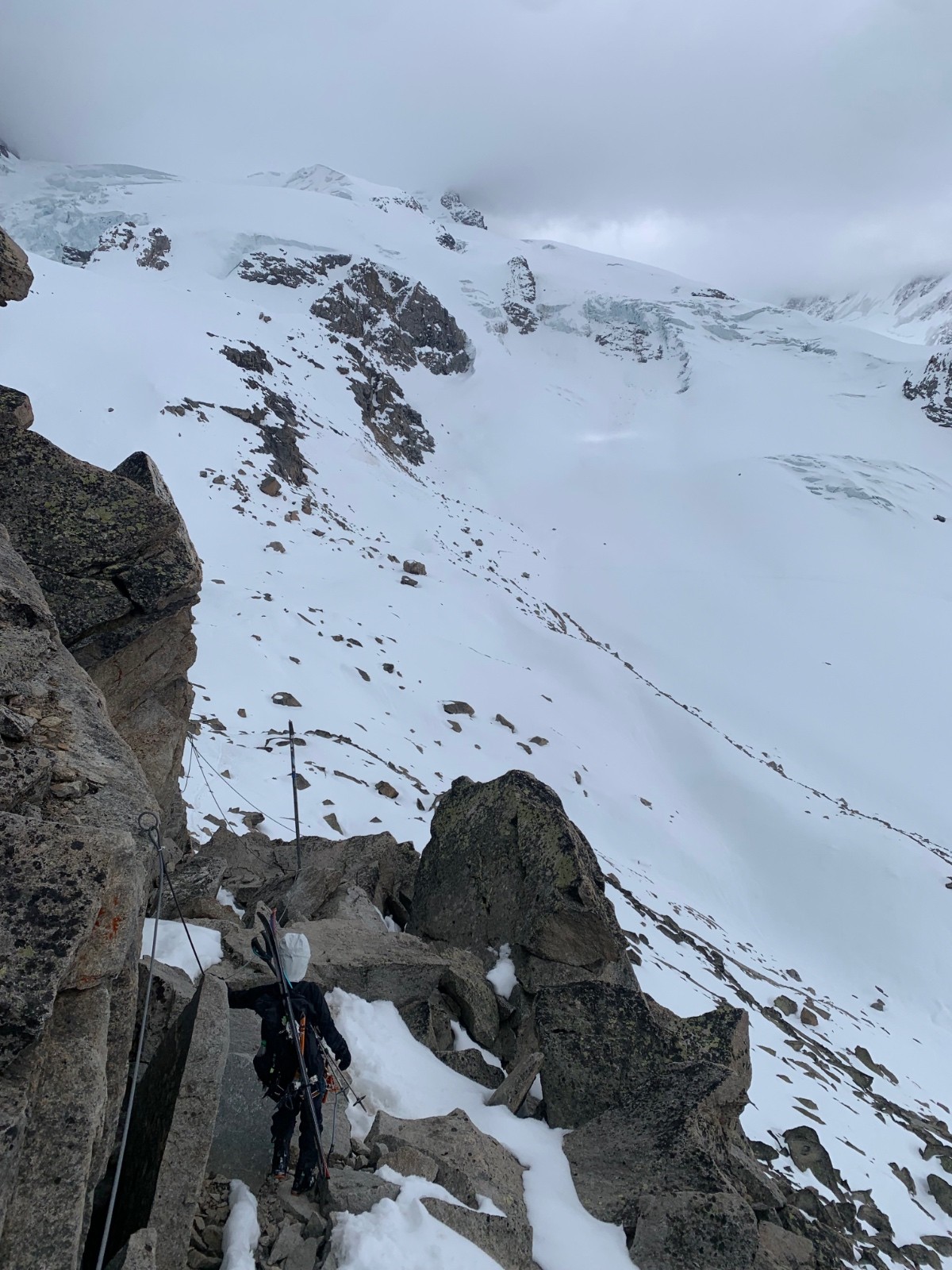 Déjà assez frigorifiés malgré l'équipement intégral en arrivant à l'intersection Dufour/norden, on fait le choix de se rabattre sur la norden, afin d'éviter les manips de rappels qui nous paraissent impossibles à réaliser avec ce froid.