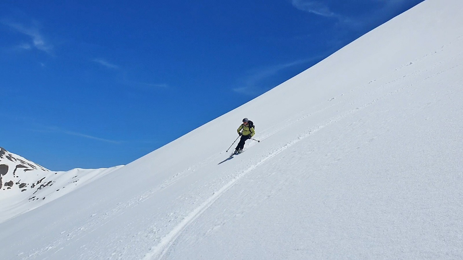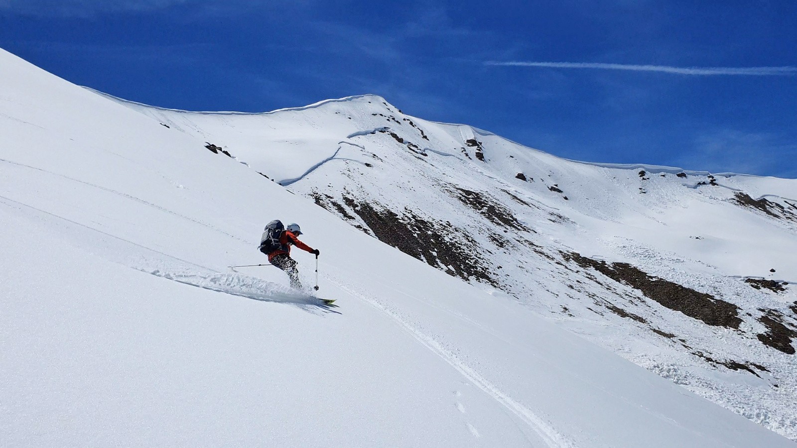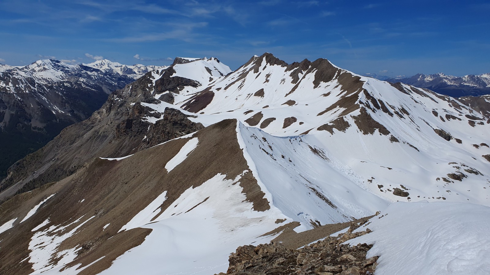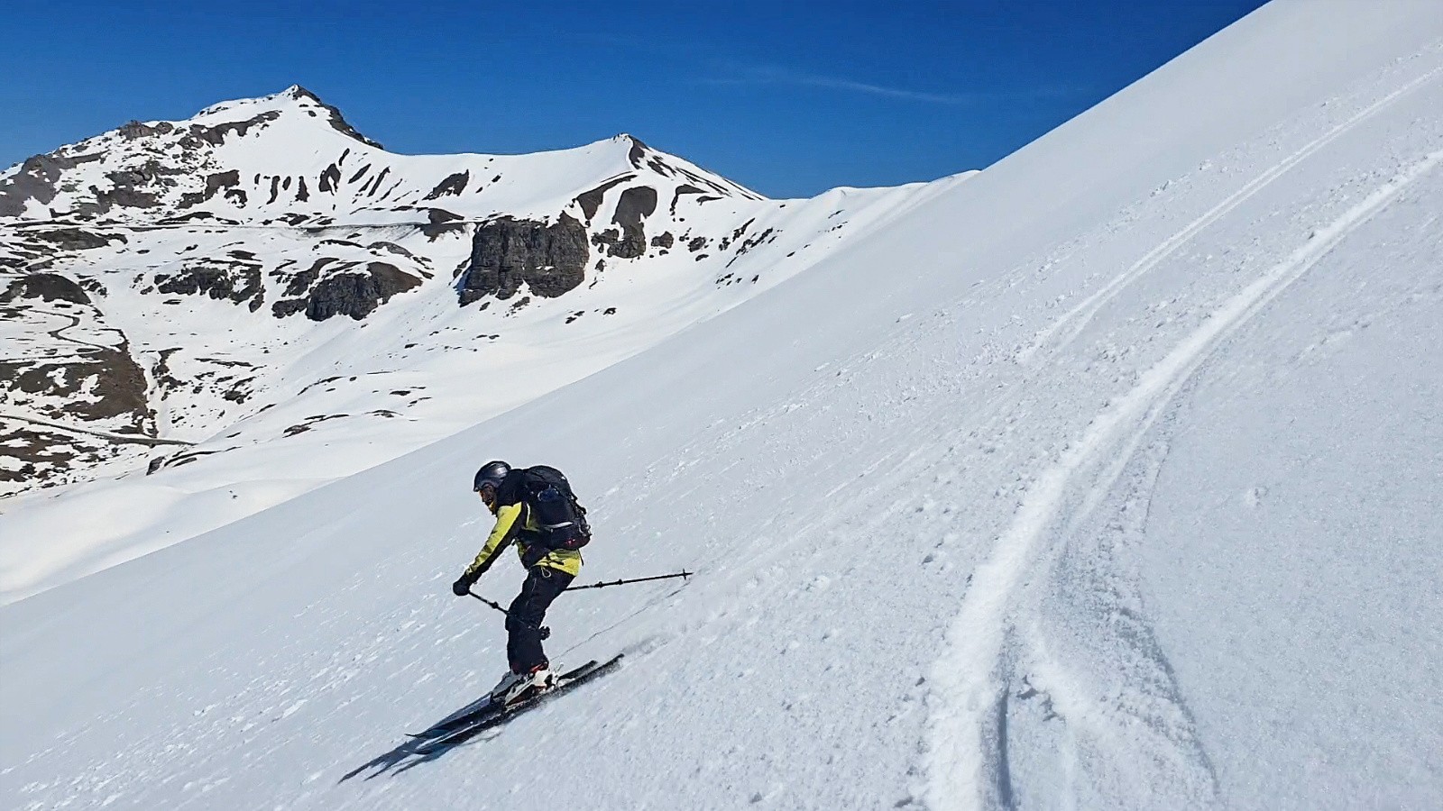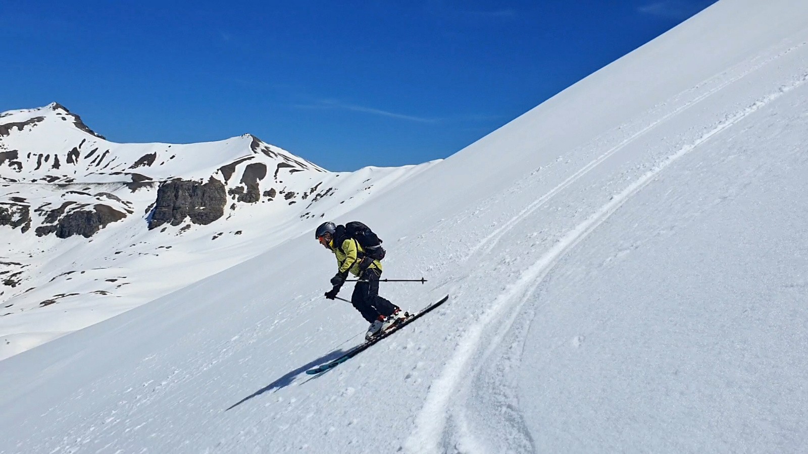 Pour ce clap de fin, on profite de l'ouverture du Col de la Bonette pour bénéficier du très bon enneigement sur les versants Nord de la Bonette, sans portage, comme souvent en fin de saison, secteur Cimes du Chevalier et du Caire Brun, aux pentes soutenues idéales pour le ski.