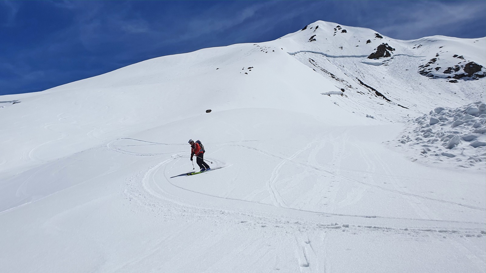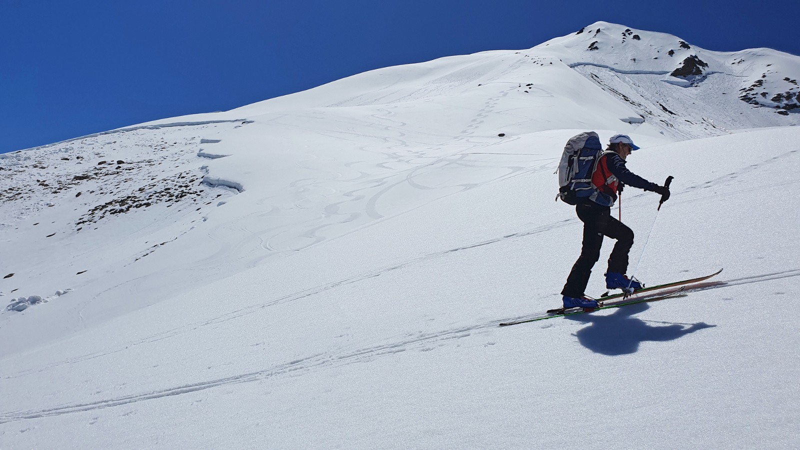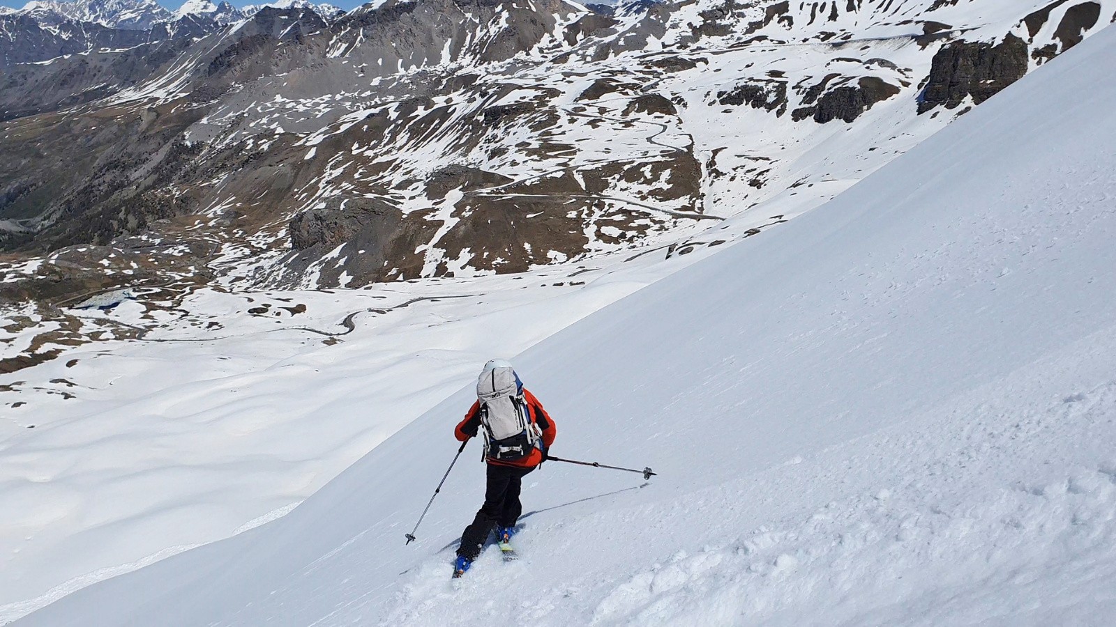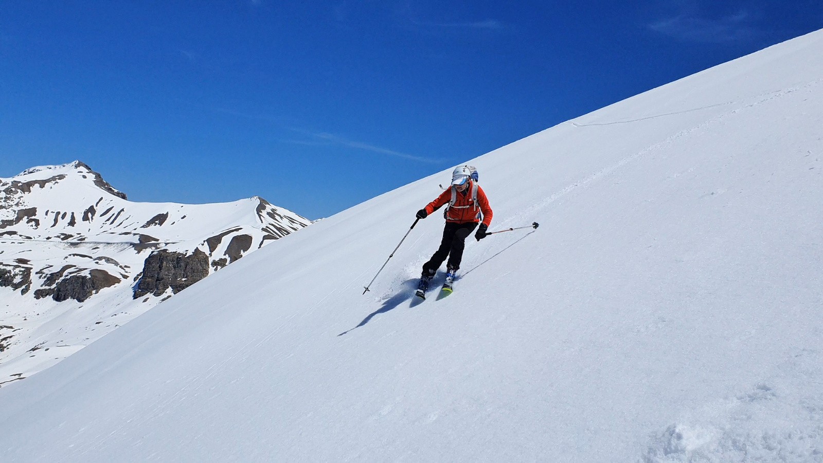 Pour ce clap de fin, on profite de l'ouverture du Col de la Bonette pour bénéficier du très bon enneigement sur les versants Nord de la Bonette, sans portage, comme souvent en fin de saison, secteur Cimes du Chevalier et du Caire Brun, aux pentes soutenues idéales pour le ski.